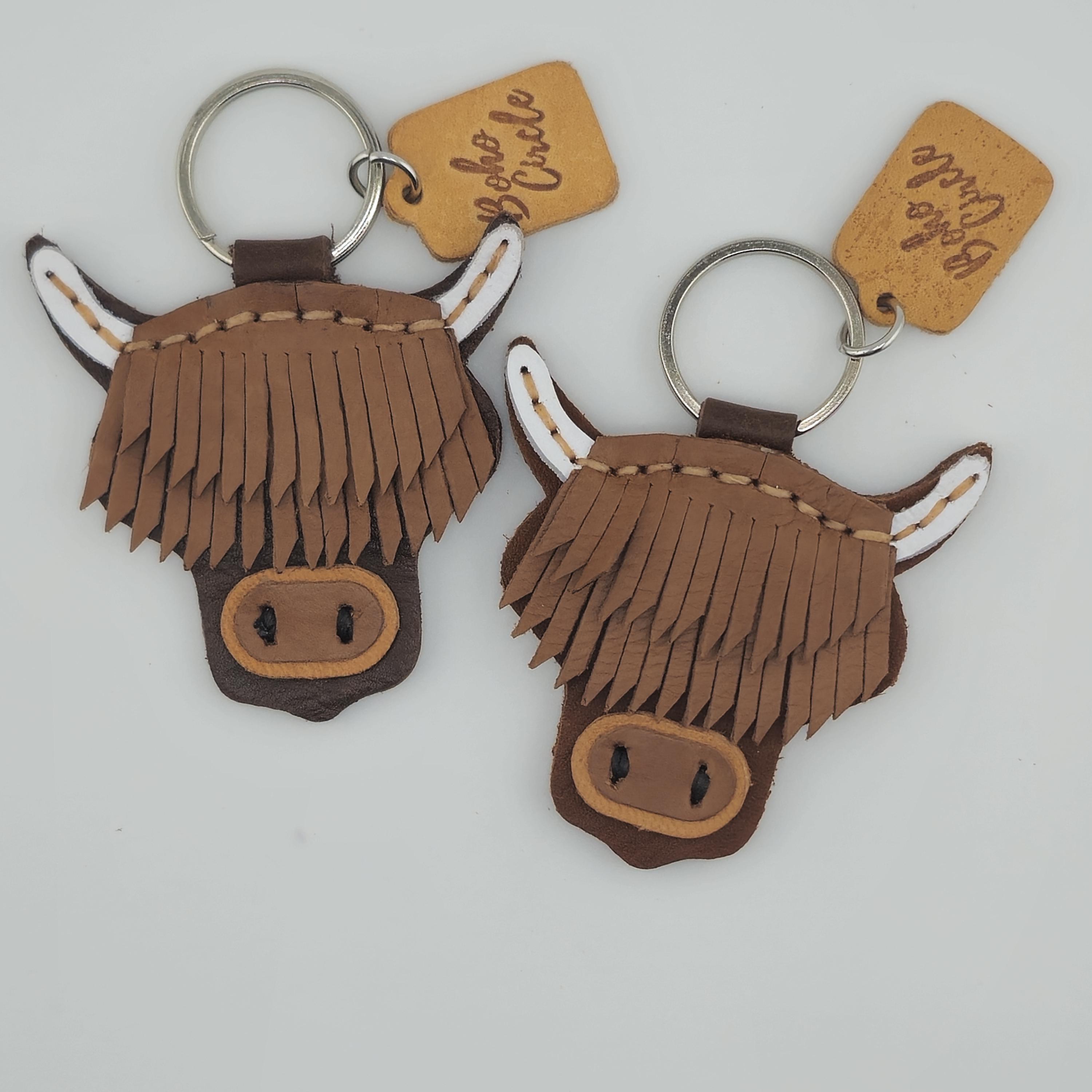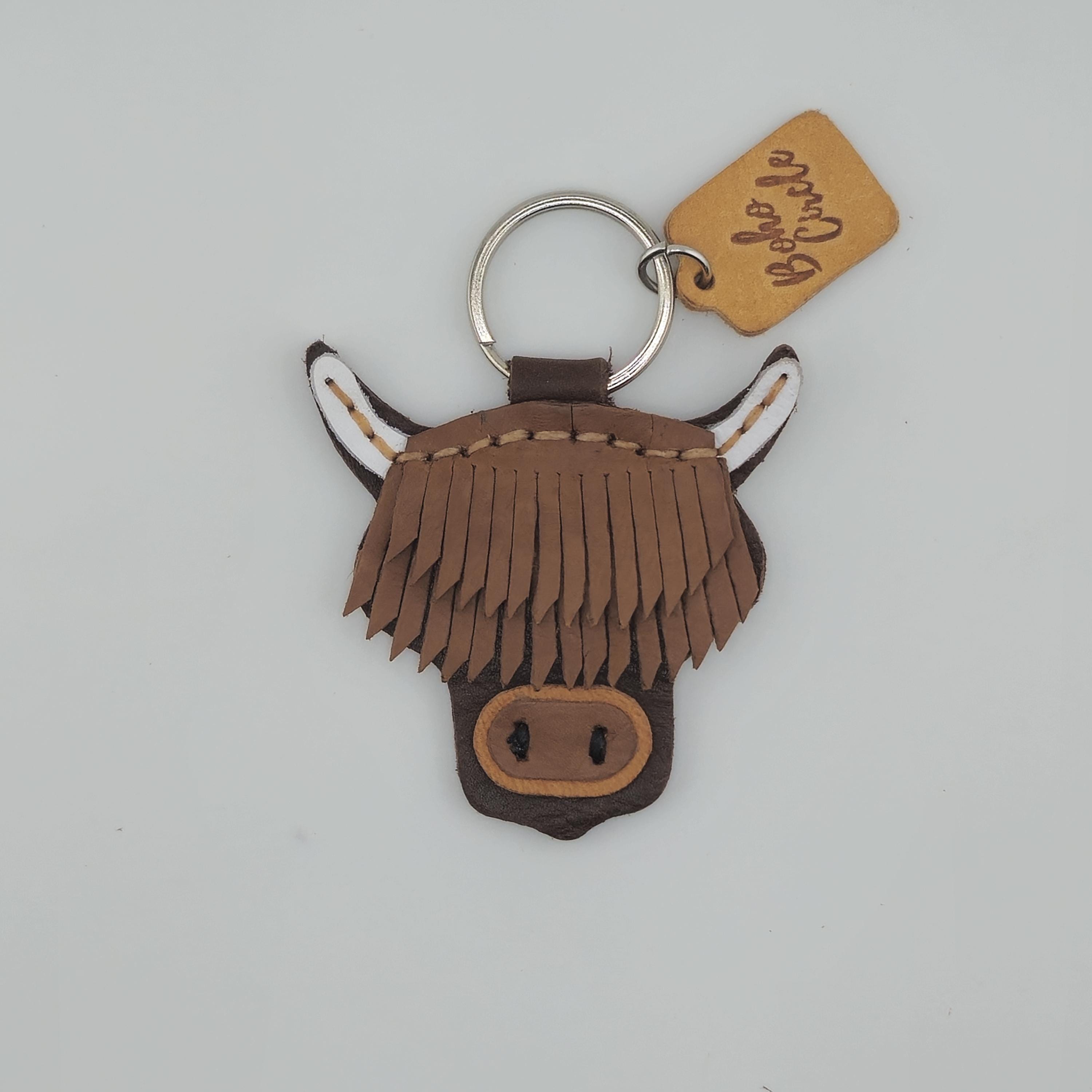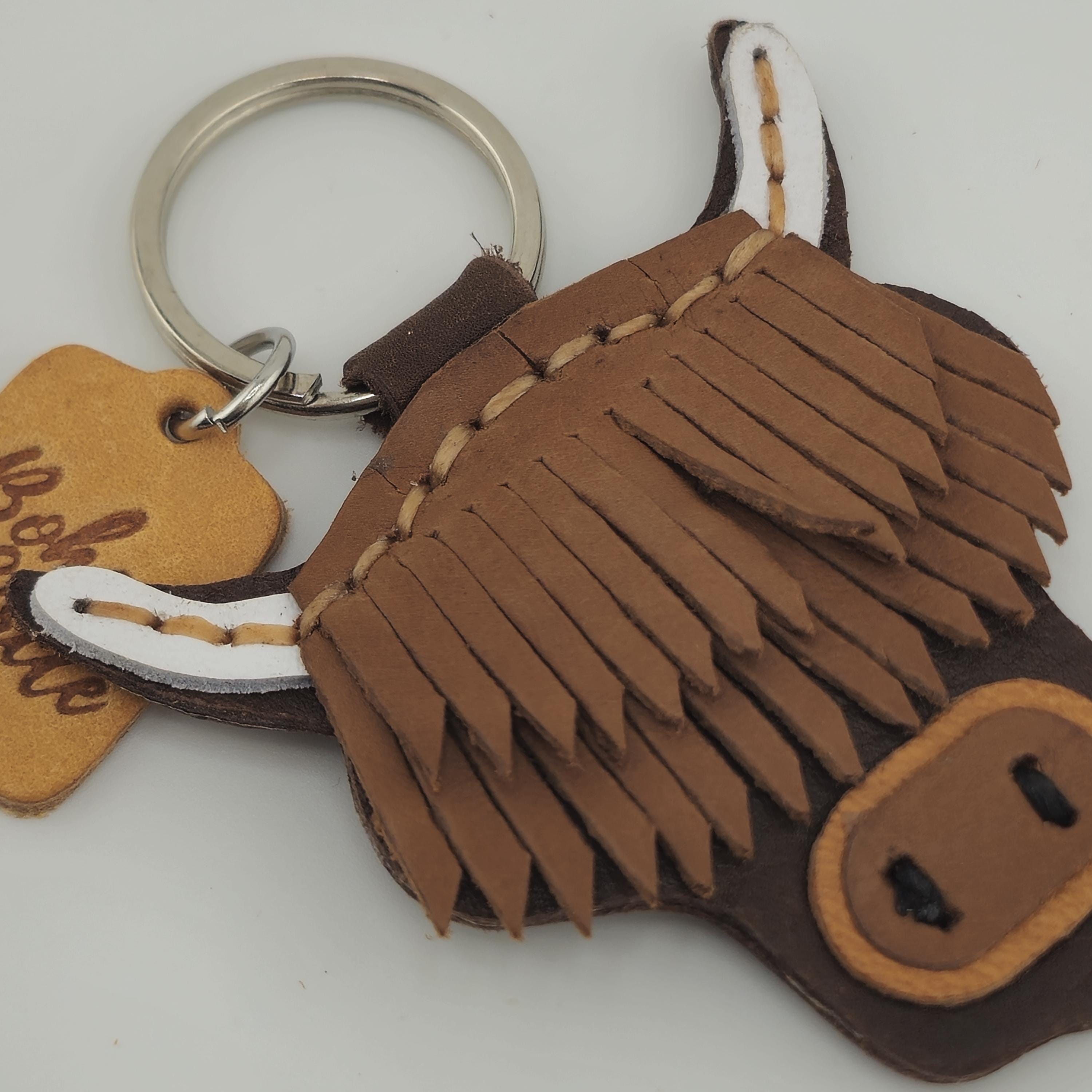 Bring a piece of the Scottish Highlands home with this incredibly detailed, handmade leather keychain. This charming accessory perfectly captures the iconic look of the Highland Cow (or 'Hairy Coo') with its famous long fringe and rugged horns.
