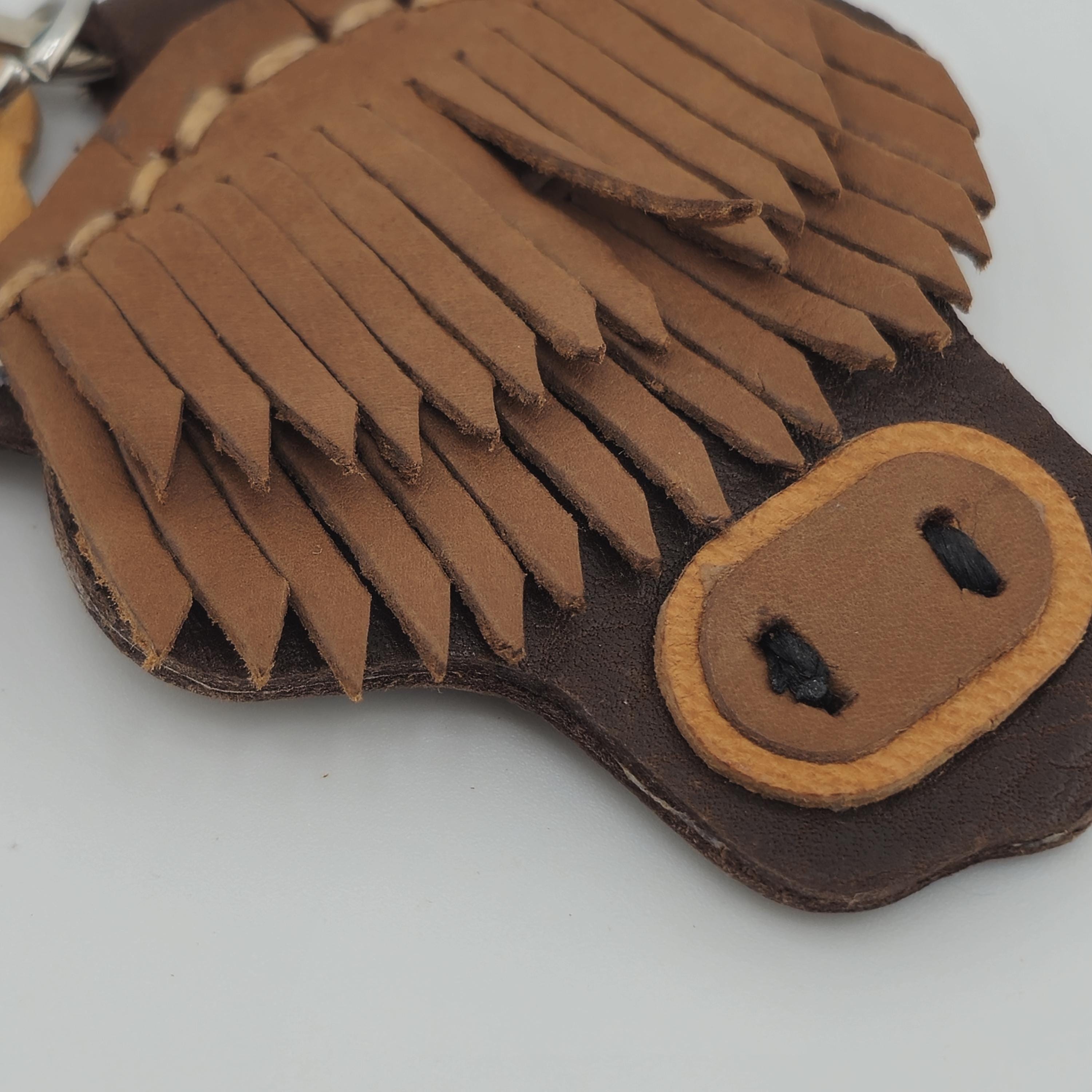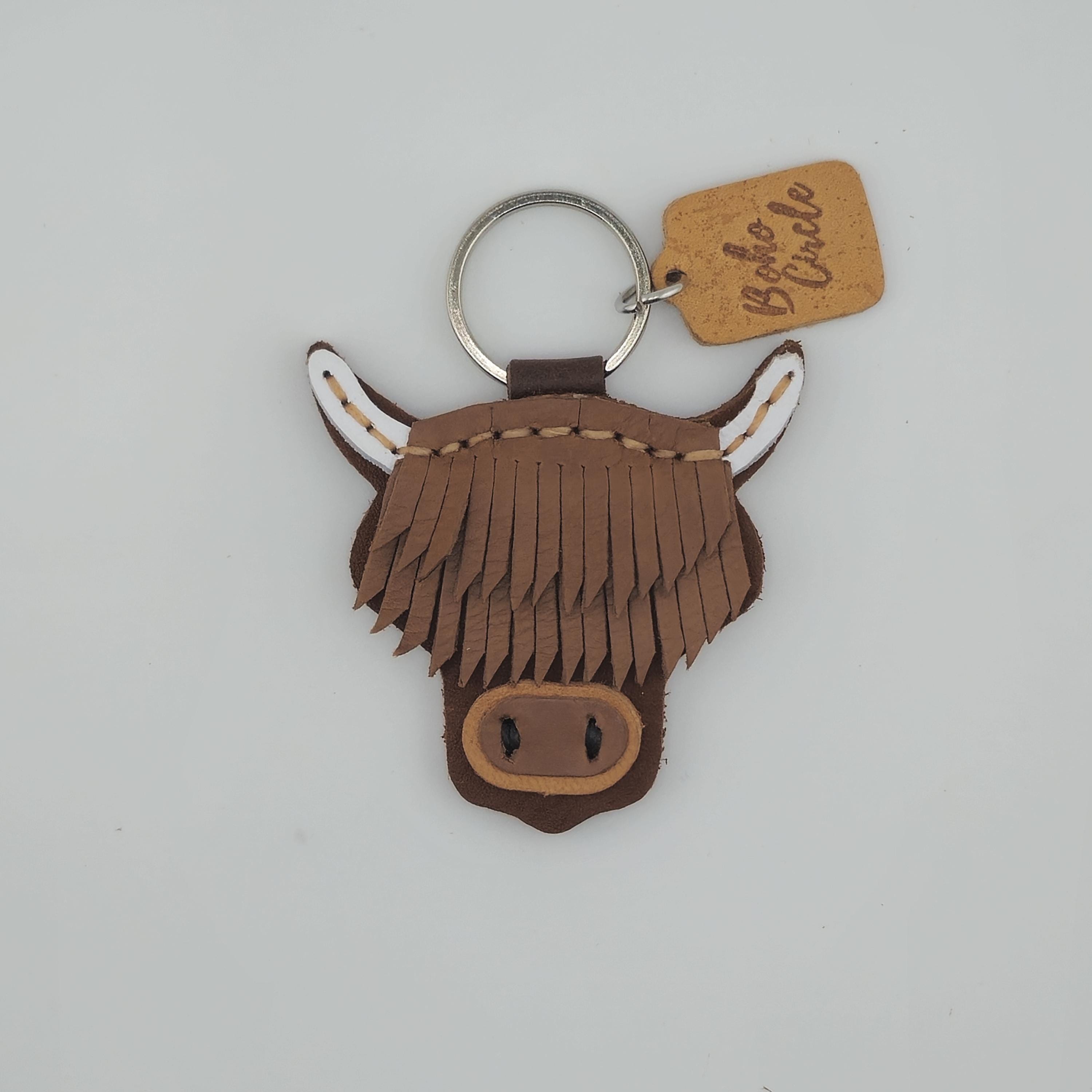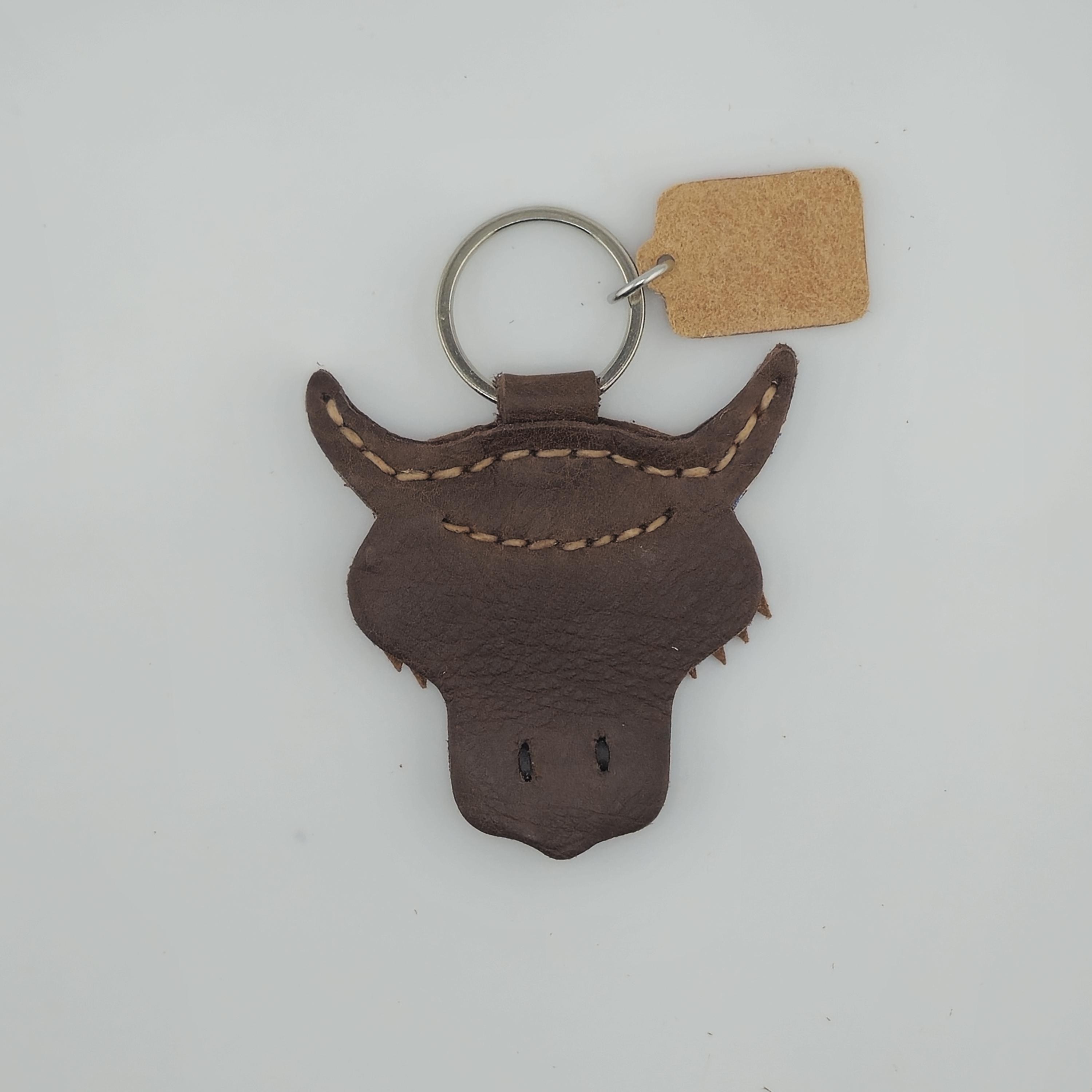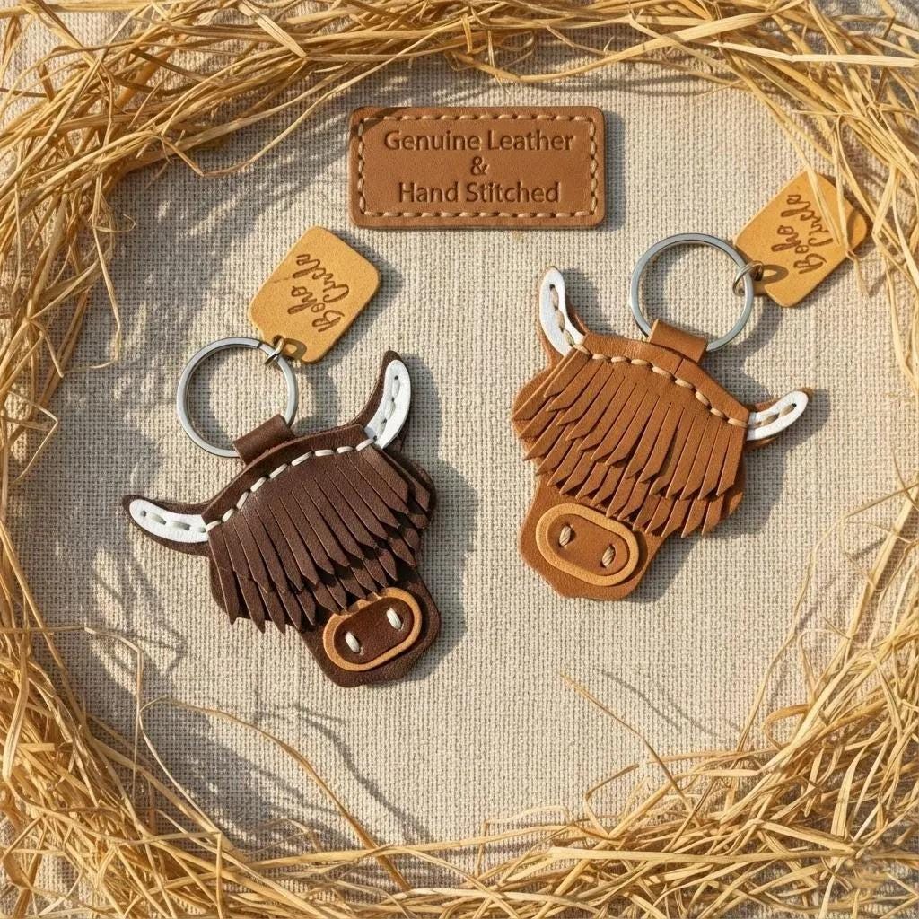 Bring a piece of the Scottish Highlands home with this incredibly detailed, handmade leather keychain. This charming accessory perfectly captures the iconic look of the Highland Cow (or 'Hairy Coo') with its famous long fringe and rugged horns.