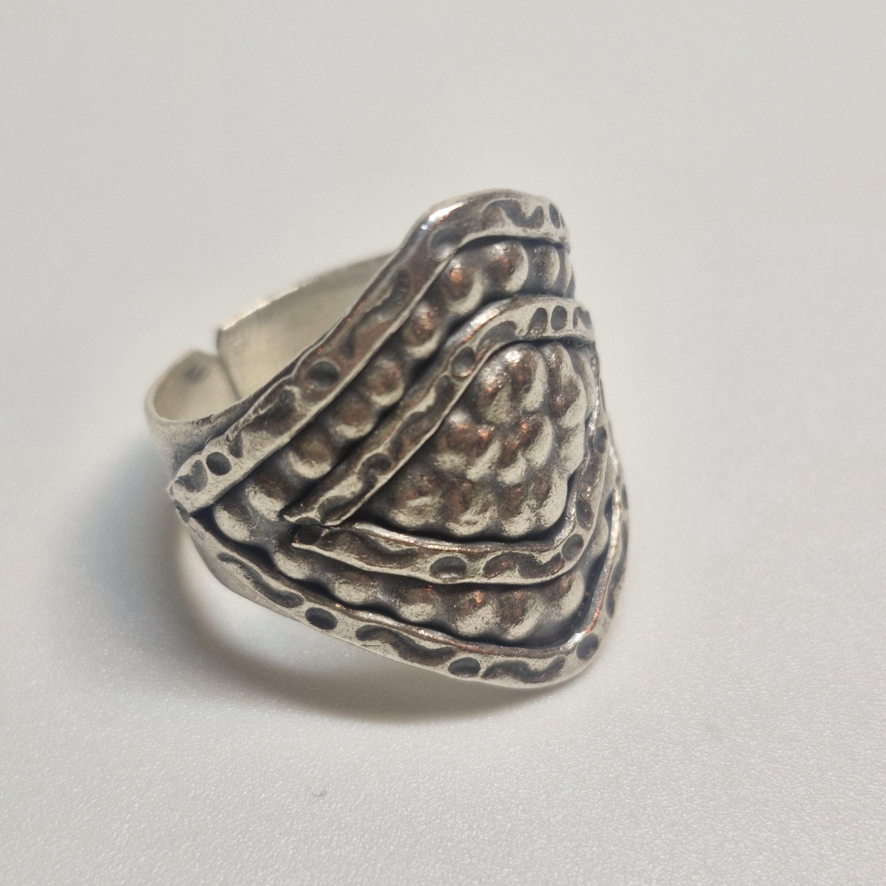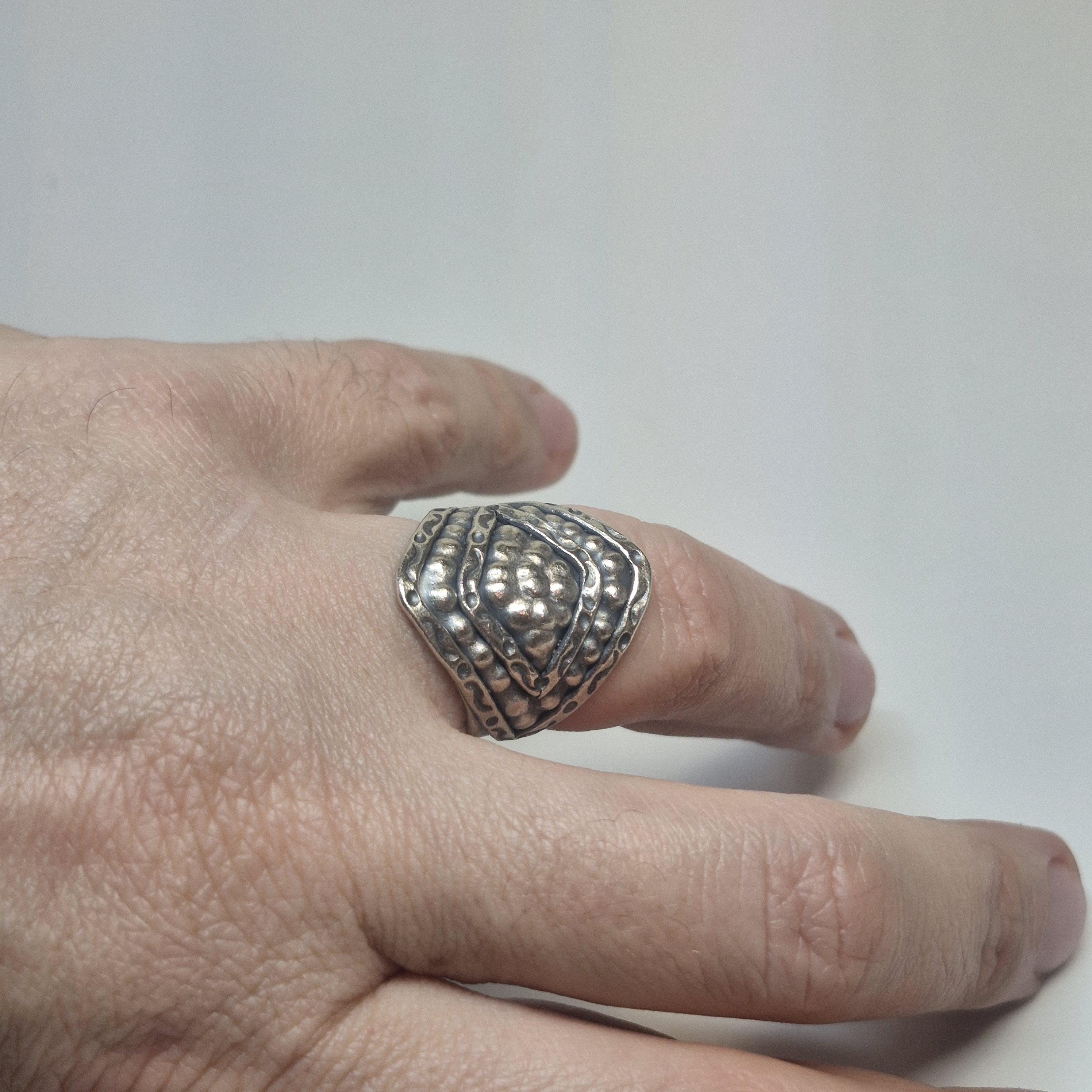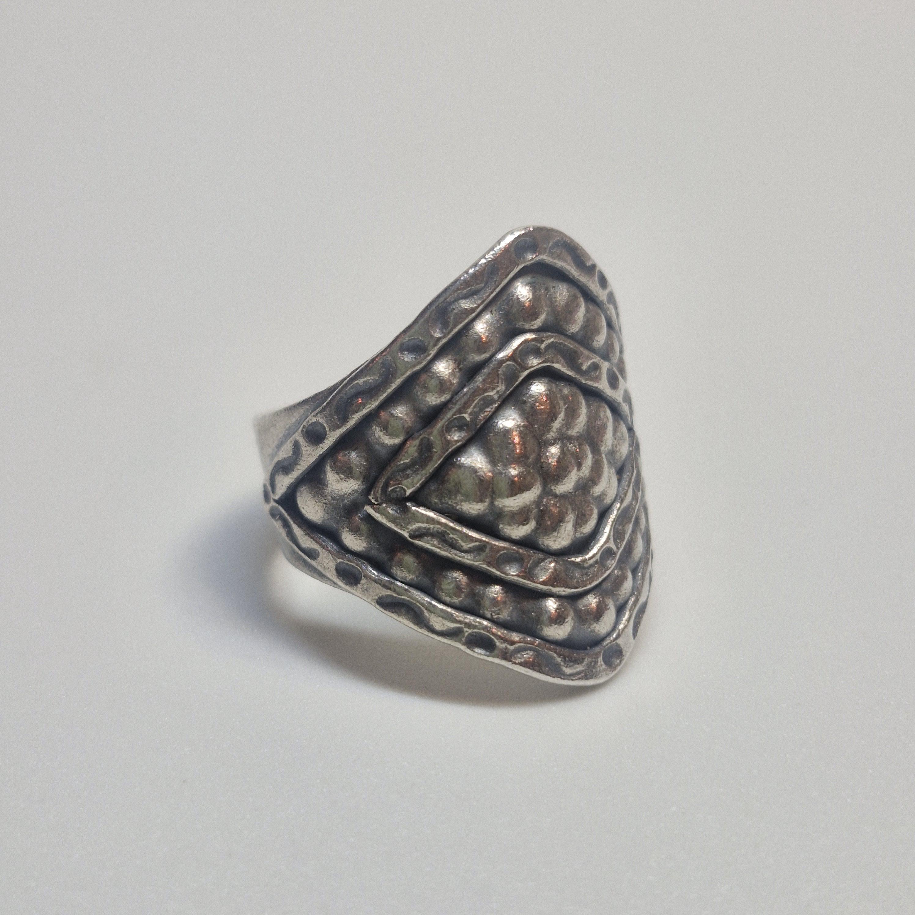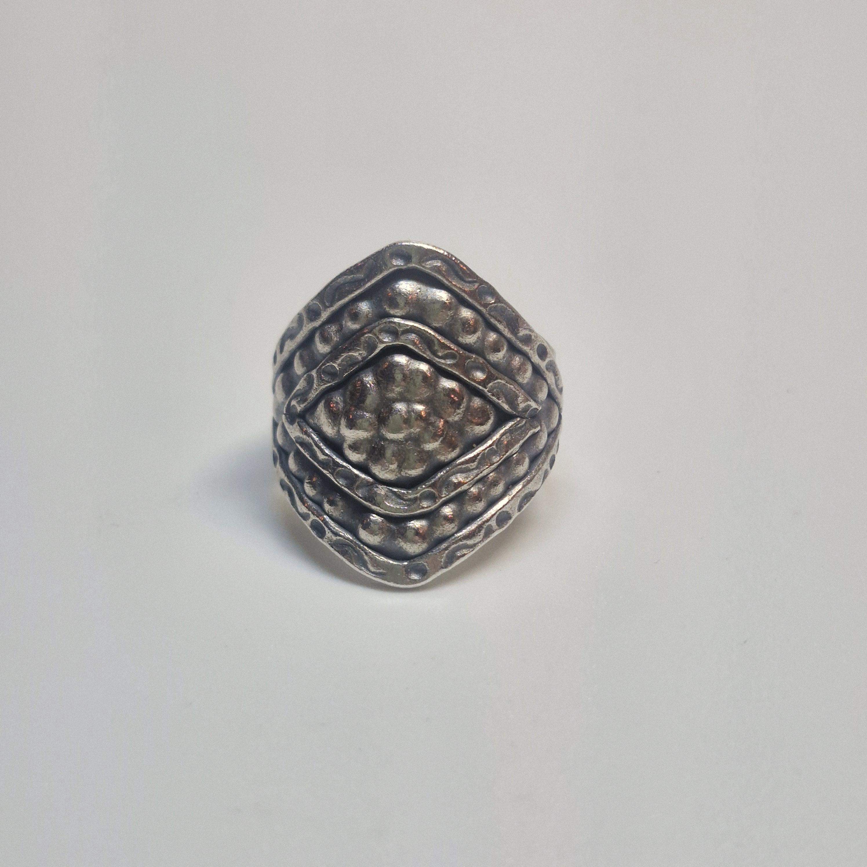 The Design Expertly hand-forged with an intricate, tactile 'bubble' and wave motif, this piece features a prominent diamond-shaped shield that sits beautifully on the finger. The oxidised finish highlights the depth of the metalwork, giving it an authentic, 'found' treasure aesthetic that pairs perfectly with linen layers or vintage denim.