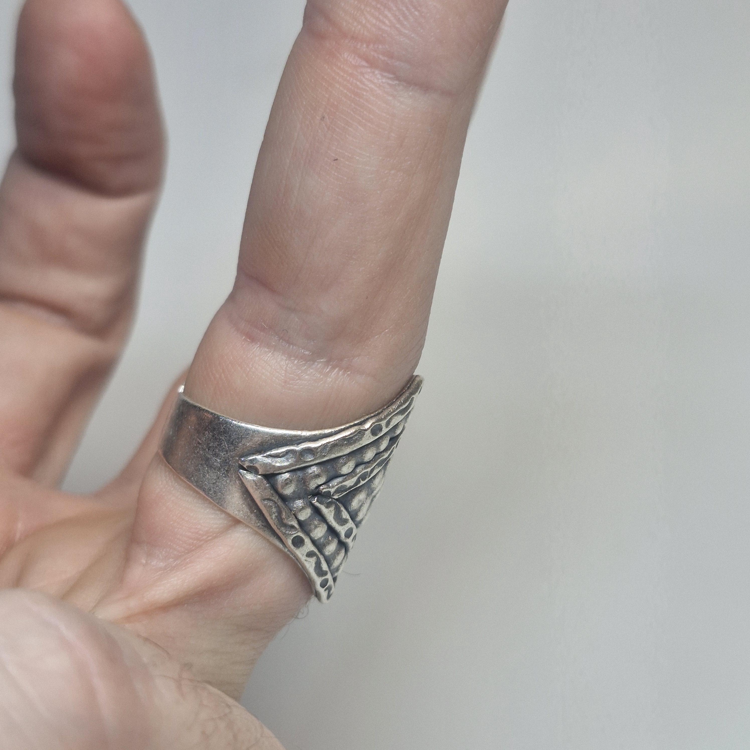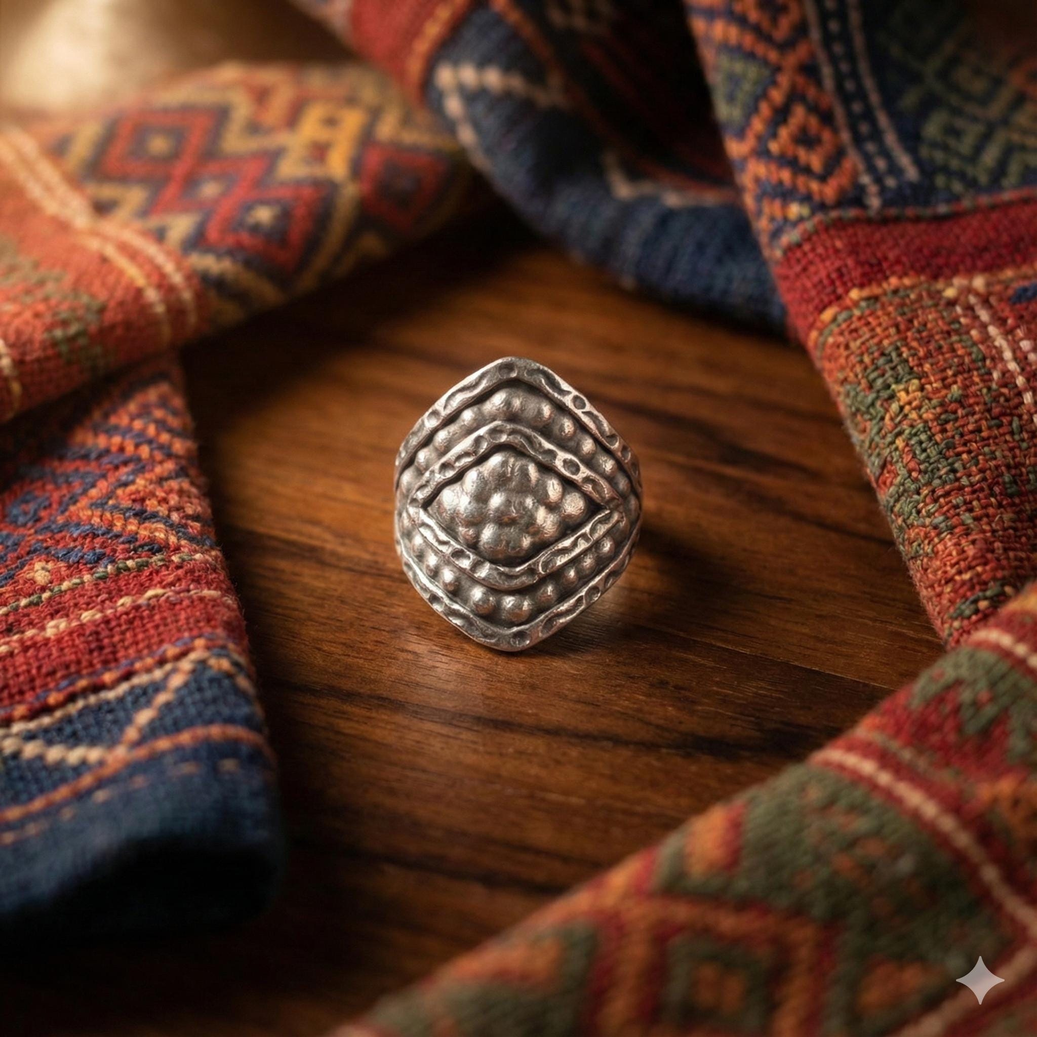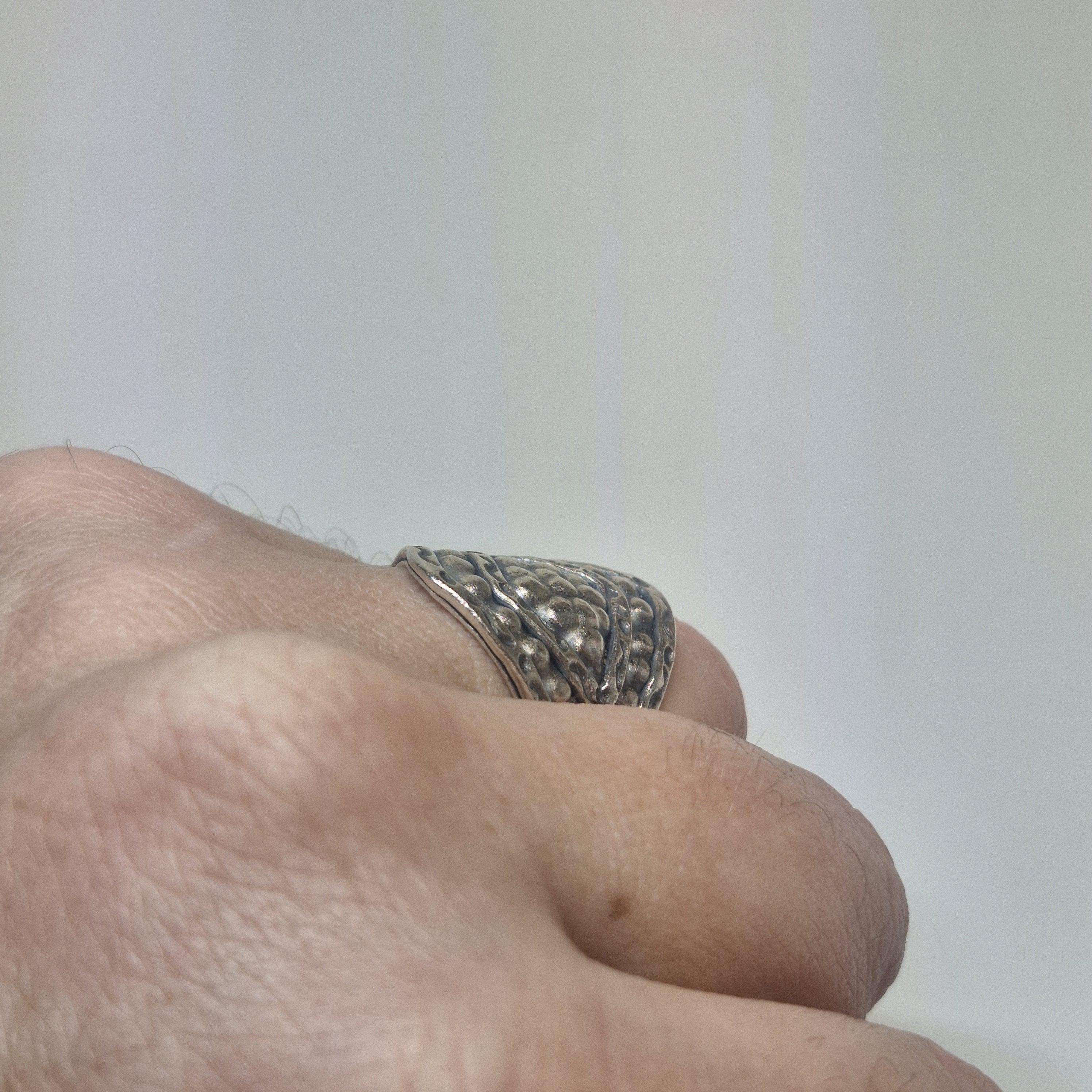 The Design Expertly hand-forged with an intricate, tactile 'bubble' and wave motif, this piece features a prominent diamond-shaped shield that sits beautifully on the finger. The oxidised finish highlights the depth of the metalwork, giving it an authentic, 'found' treasure aesthetic that pairs perfectly with linen layers or vintage denim.