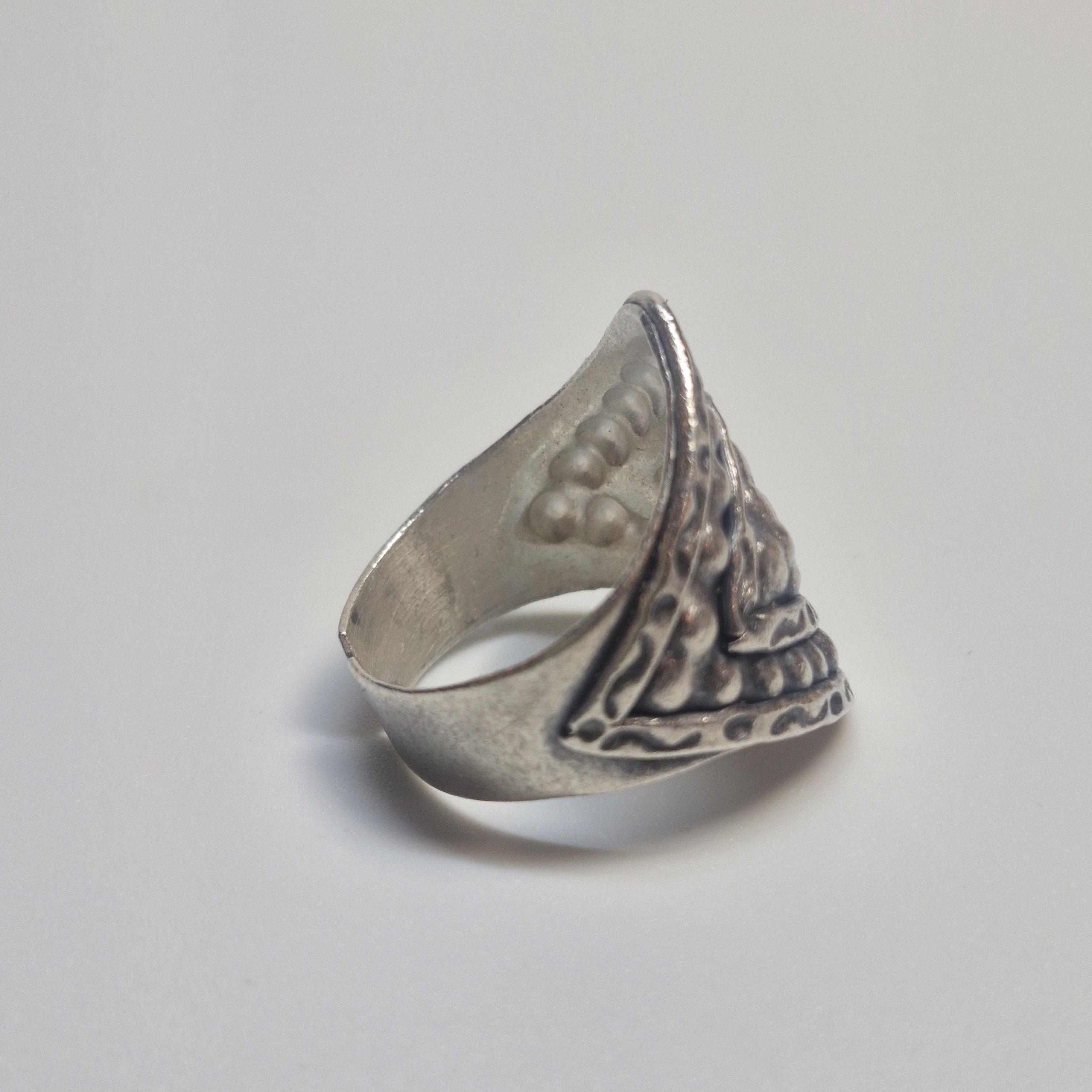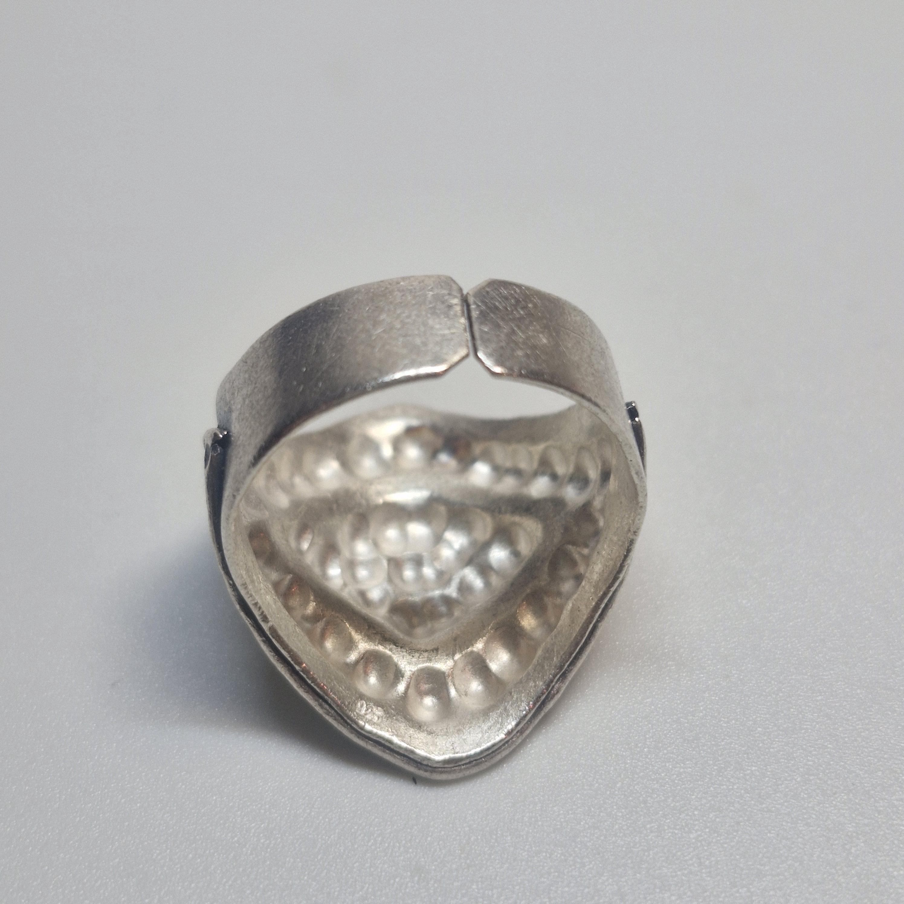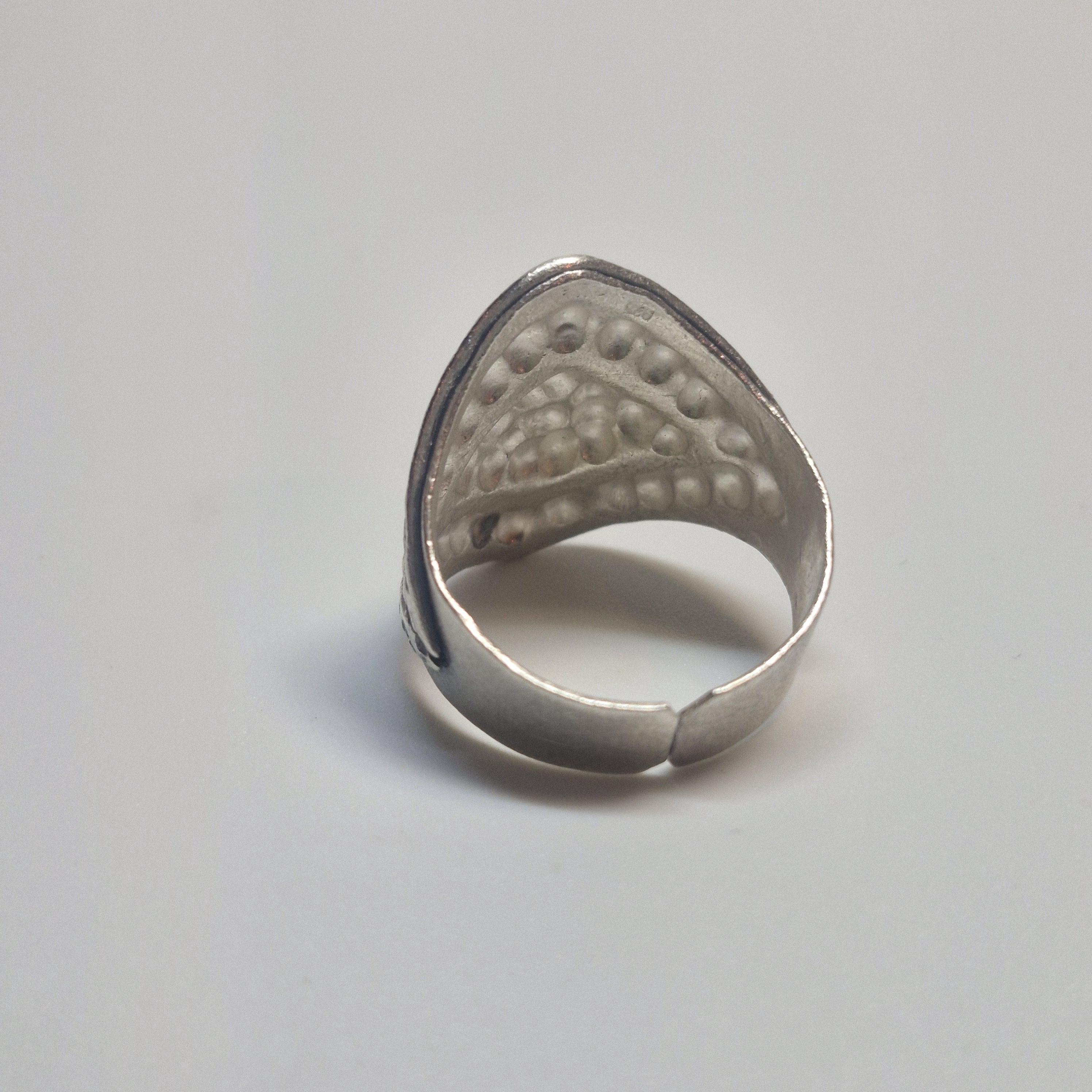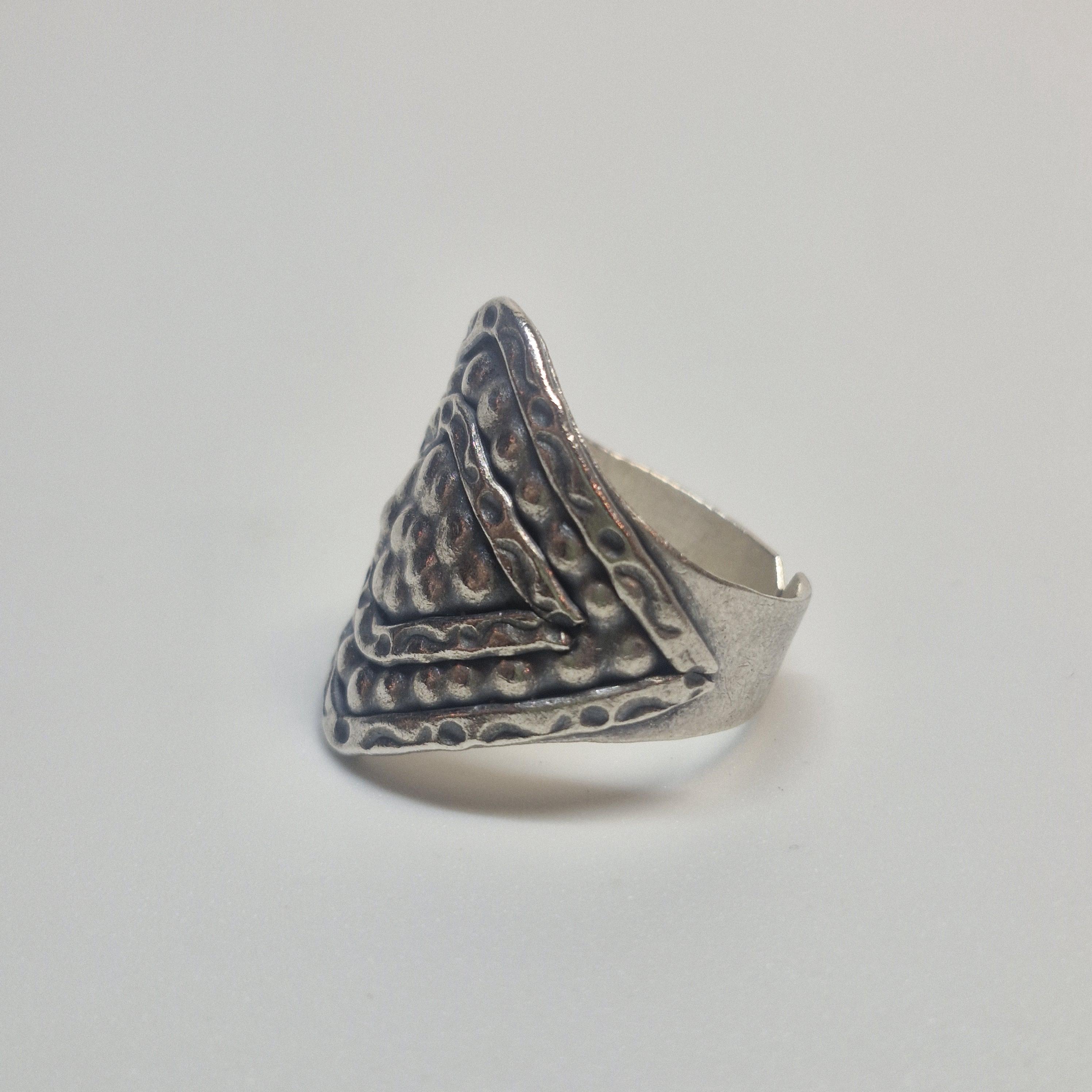 The Design Expertly hand-forged with an intricate, tactile 'bubble' and wave motif, this piece features a prominent diamond-shaped shield that sits beautifully on the finger. The oxidised finish highlights the depth of the metalwork, giving it an authentic, 'found' treasure aesthetic that pairs perfectly with linen layers or vintage denim.