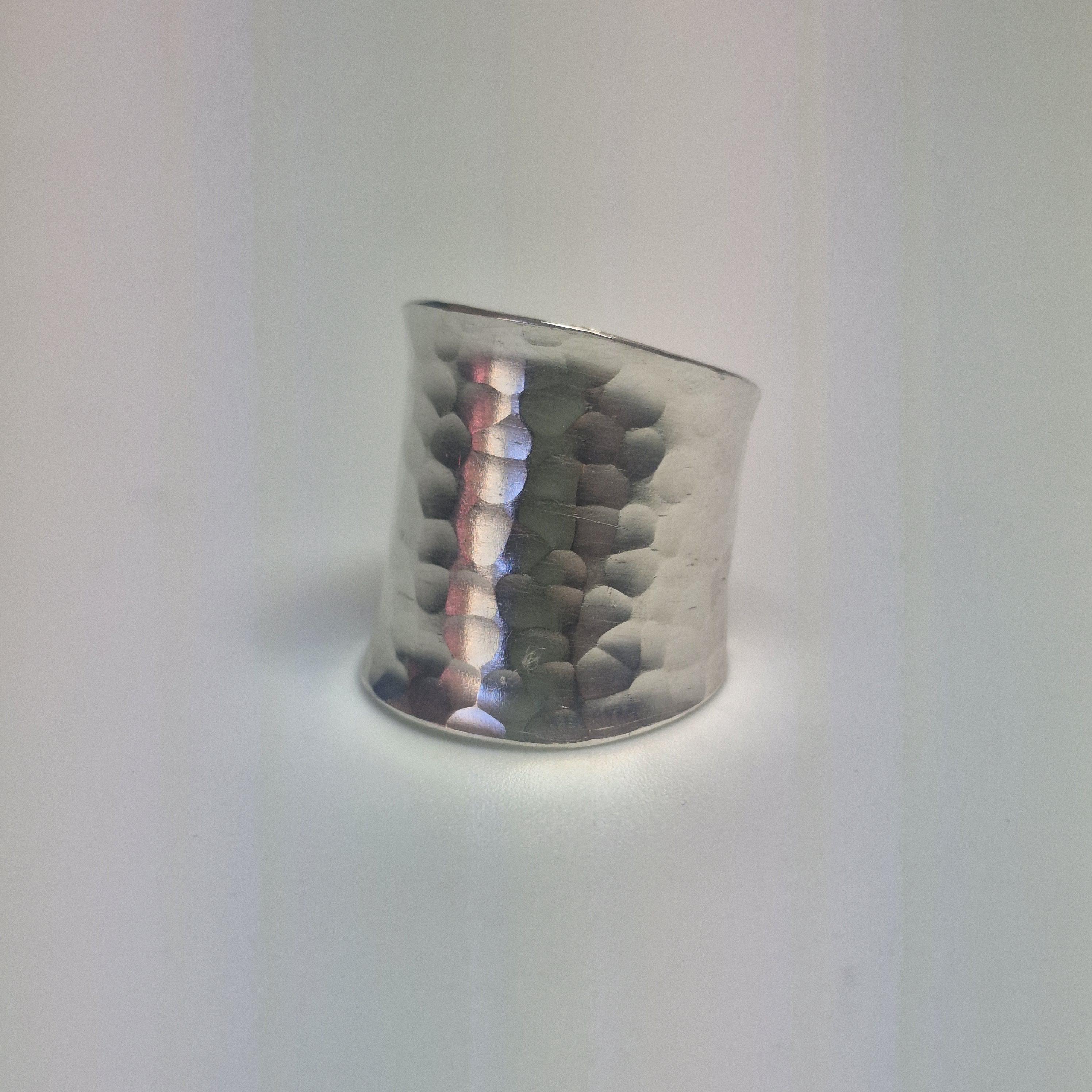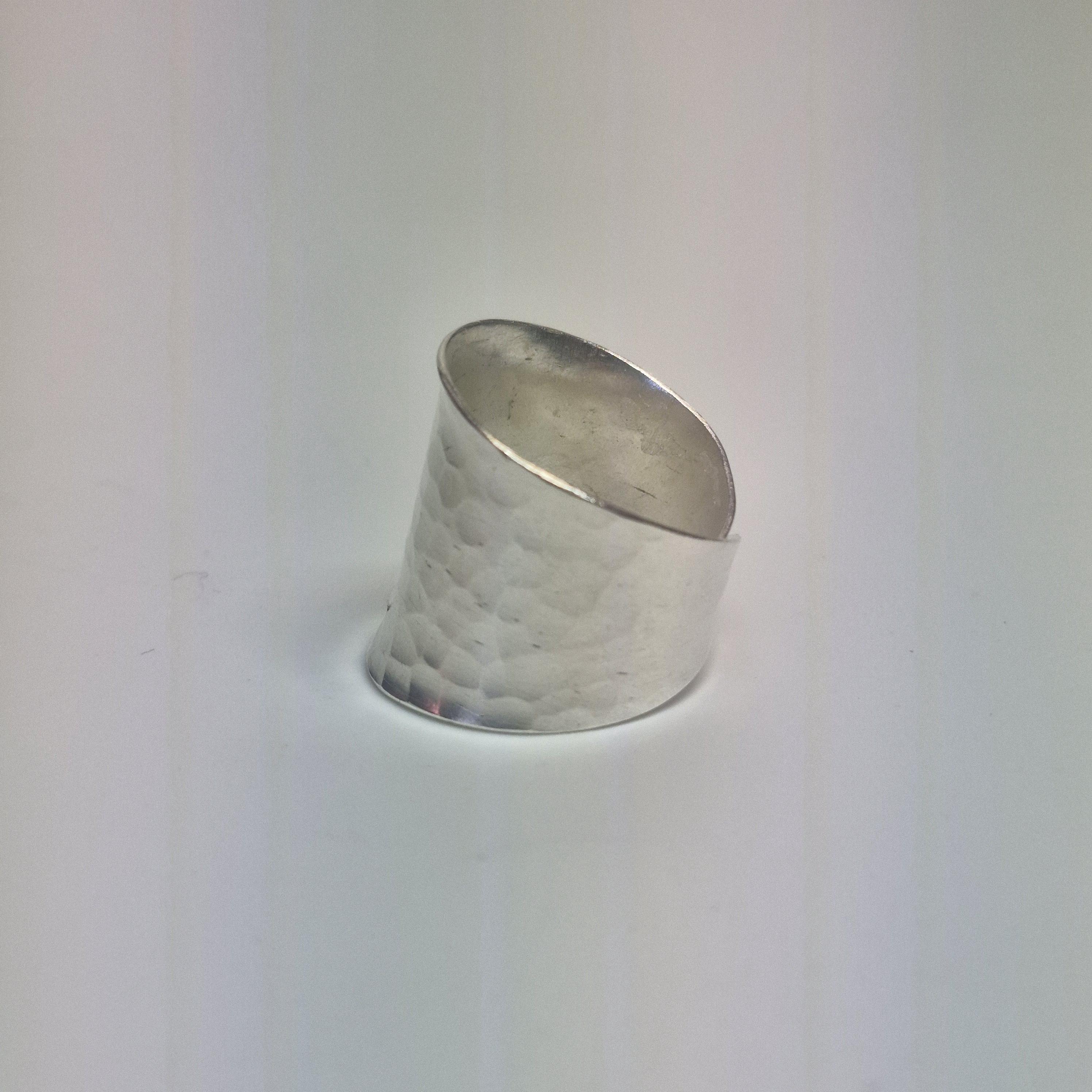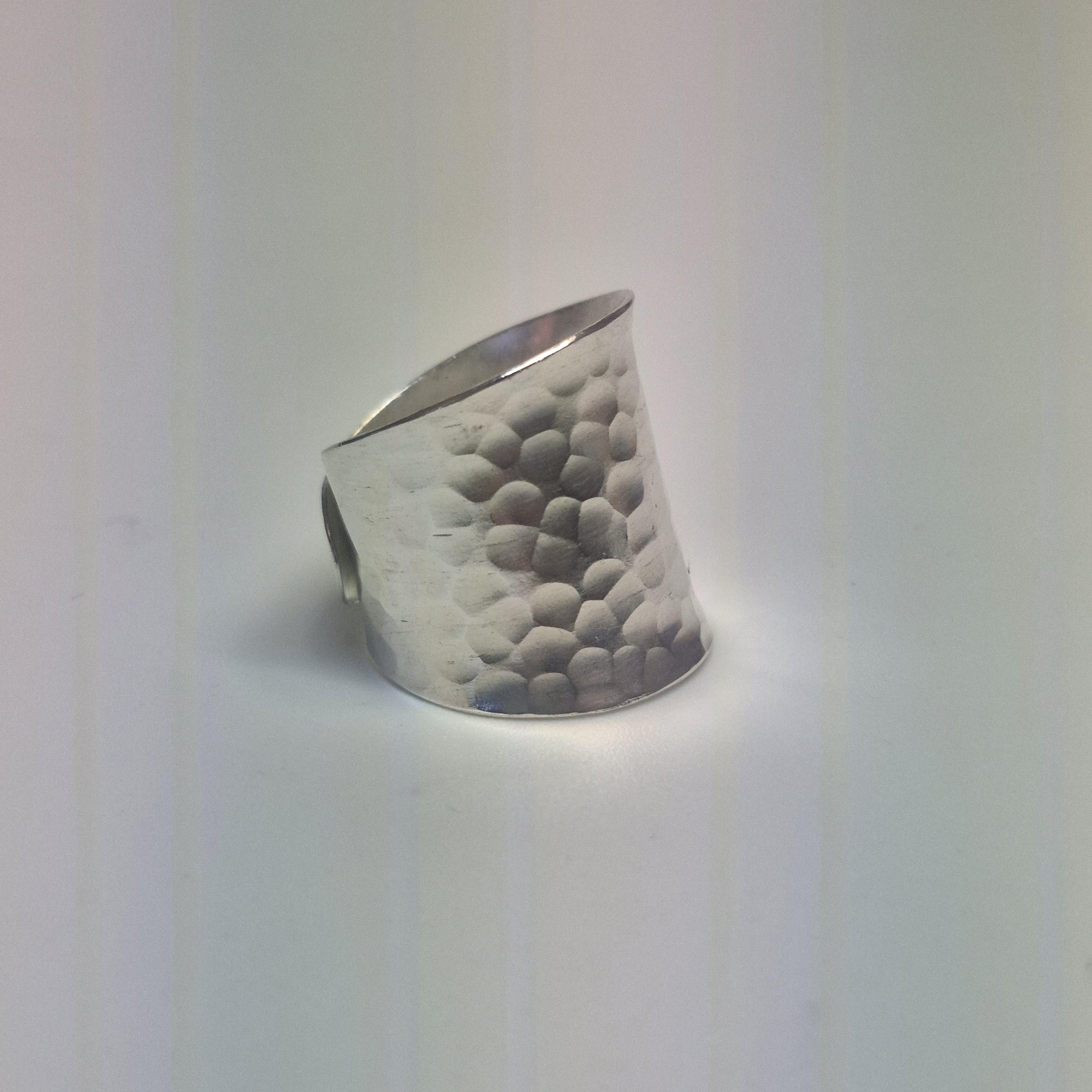 Hand-forged by skilled artisans, this wide-band wrap ring features a distinct hammered texture that reflects light beautifully from every angle. Crafted from fine handmade hill tribe silver, this piece boasts a 96-99% pure silver precious metal content, offering a warmer, more lustrous glow than standard sterling silver.
