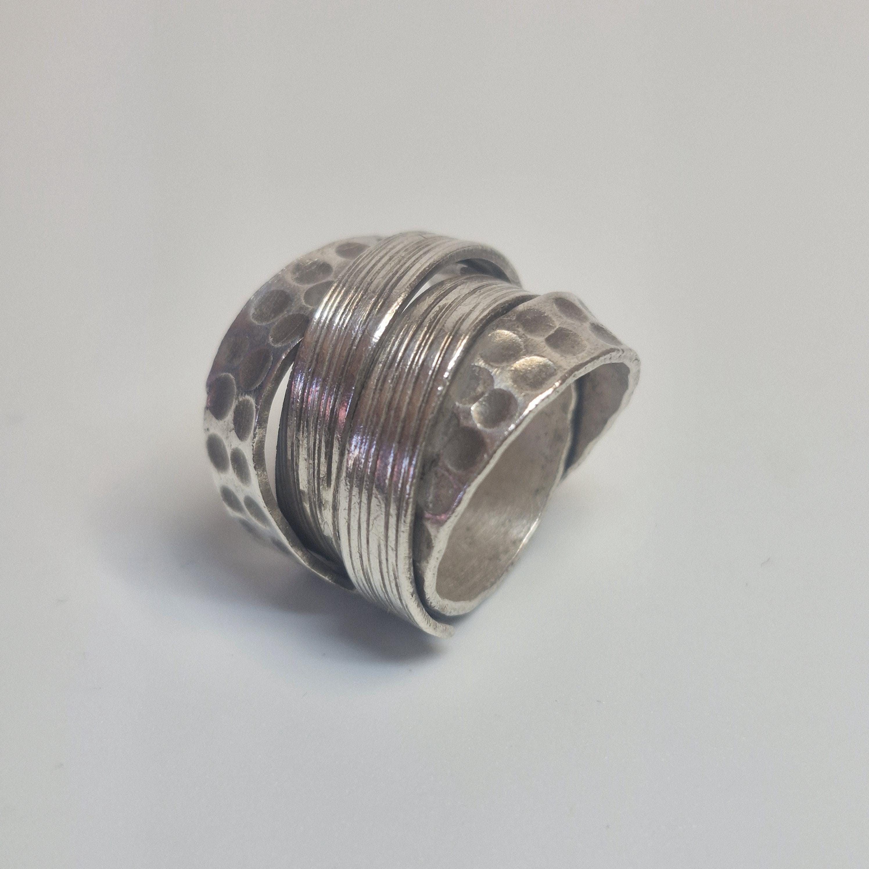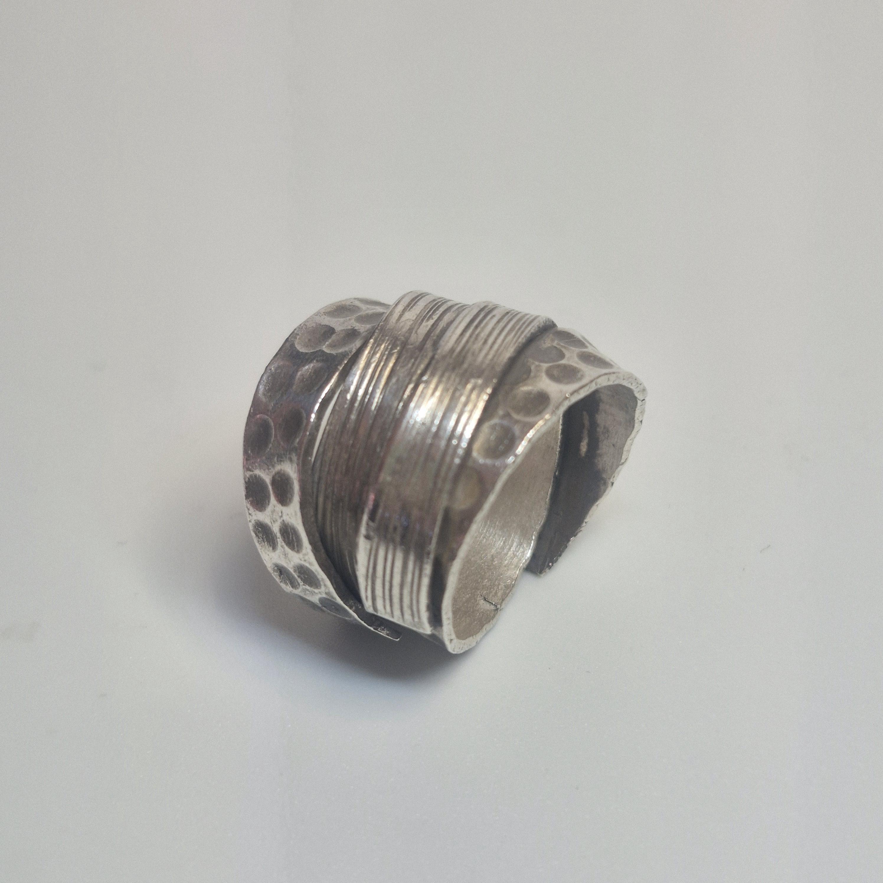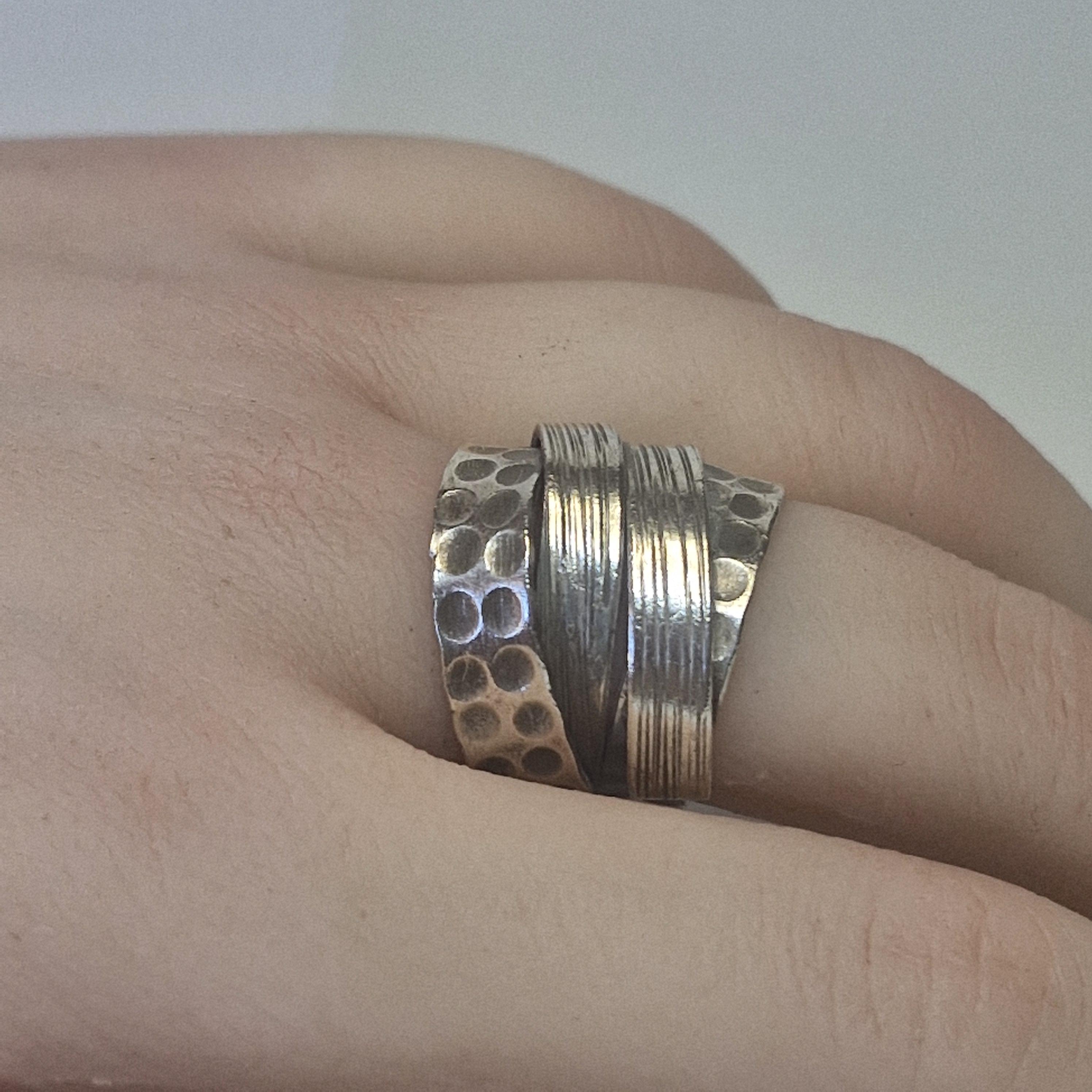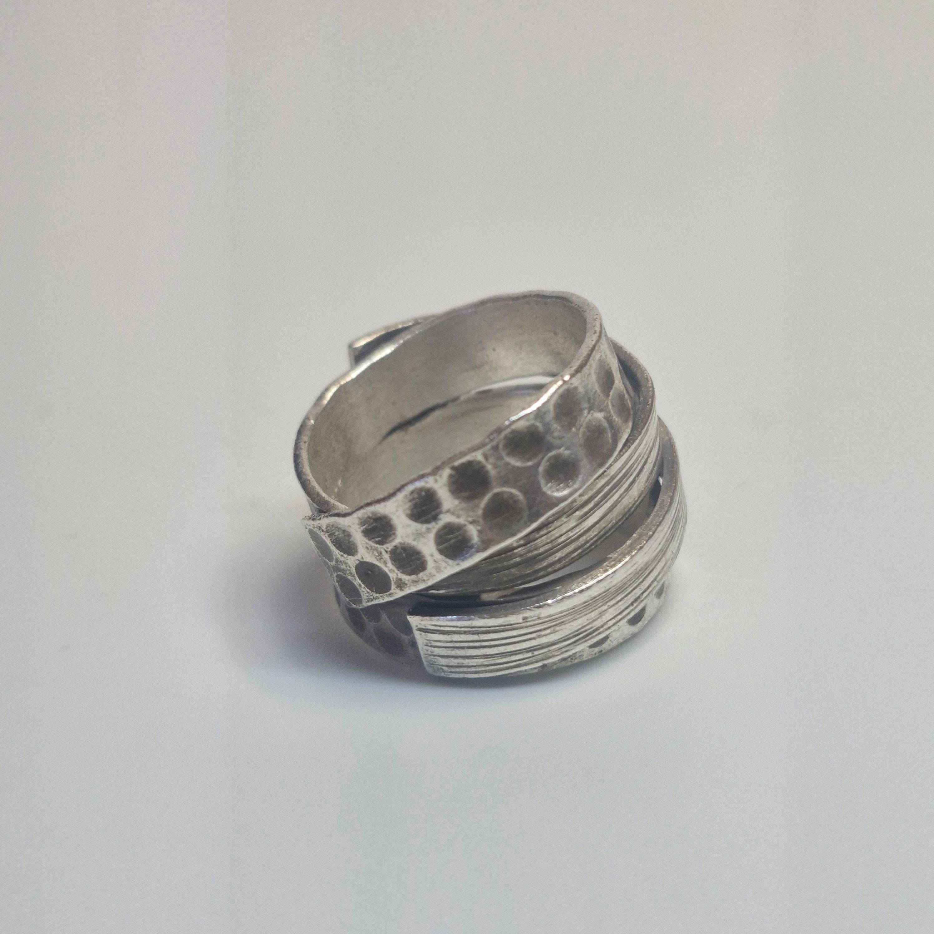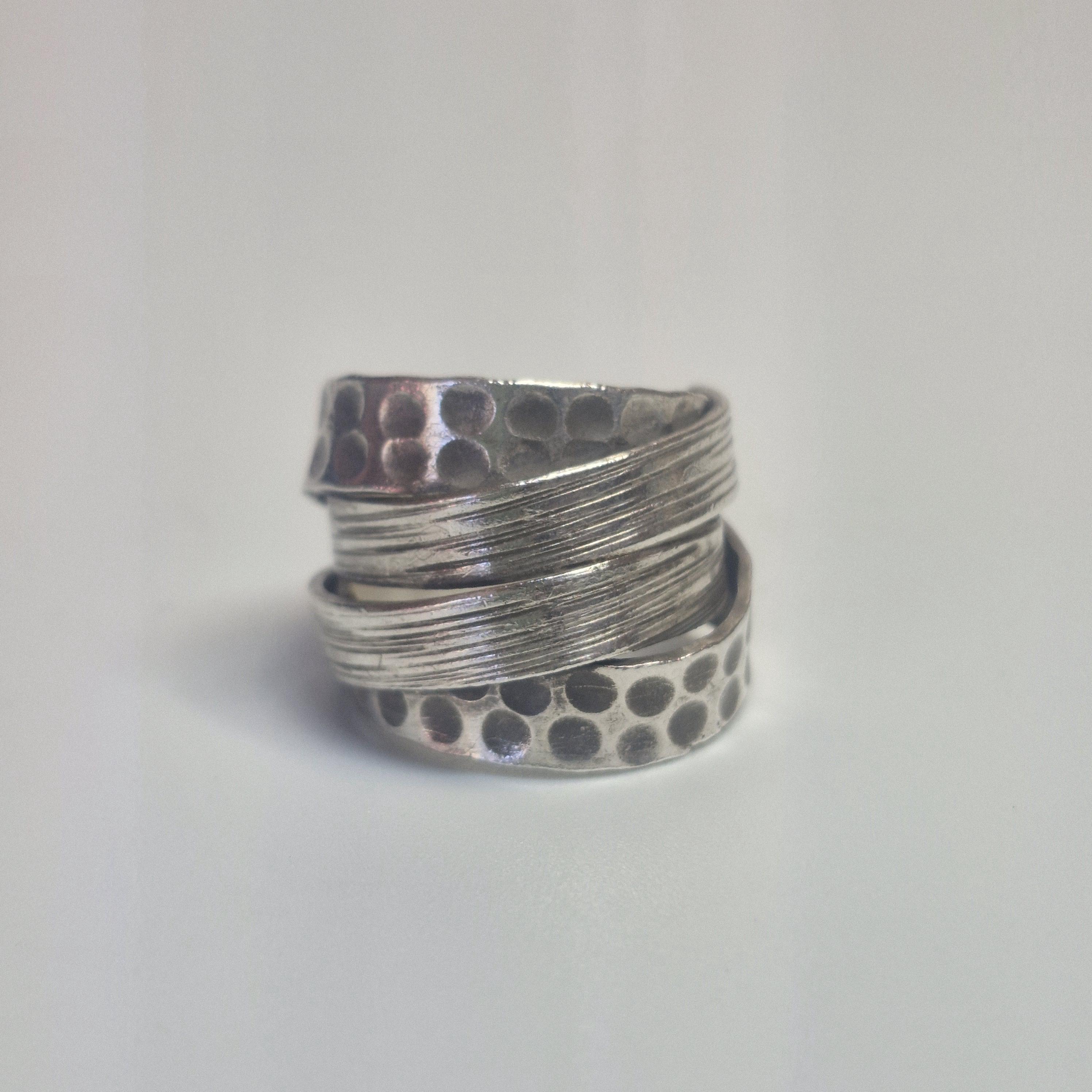 Adorn your hands with a piece that tells a story of craftsmanship and free-spirited wandering. This hand-forged wrap ring features a striking combination of deeply hammered textures and delicate linear grooves, creating a multi-strand illusion that wraps effortlessly around your finger.