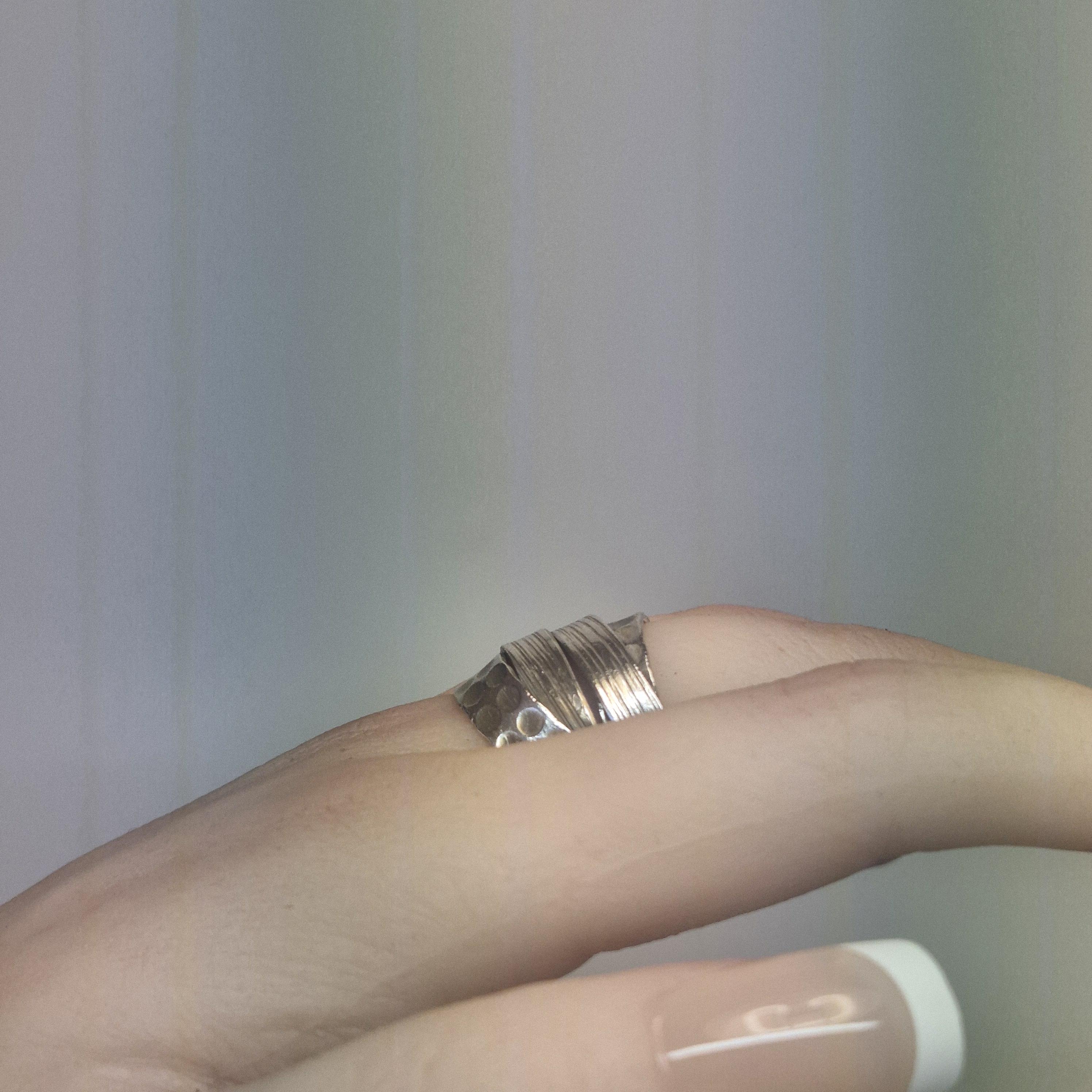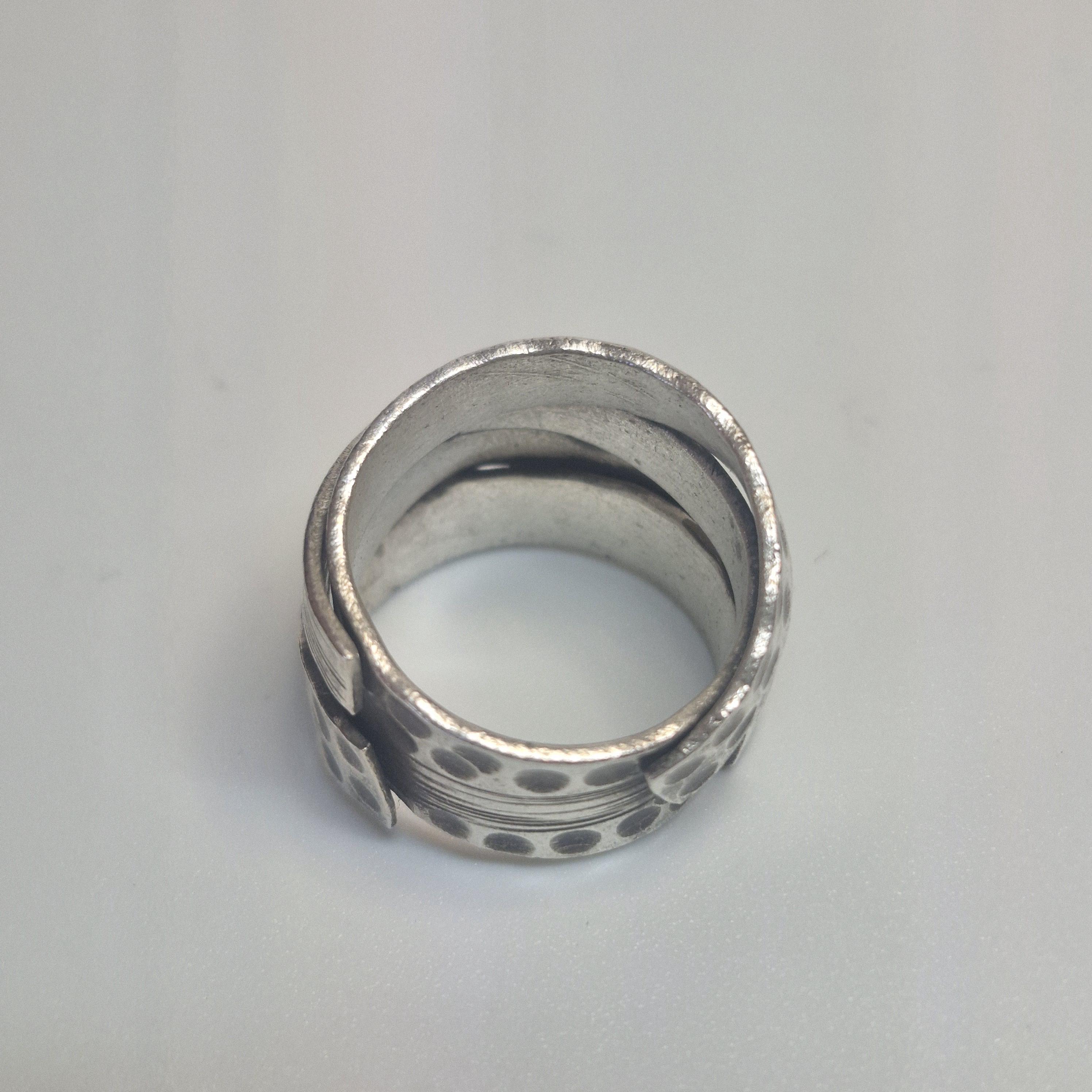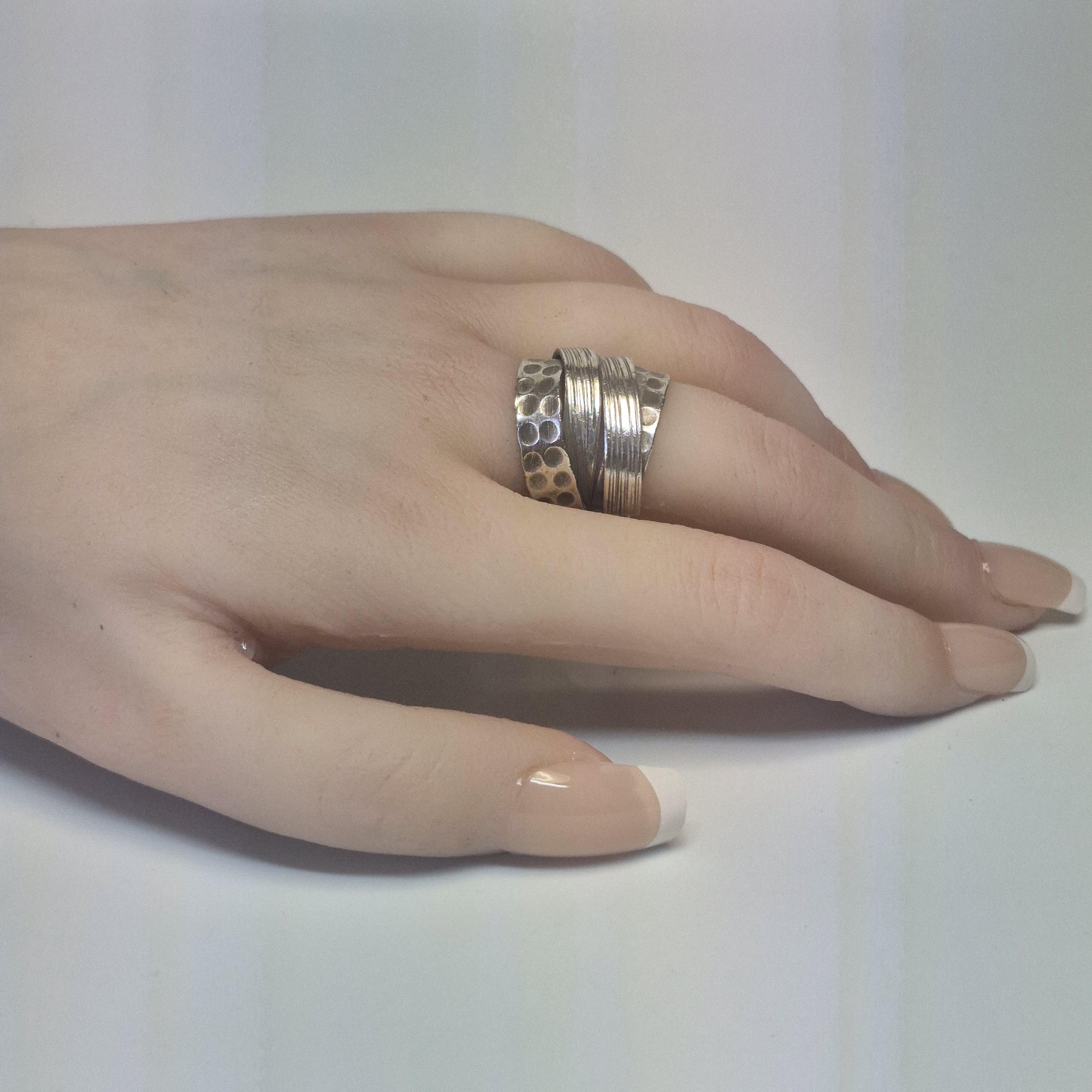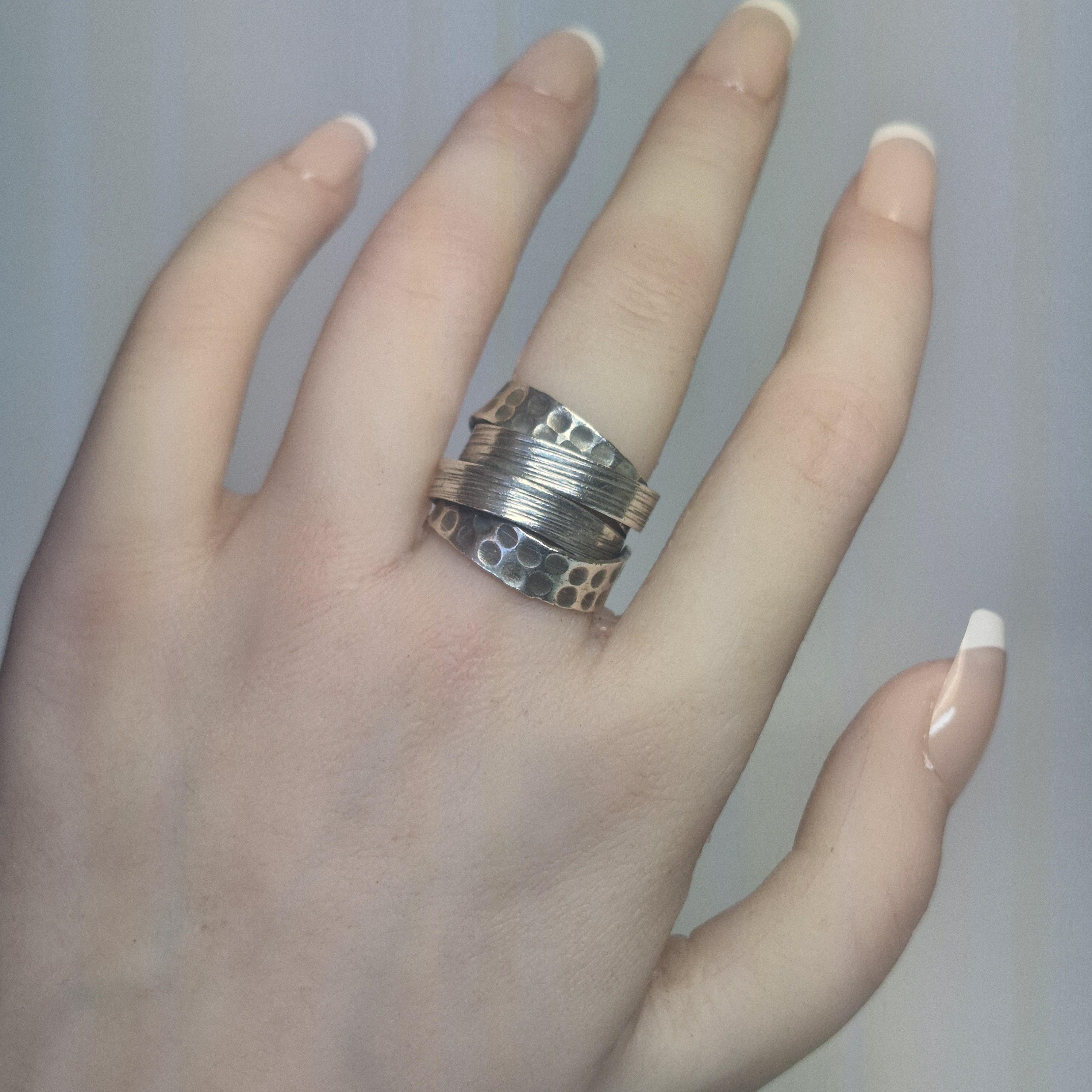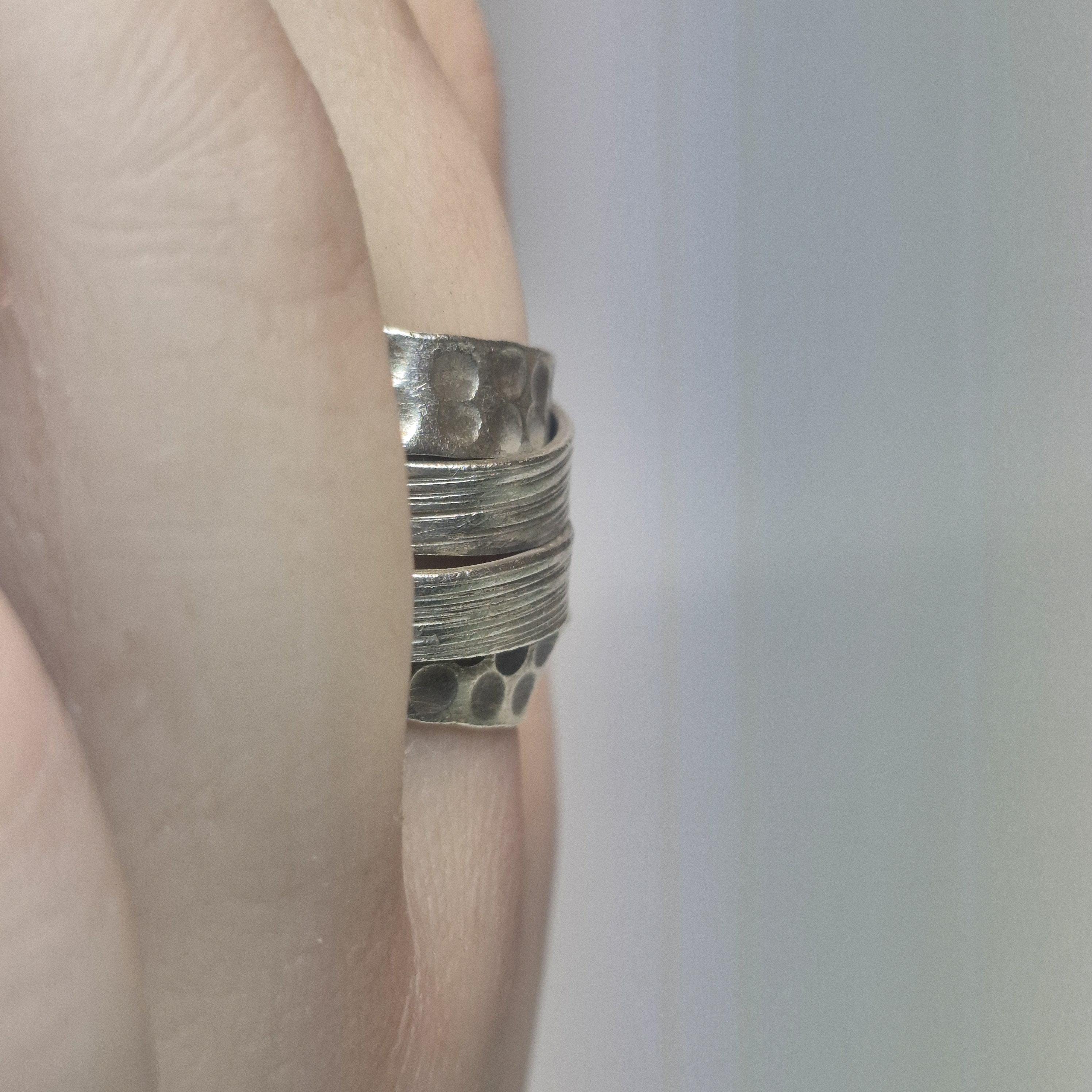 Adorn your hands with a piece that tells a story of craftsmanship and free-spirited wandering. This hand-forged wrap ring features a striking combination of deeply hammered textures and delicate linear grooves, creating a multi-strand illusion that wraps effortlessly around your finger.