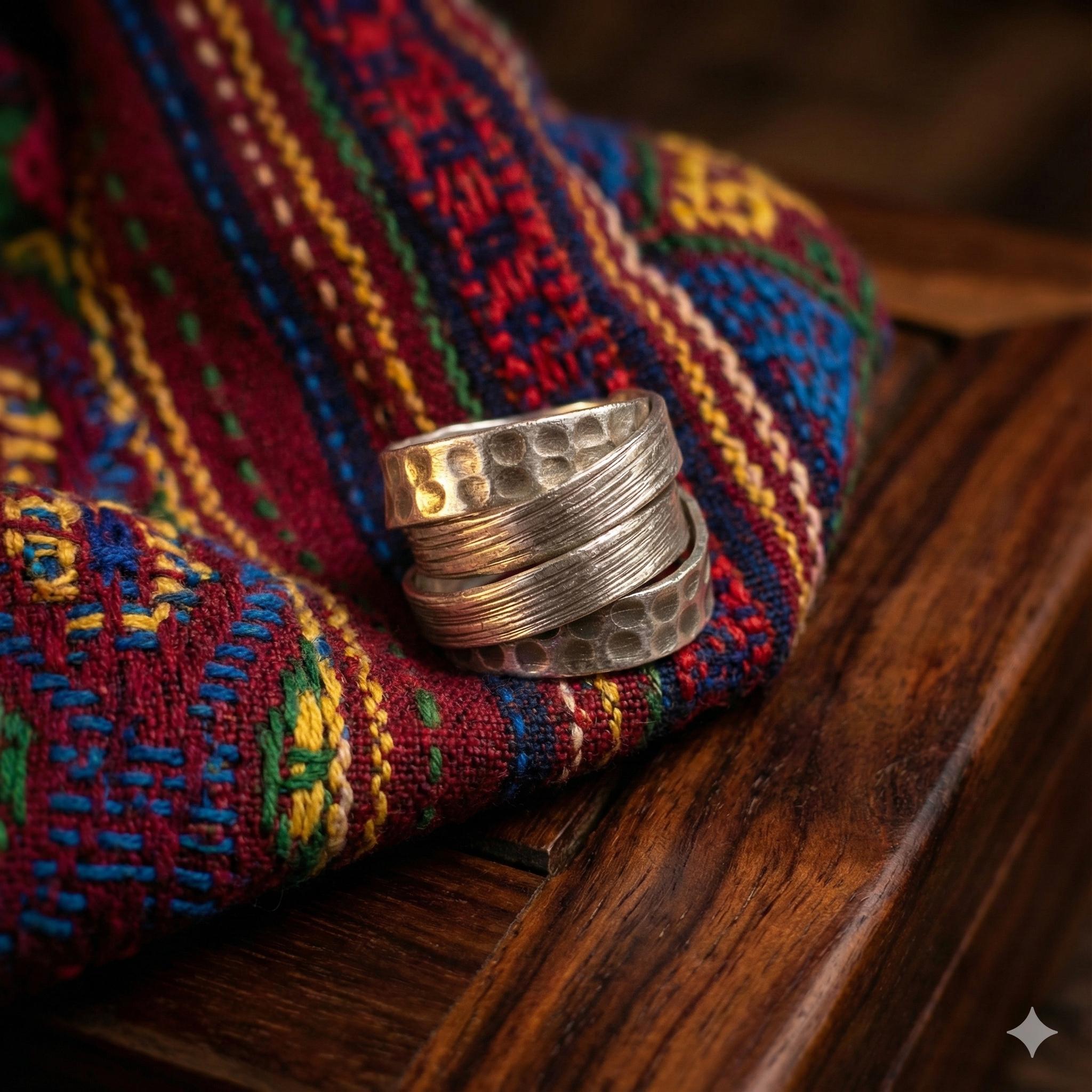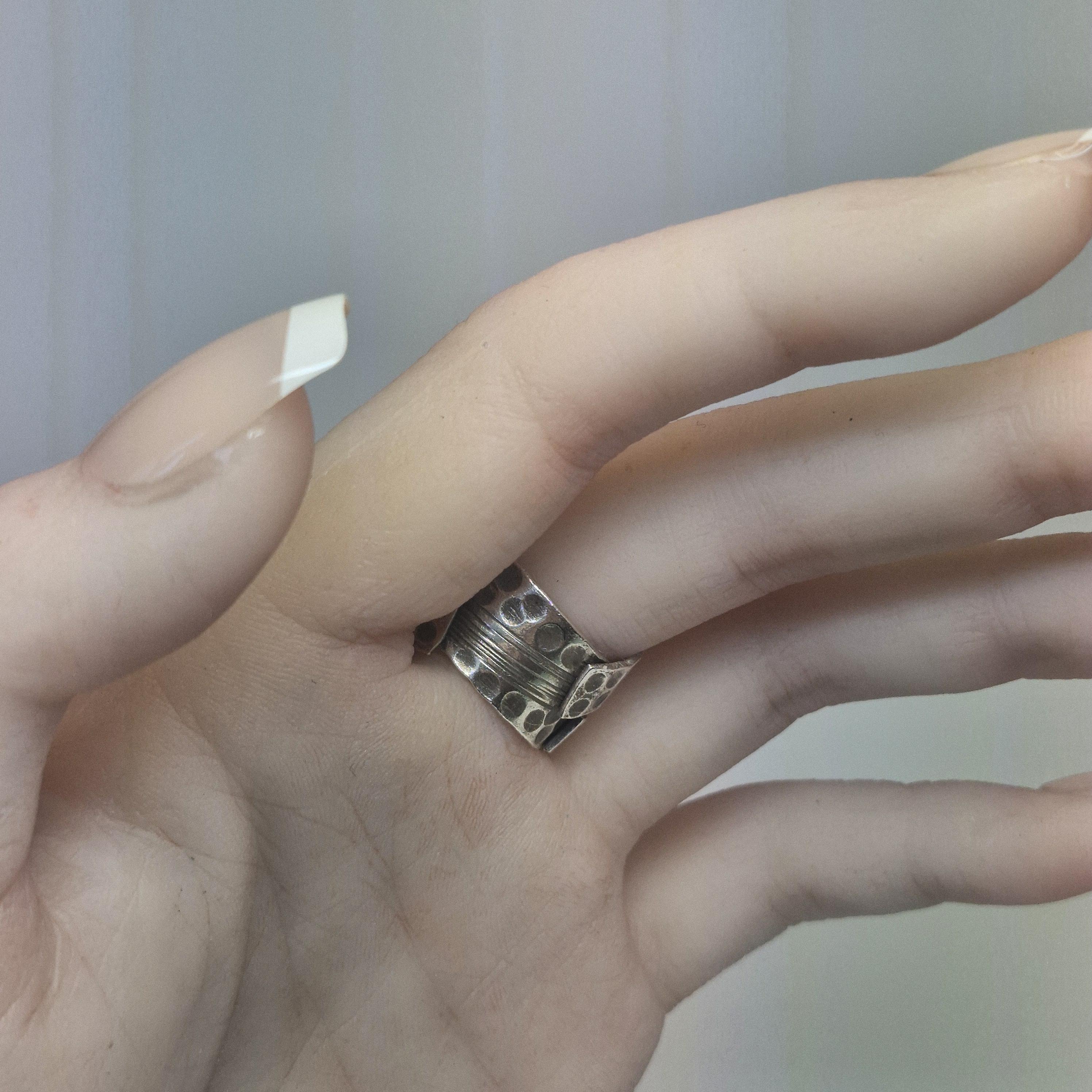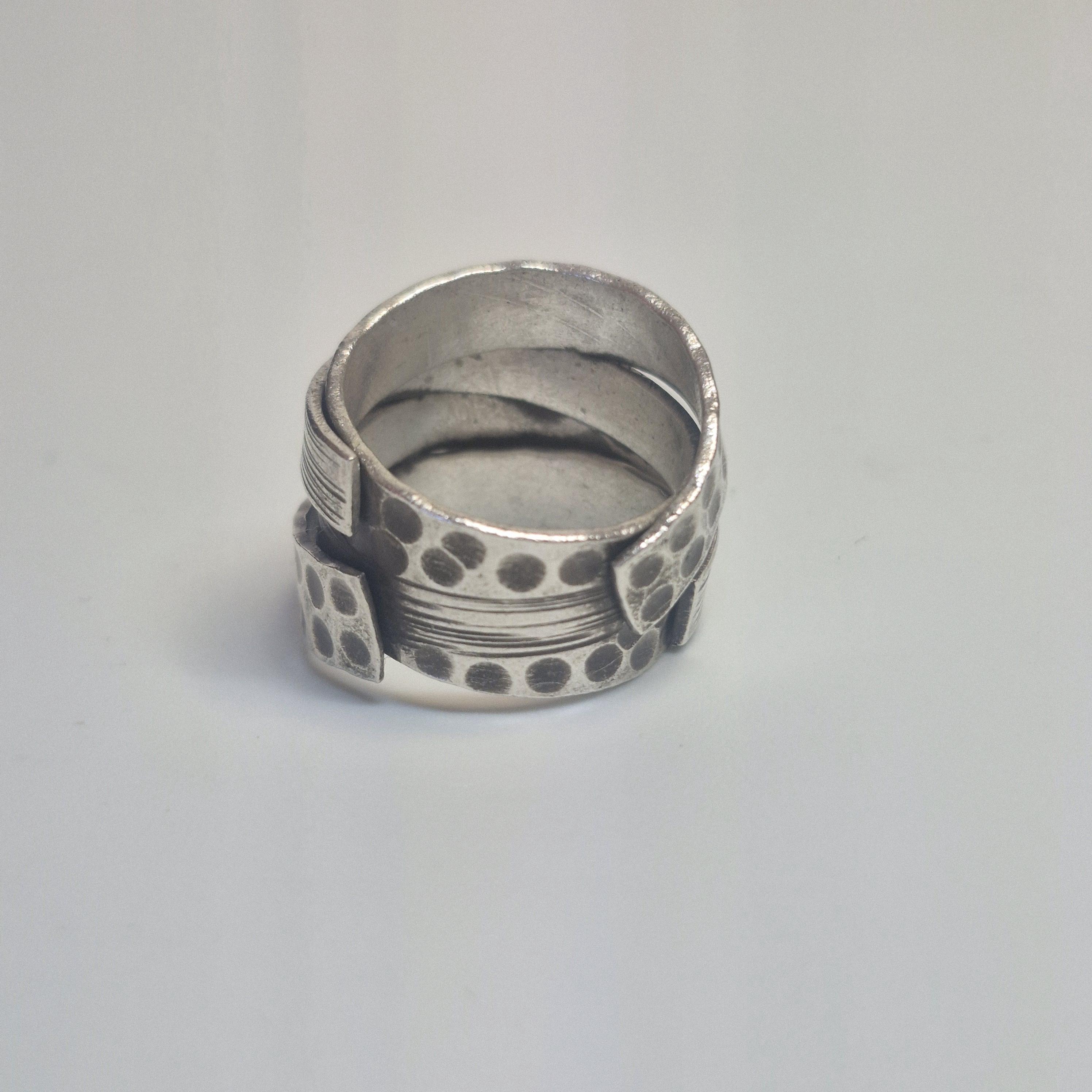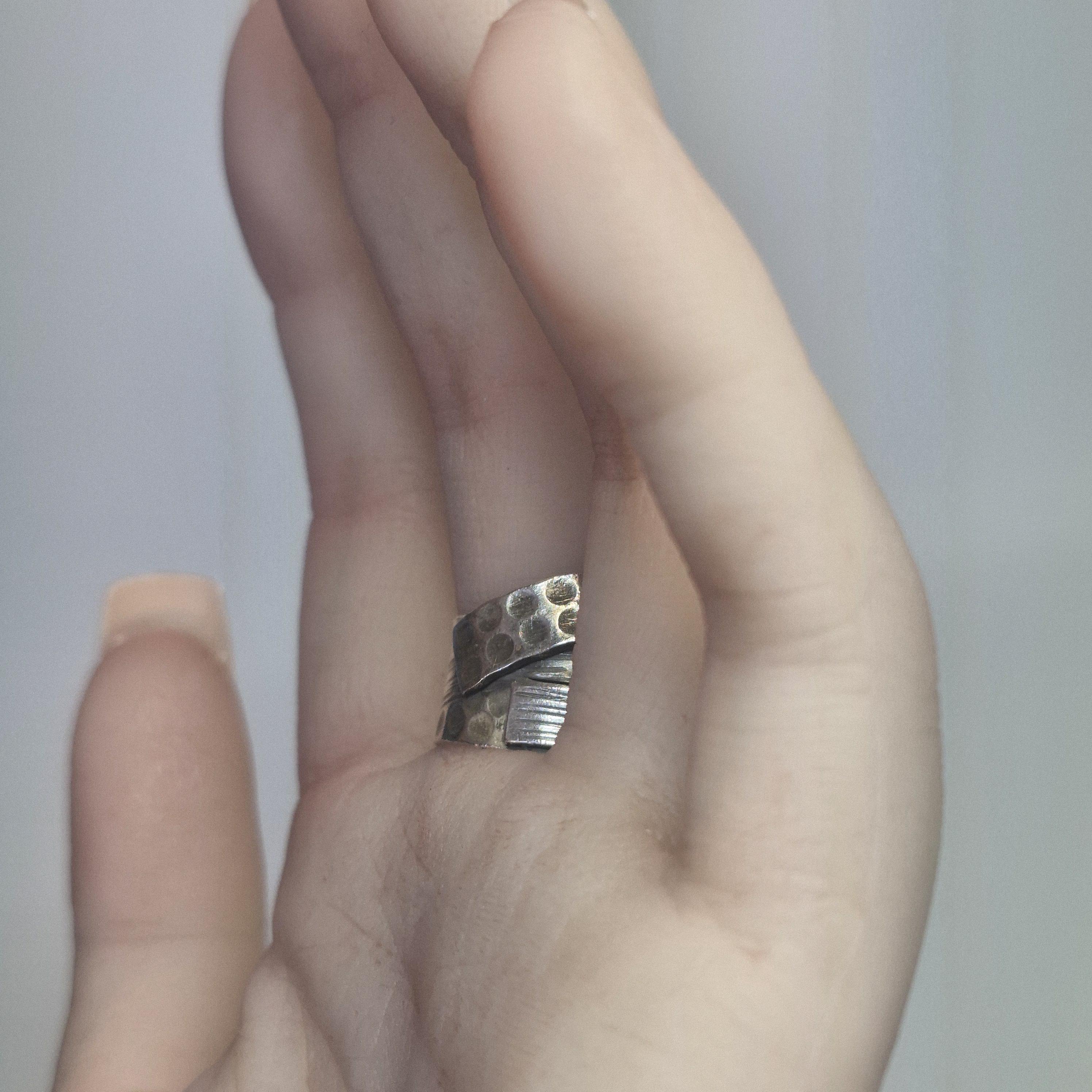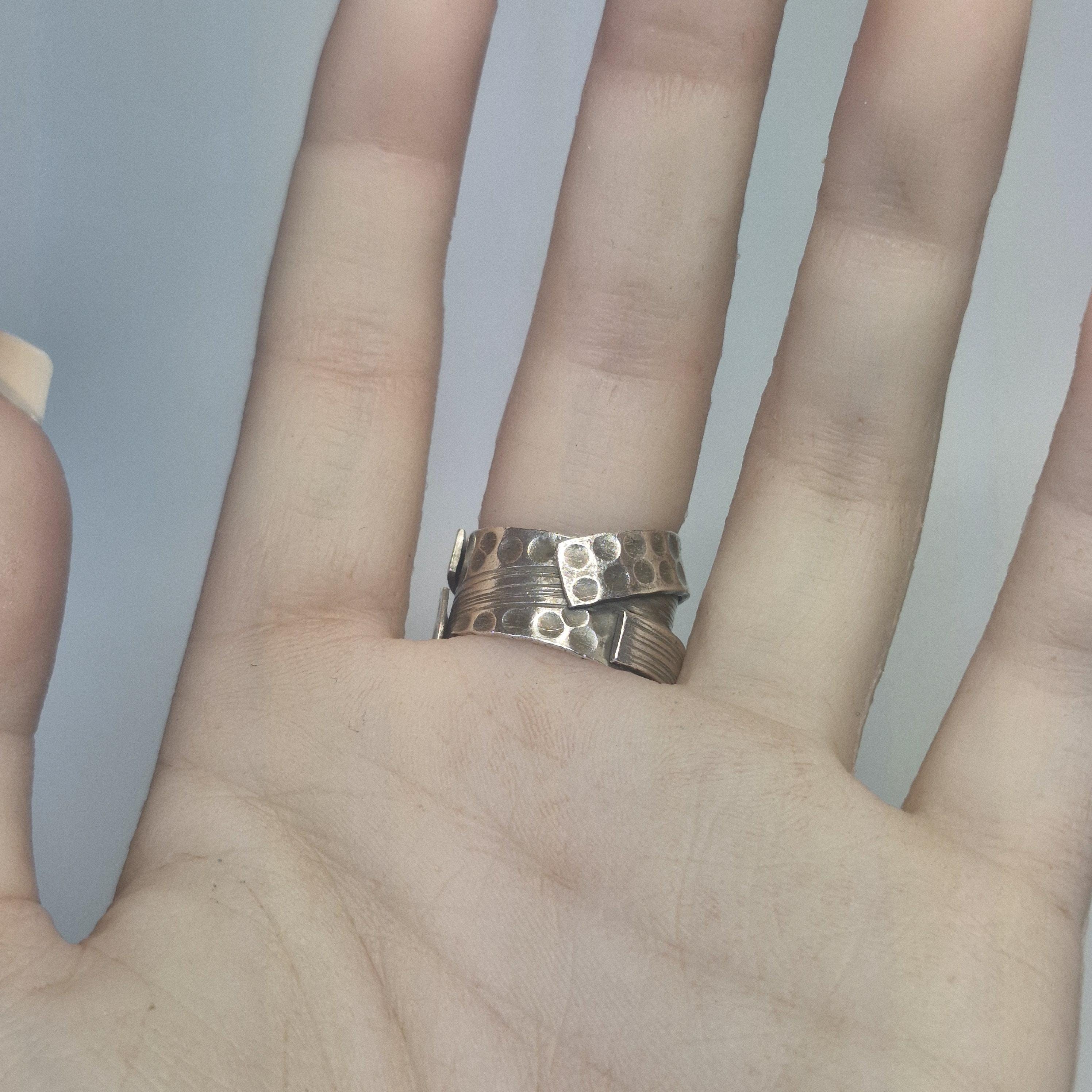 Adorn your hands with a piece that tells a story of craftsmanship and free-spirited wandering. This hand-forged wrap ring features a striking combination of deeply hammered textures and delicate linear grooves, creating a multi-strand illusion that wraps effortlessly around your finger.
