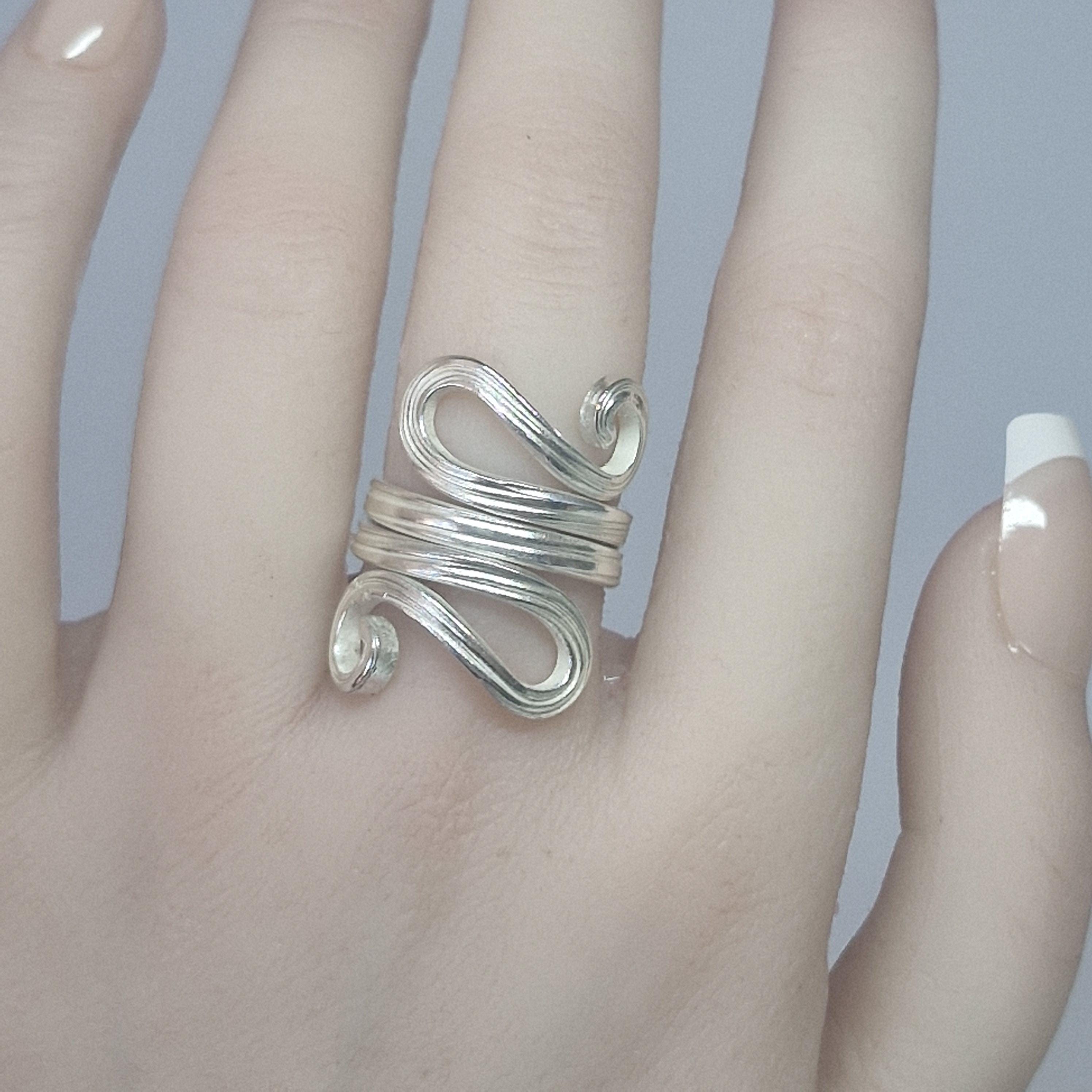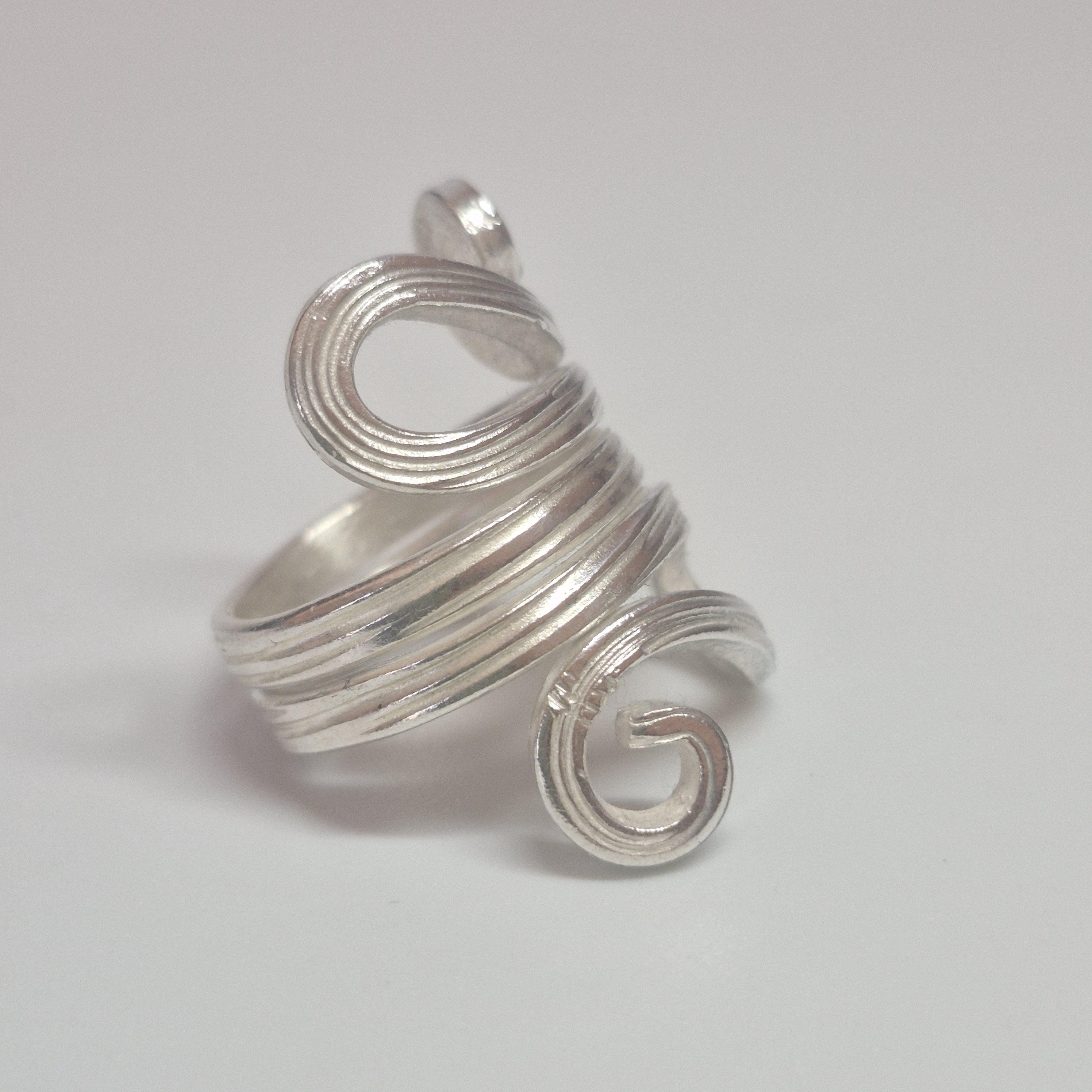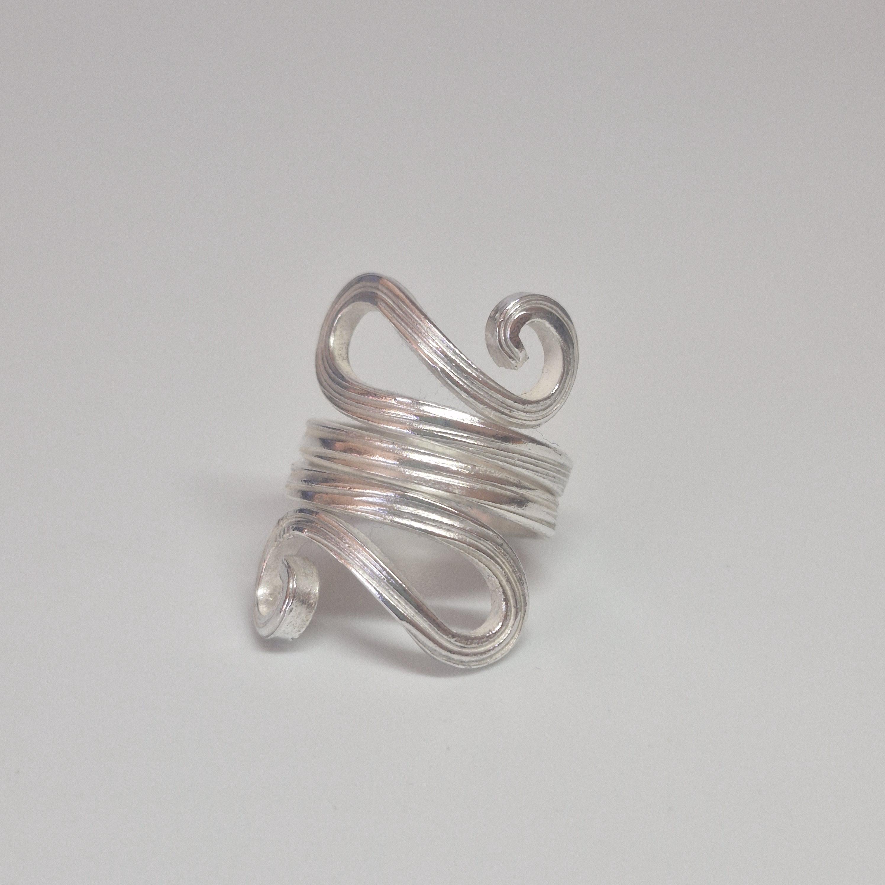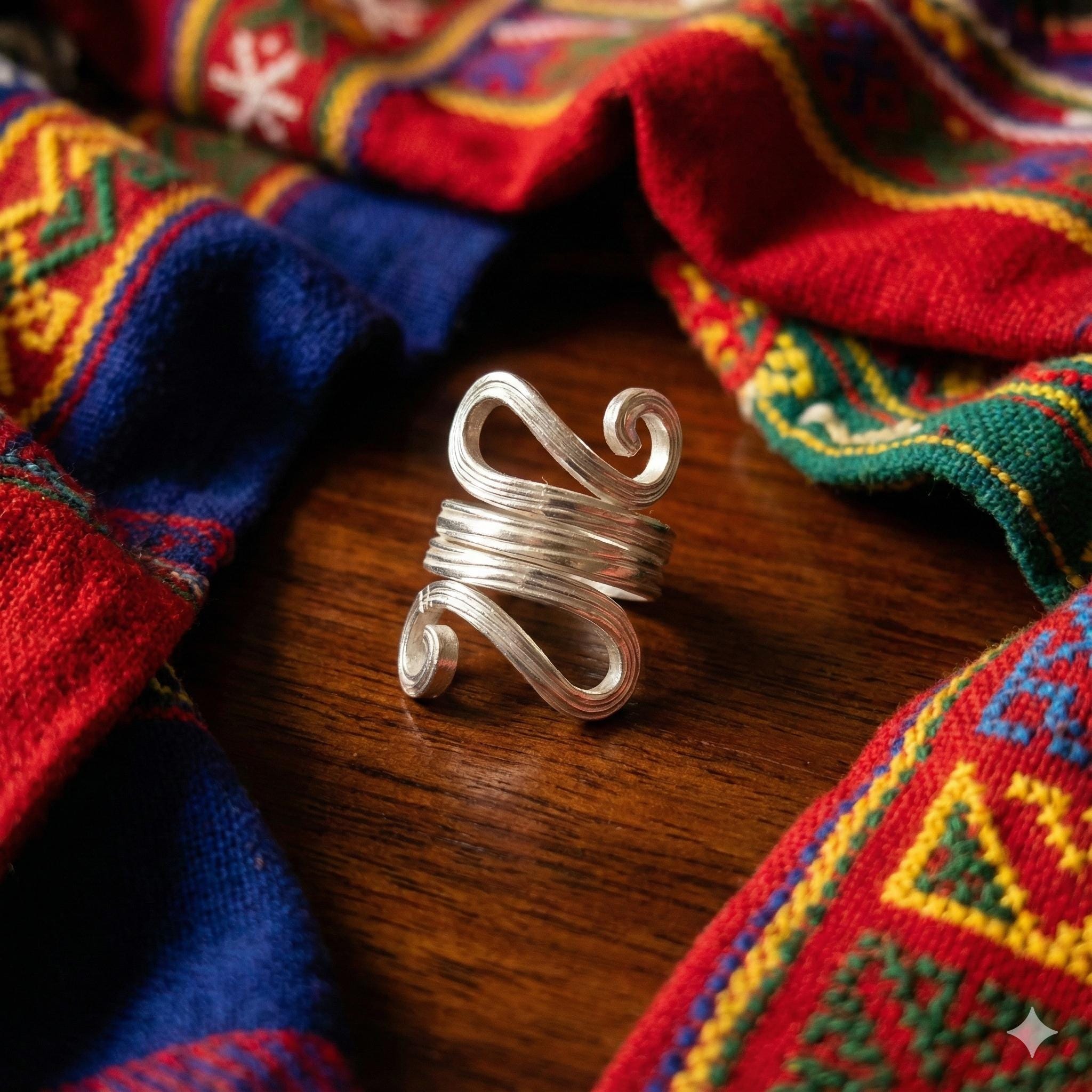 Embrace your inner wanderer with this striking, hand-forged statement piece. Designed for the woman whose heart belongs to the horizon, this lustrous white metal ring features a captivating double-swirl design, meticulously textured to catch the light during golden hour beach walks or late-night festival dances.