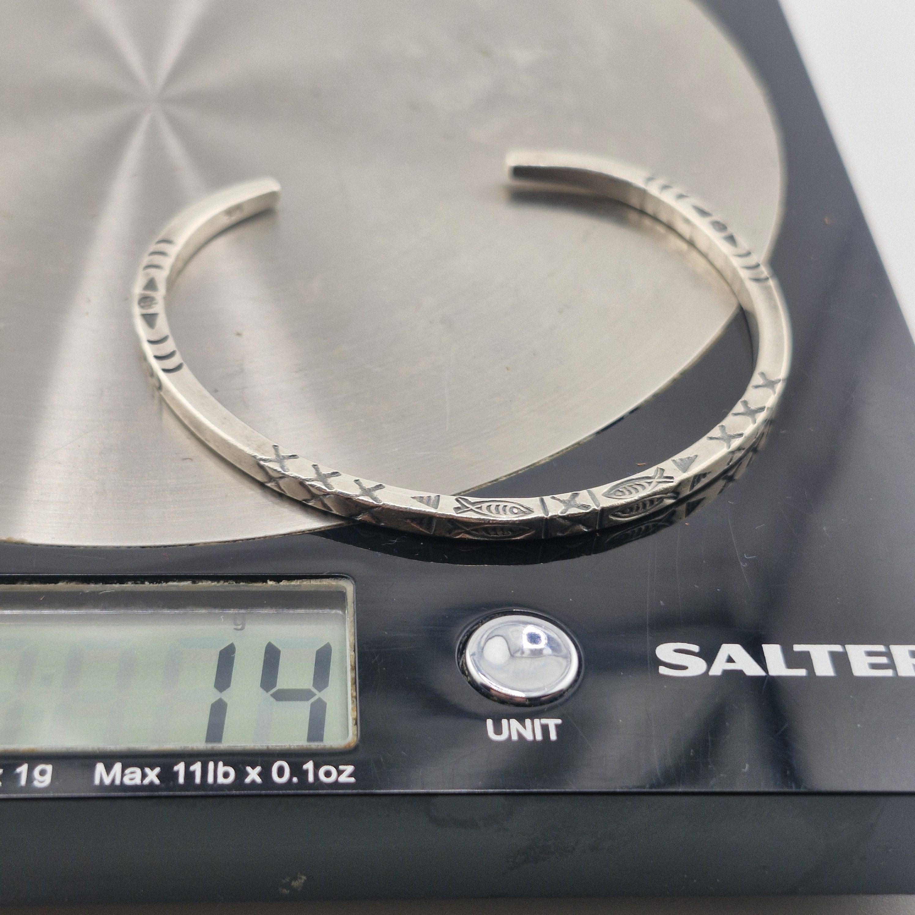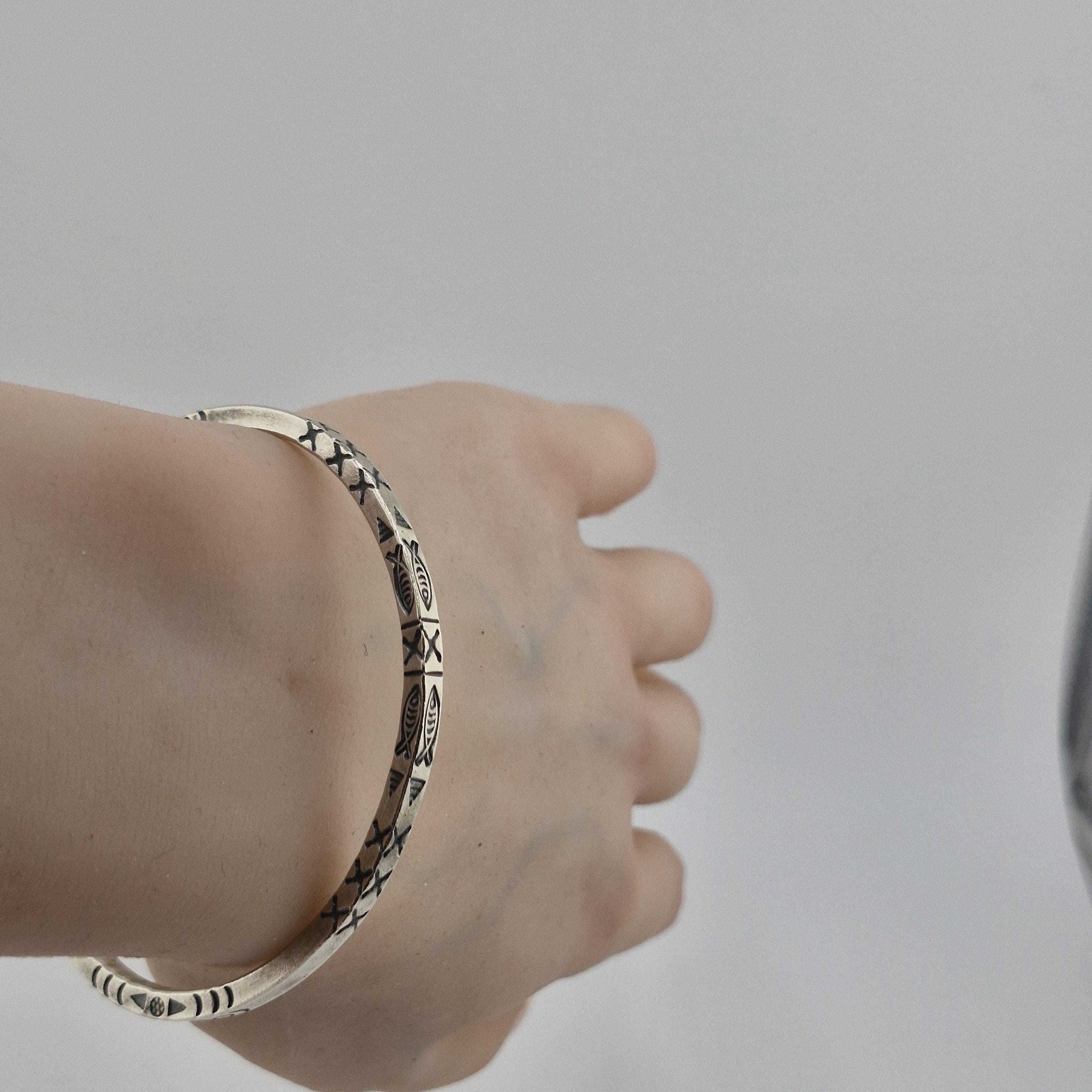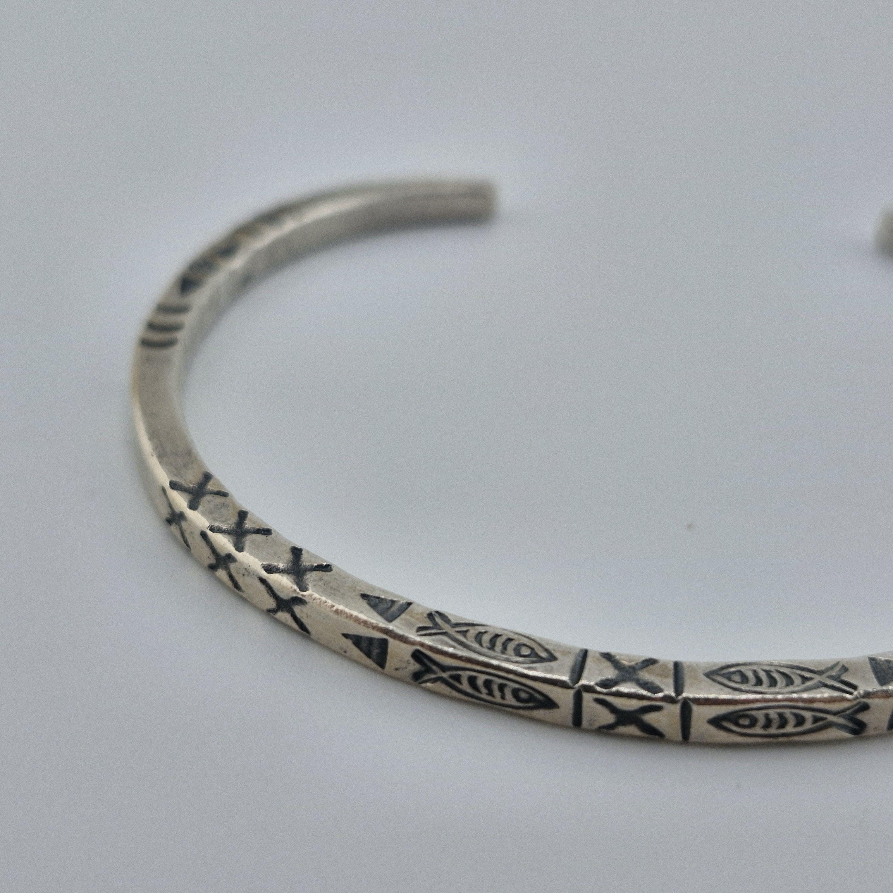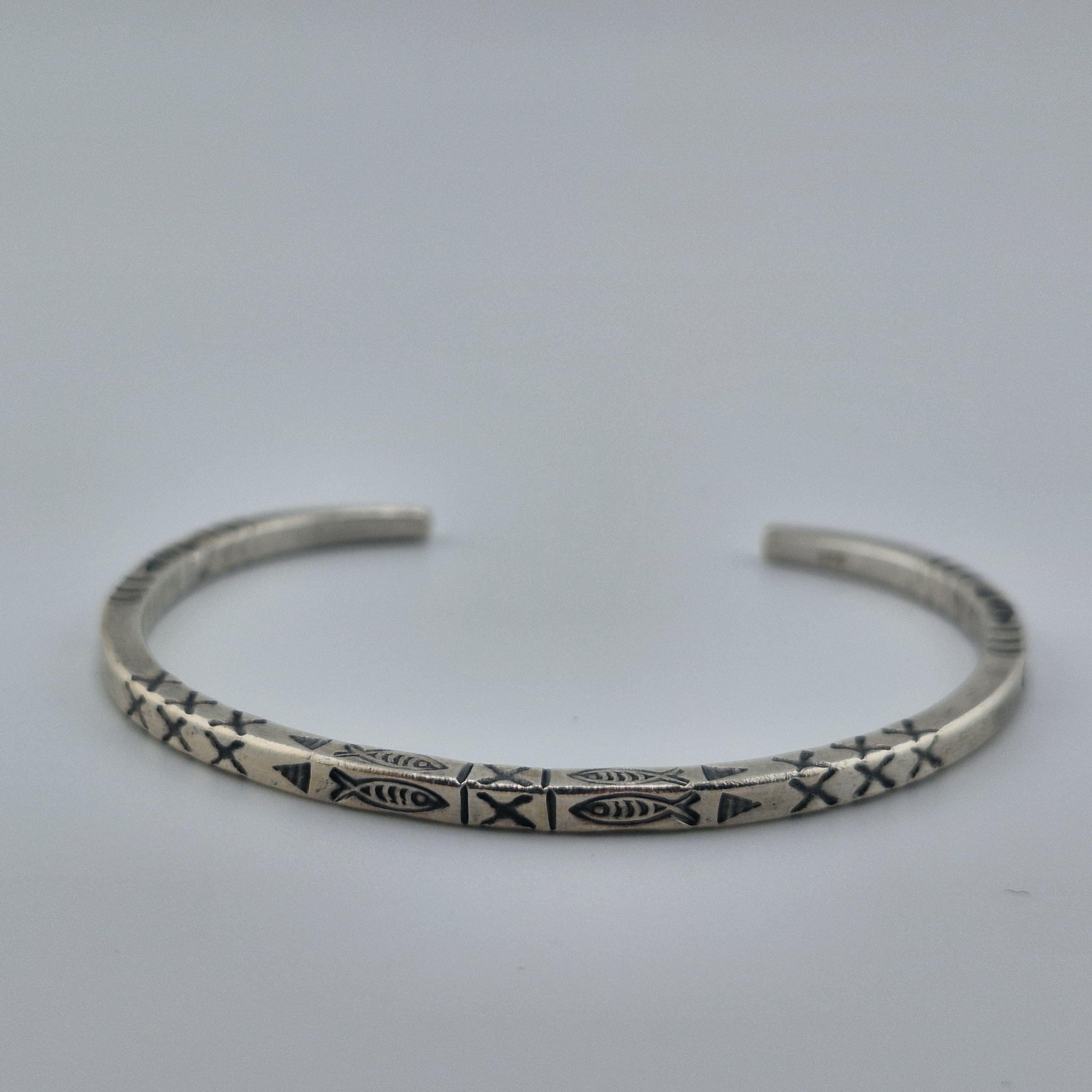 The Craftsmanship: This bangle is defined by its impressive 14-gram weight and its deep, hand-stamped iconography. Using traditional techniques, our artisans have hammered symbolic fish and tribal "X" patterns into a high-purity (96-99%) white metal. The result is a sculptural piece with a matte-lustre finish that feels as premium as it looks.