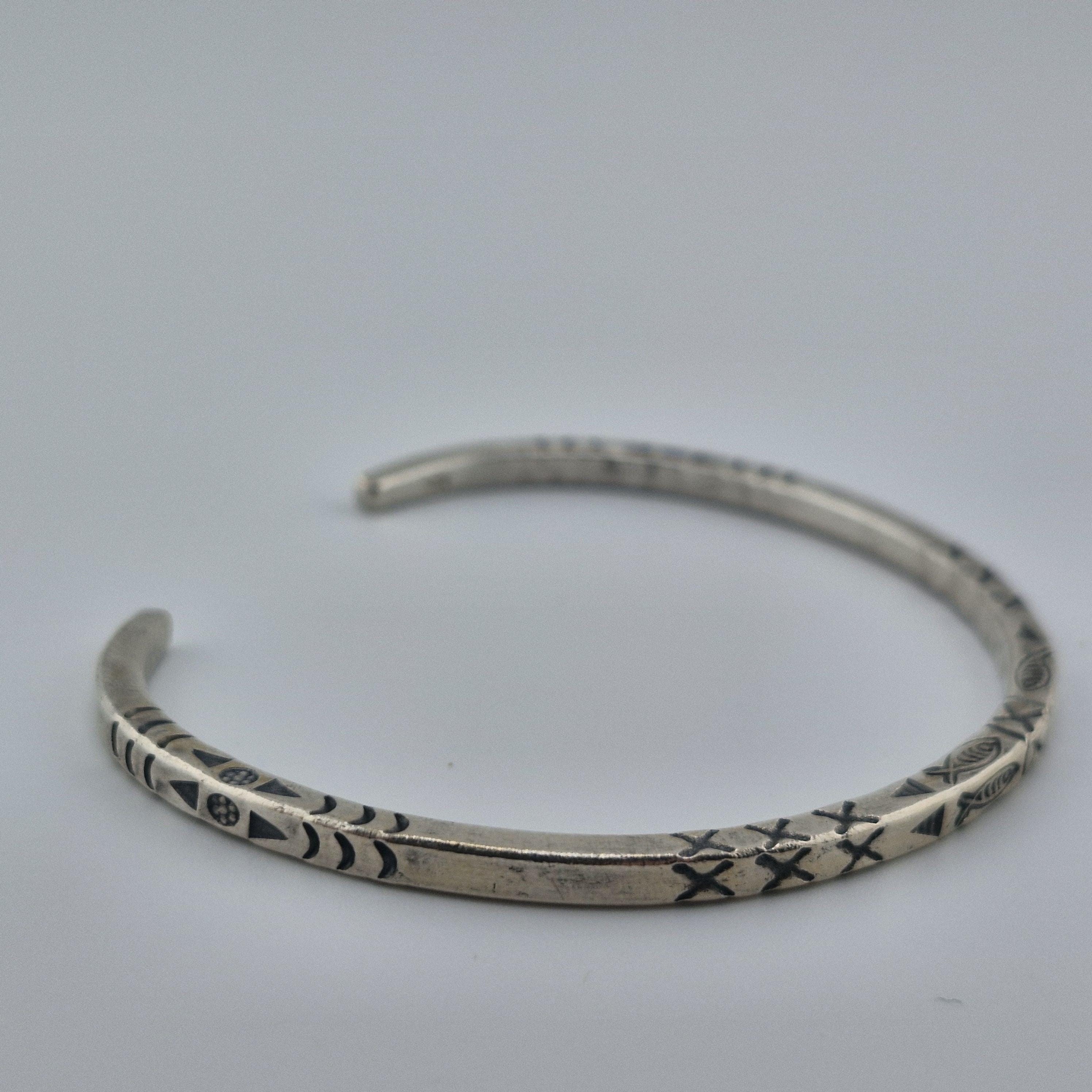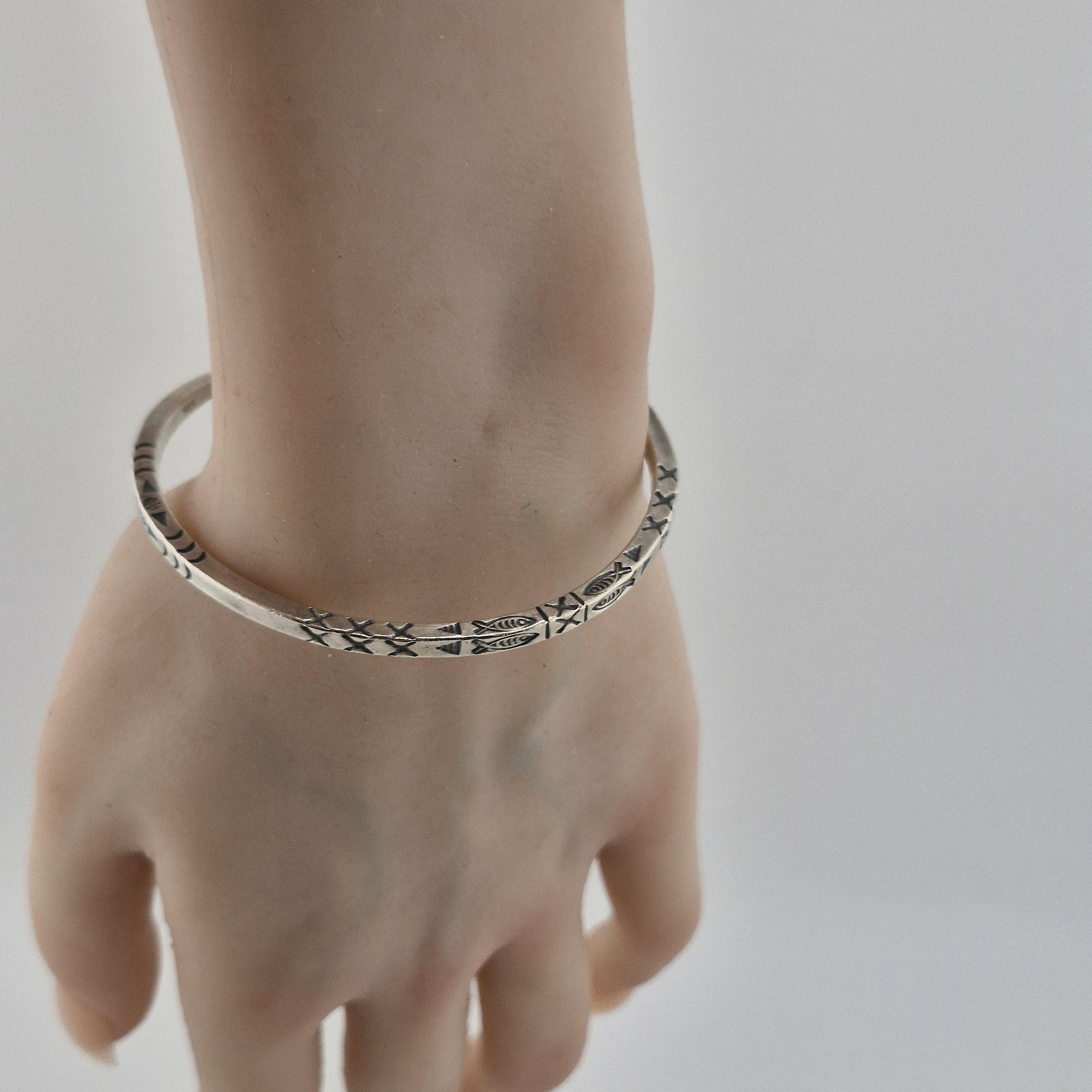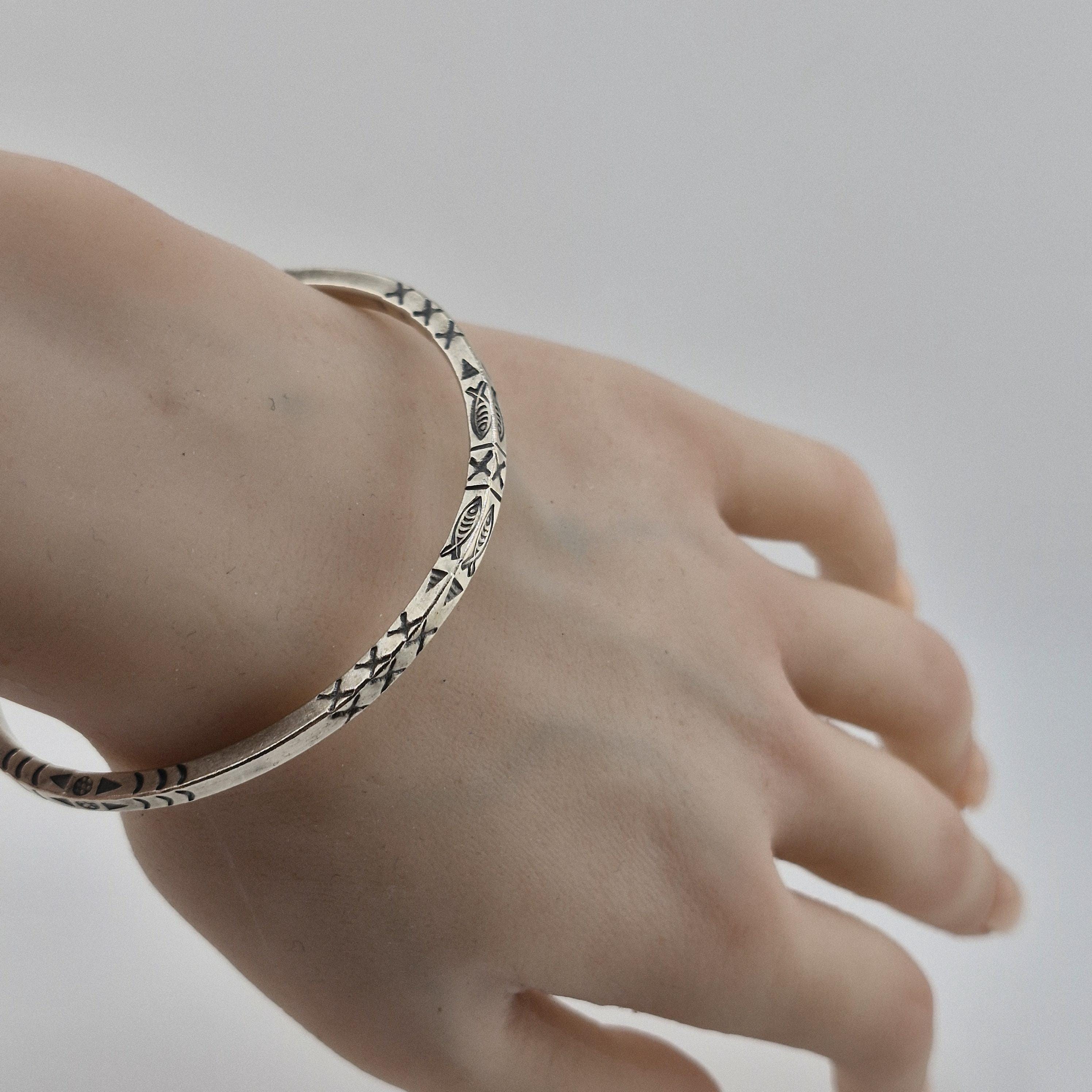 The Craftsmanship: This bangle is defined by its impressive 14-gram weight and its deep, hand-stamped iconography. Using traditional techniques, our artisans have hammered symbolic fish and tribal "X" patterns into a high-purity (96-99%) white metal. The result is a sculptural piece with a matte-lustre finish that feels as premium as it looks.