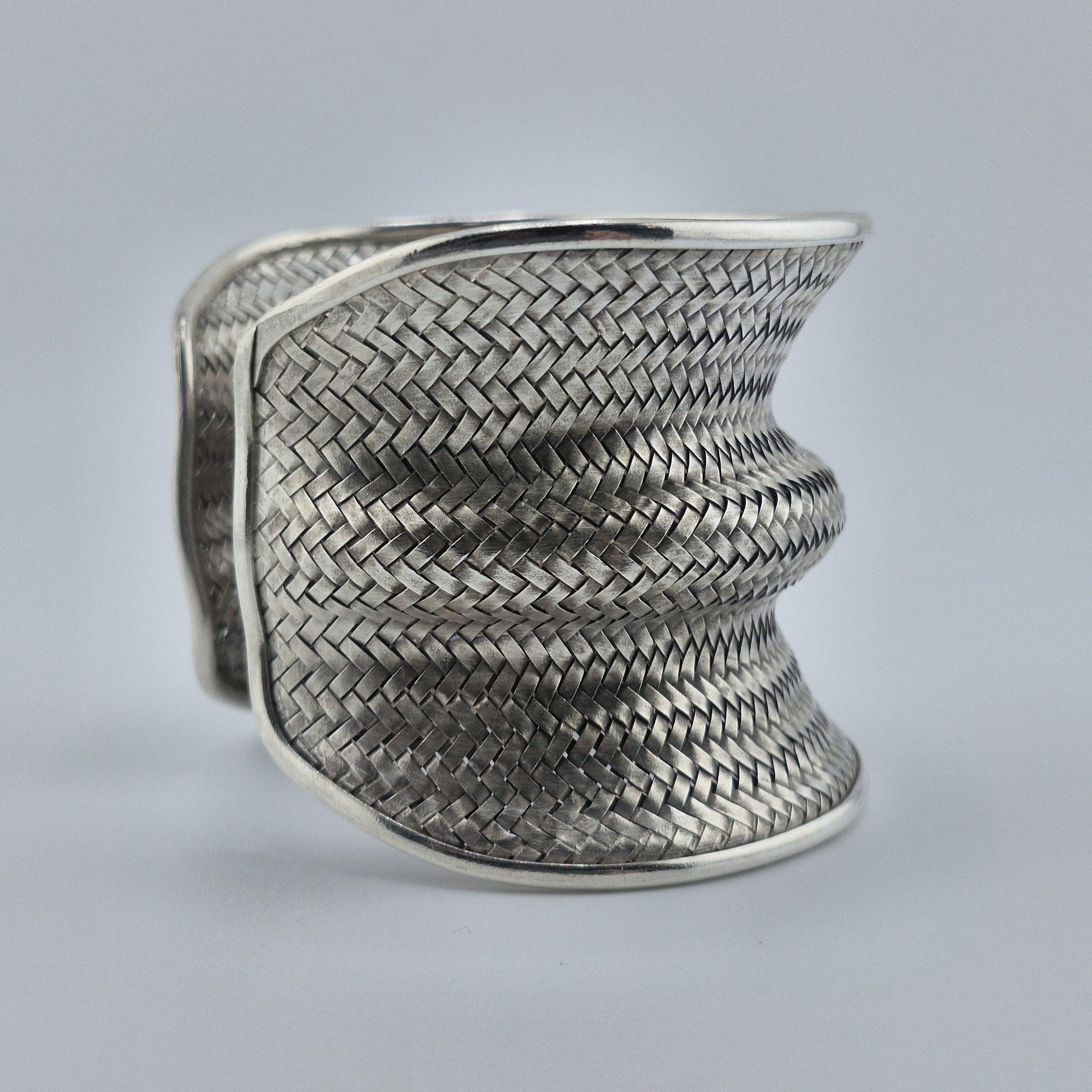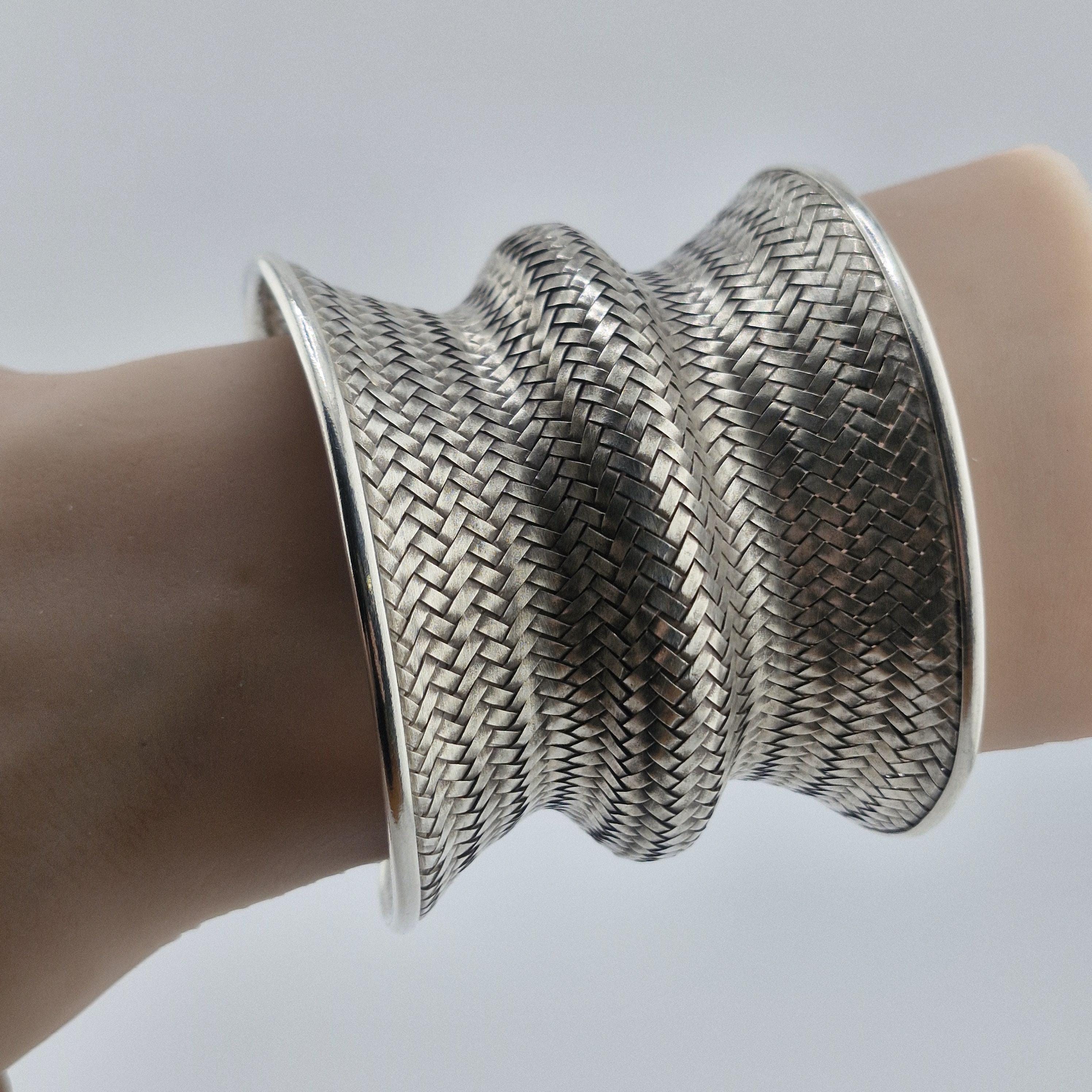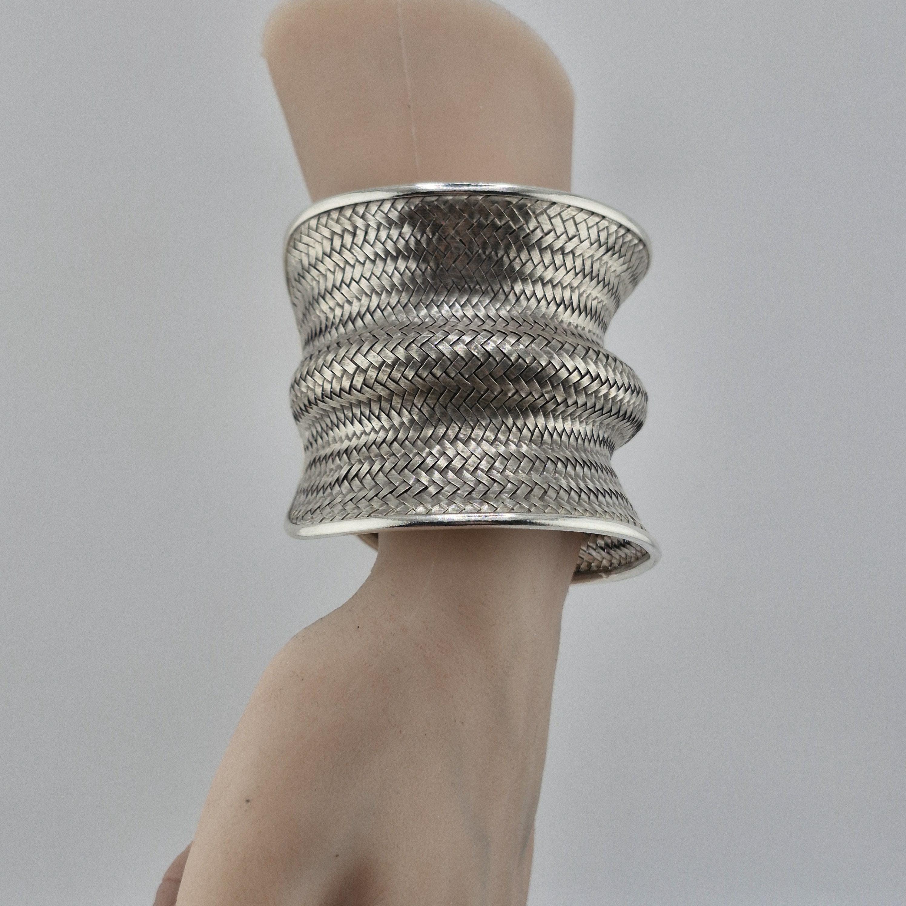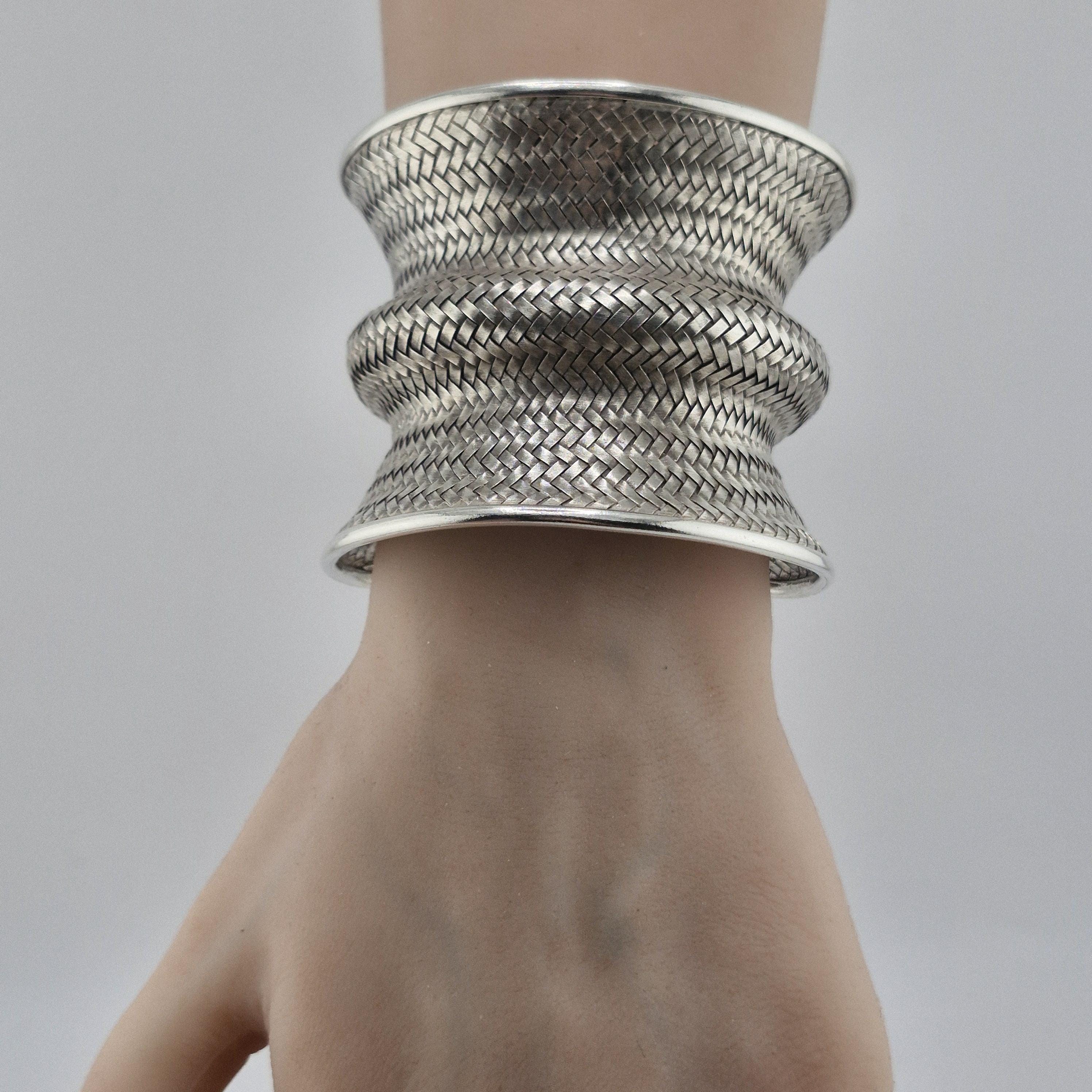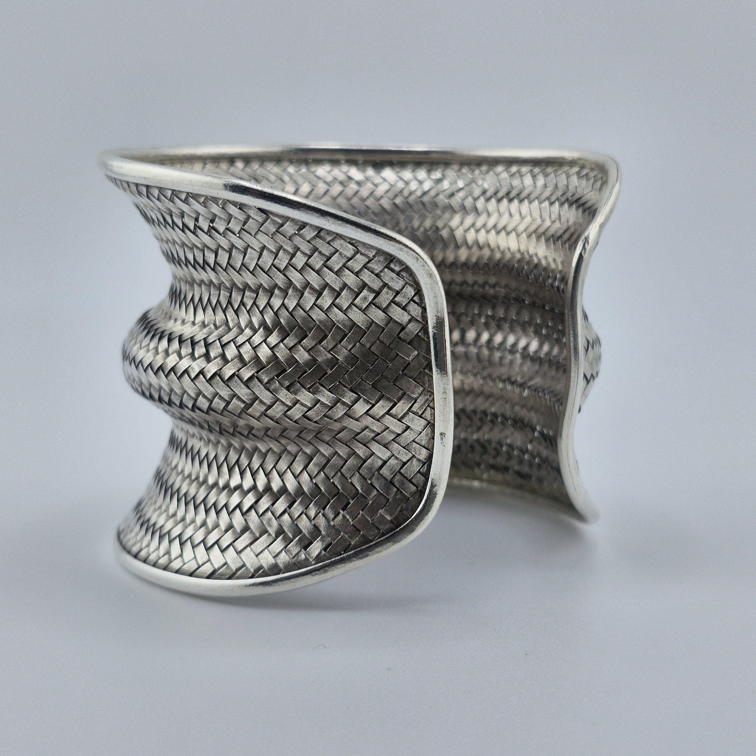 Expertly crafted with a dense, basket-weave pattern, this lustrous white metal cuff offers a substantial, grounding presence at 62 grams. The undulating, ergonomic shape is designed to catch the light from every angle, making it a definitive statement piece that transcends seasonal trends. It represents the "Quiet Luxury" of the boho world—sophisticated, heavy, and undeniably handmade.
