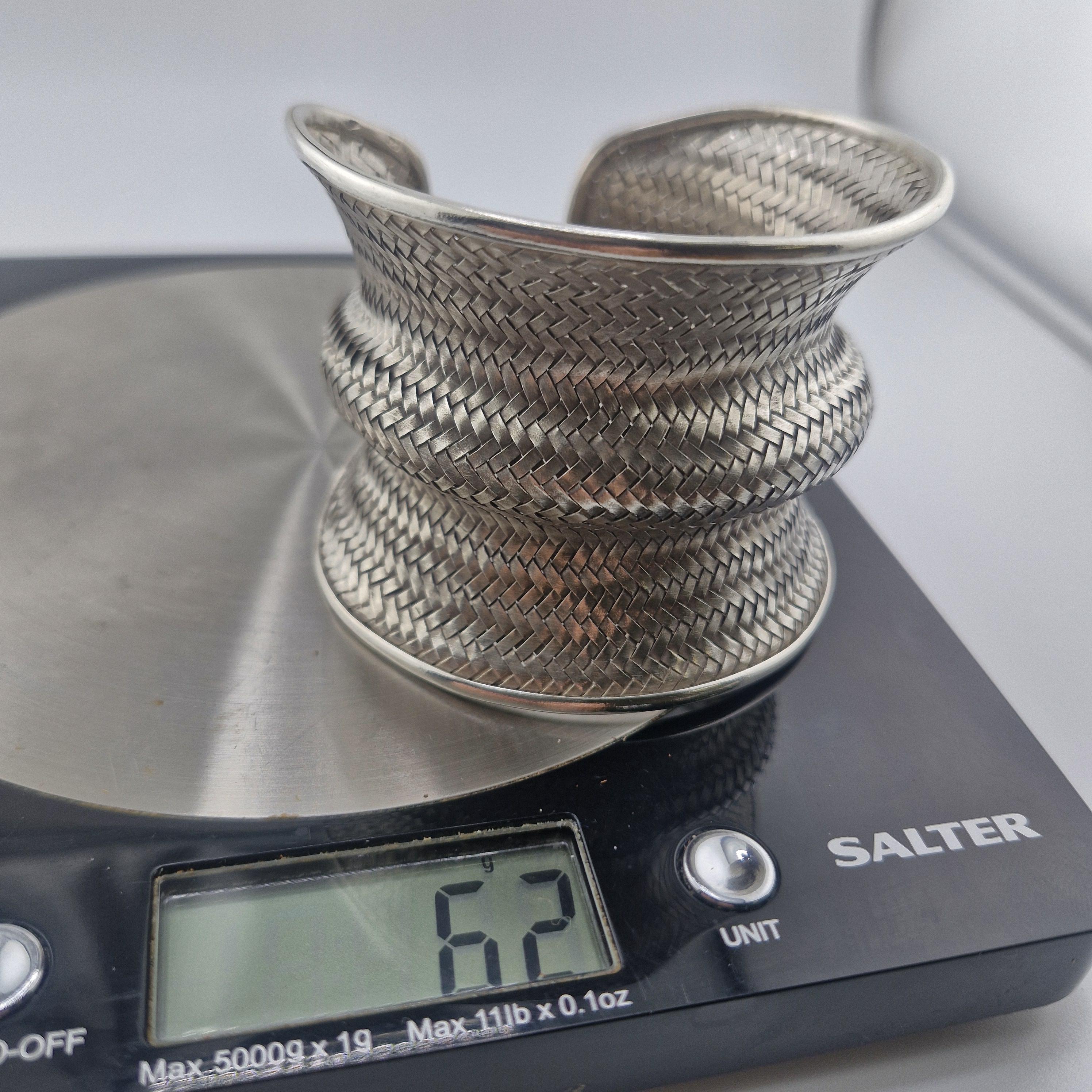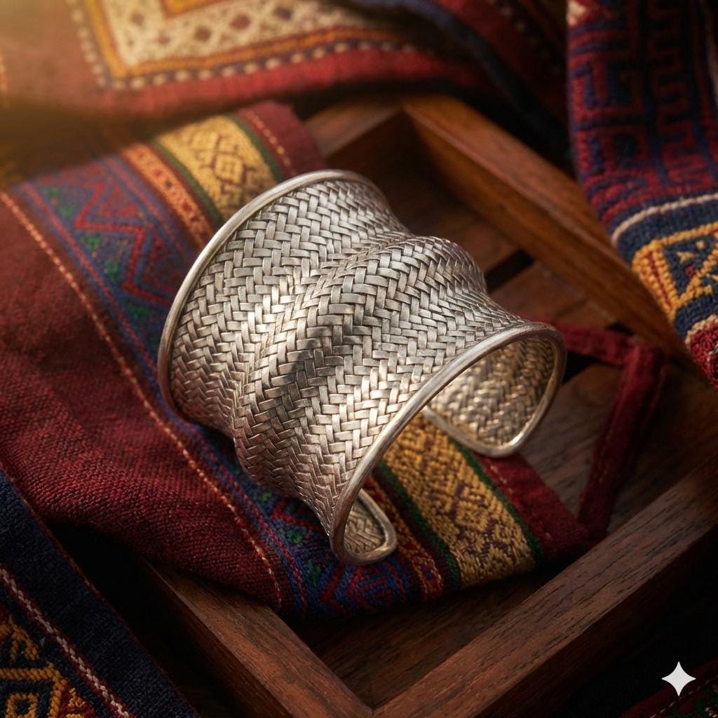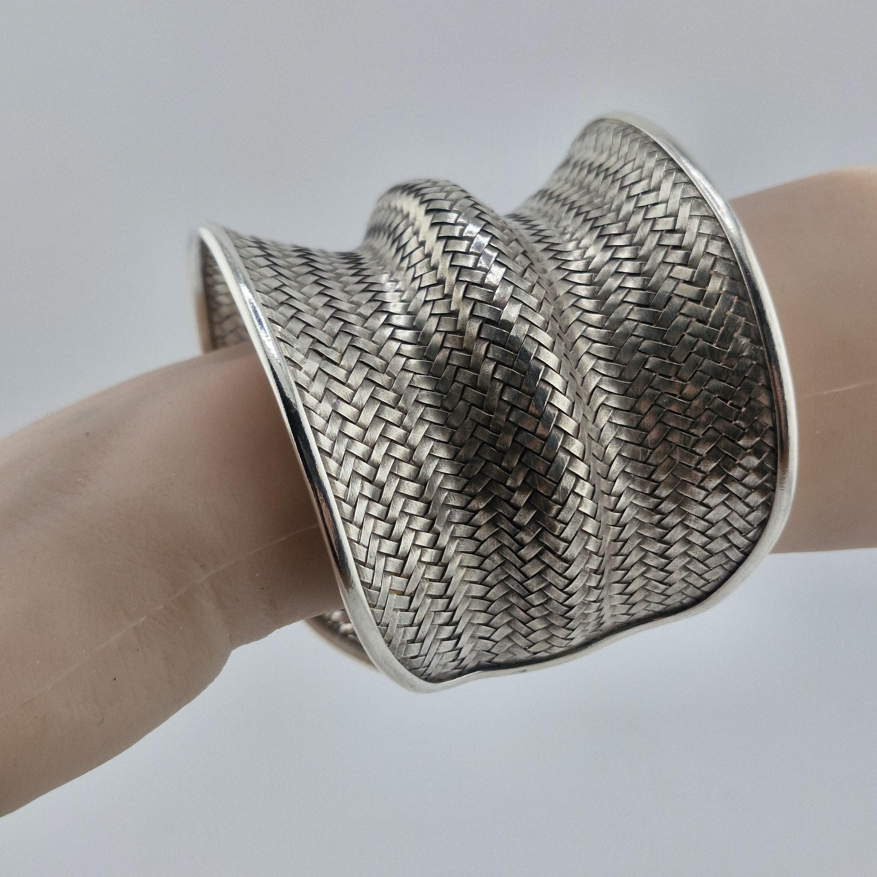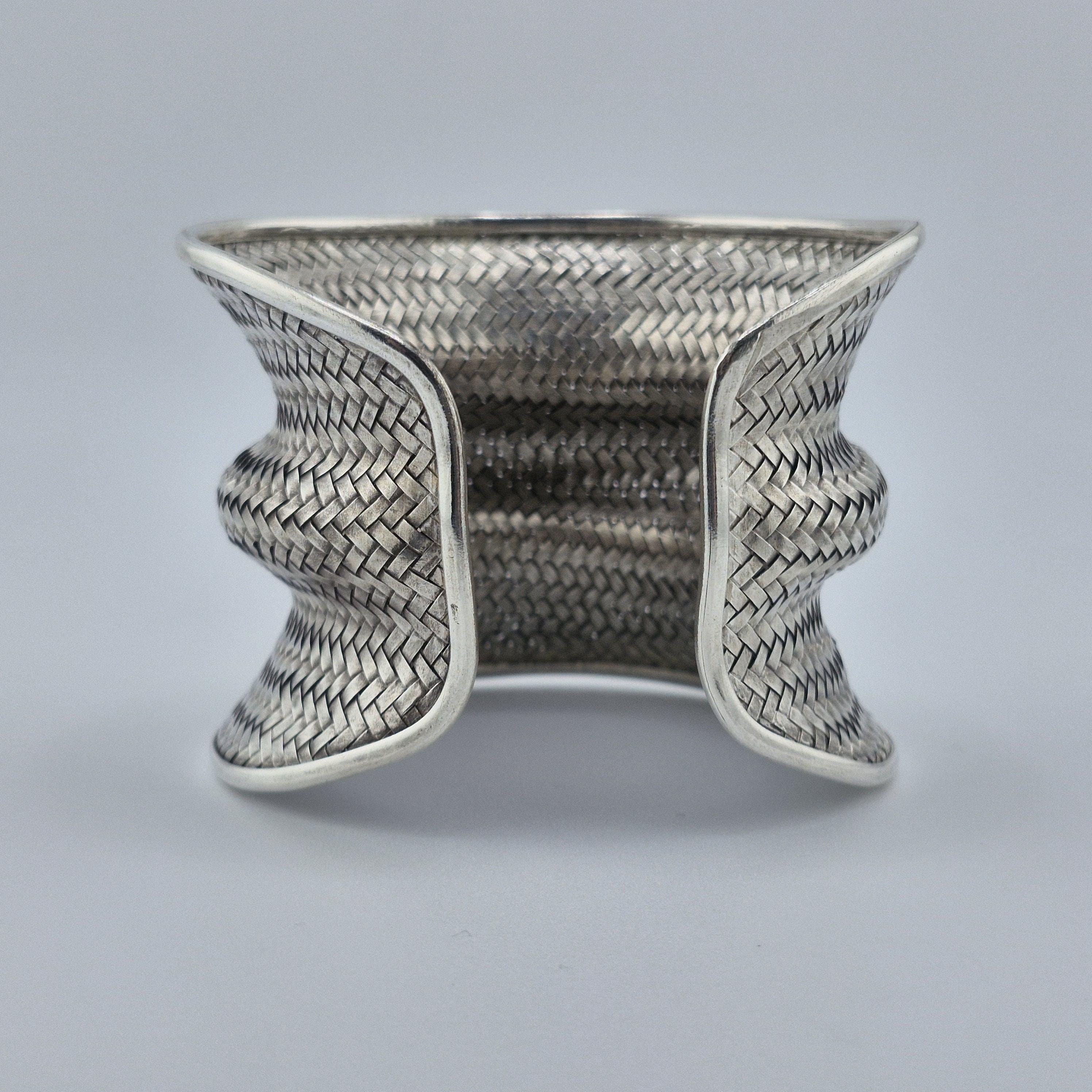 Expertly crafted with a dense, basket-weave pattern, this lustrous white metal cuff offers a substantial, grounding presence at 62 grams. The undulating, ergonomic shape is designed to catch the light from every angle, making it a definitive statement piece that transcends seasonal trends. It represents the "Quiet Luxury" of the boho world—sophisticated, heavy, and undeniably handmade.