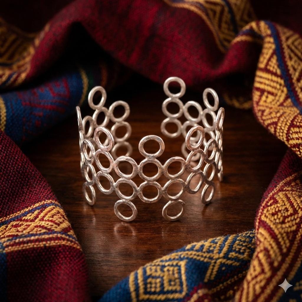 Constructed from a delicate yet strong lattice of interlocking rings, this lustrous white metal cuff provides a striking "skin-show" effect while maintaining a substantial, premium weight of 32 grams. The repeating circular motifs symbolise connection and wholeness, finished with a high-shine, cool-toned lustre that glows against sun-kissed skin.