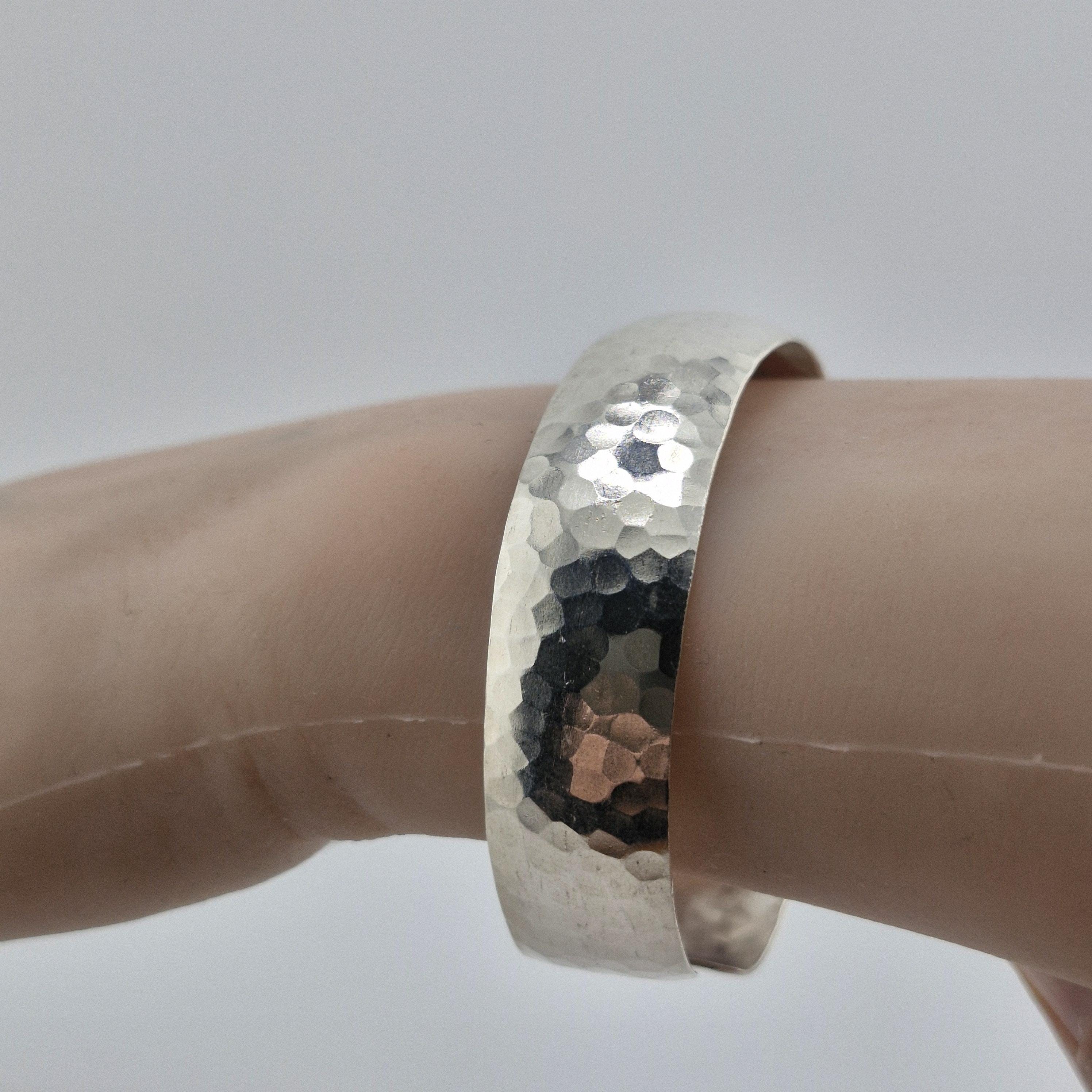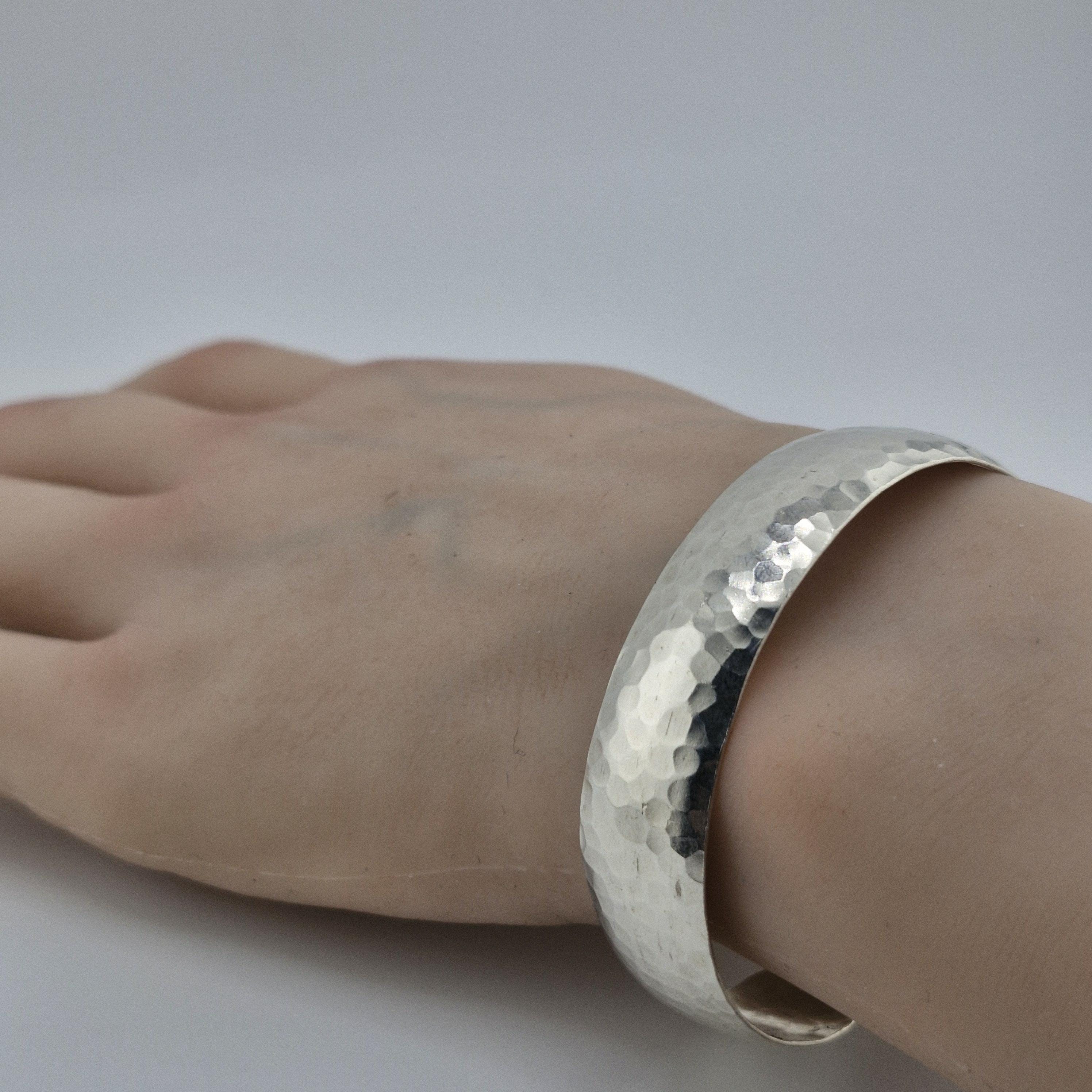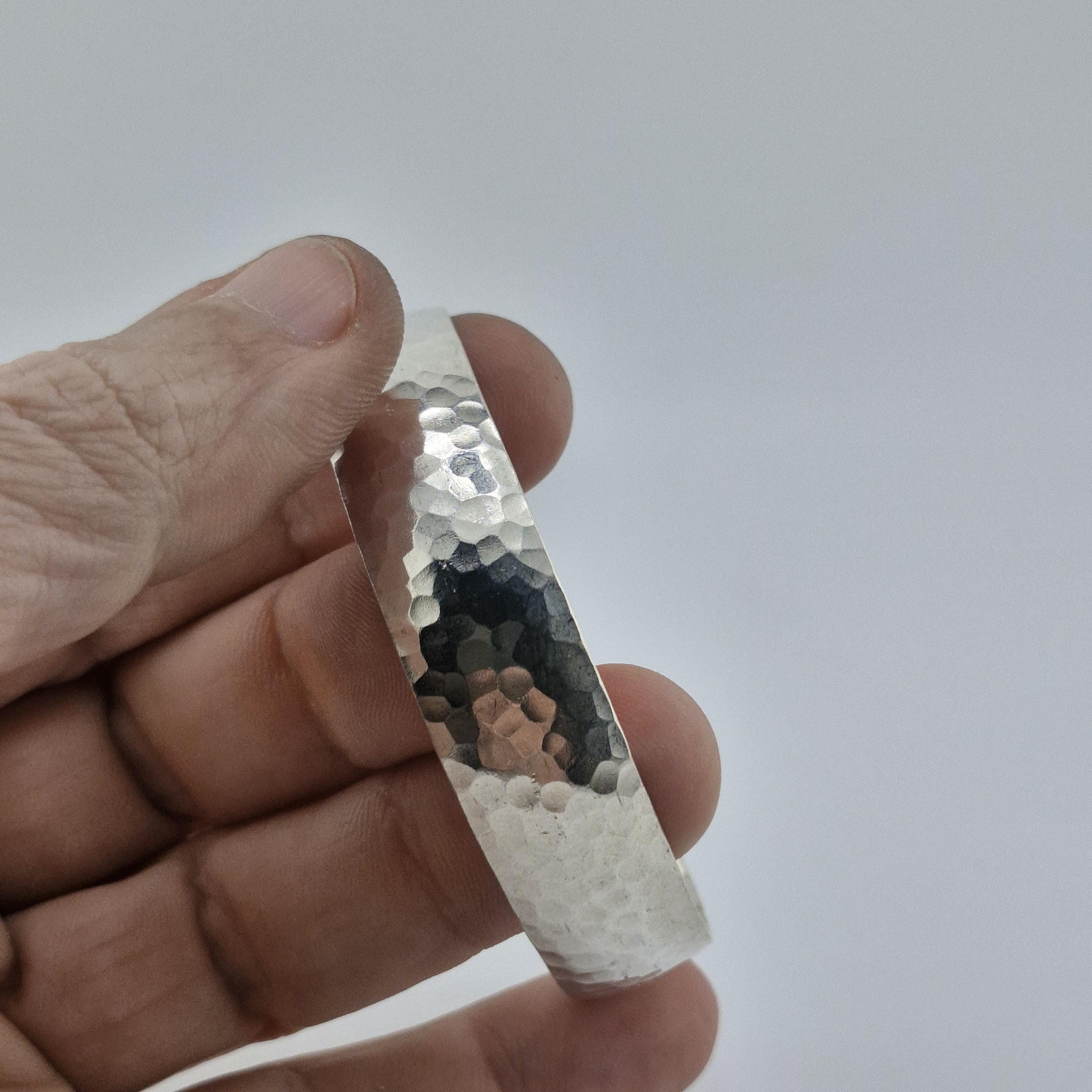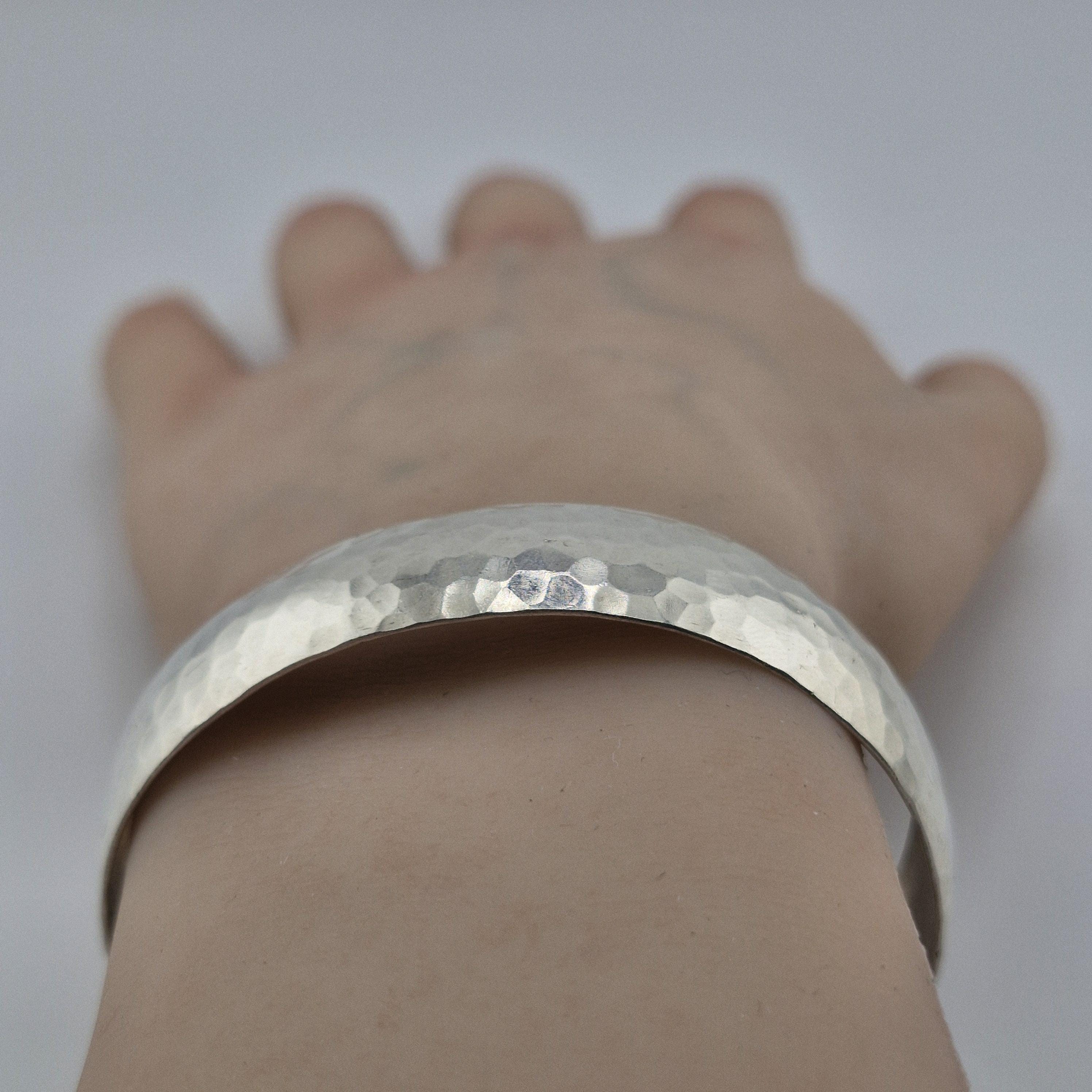 Featuring a gentle convex dome profile and a meticulously hand-hammered surface, this lustrous white metal bangle offers a premium, reassuring weight of 14 grams. The faceted texture is designed to capture the soft glow of golden hour, creating a rhythmic play of light that feels both ancient and futuristic.
