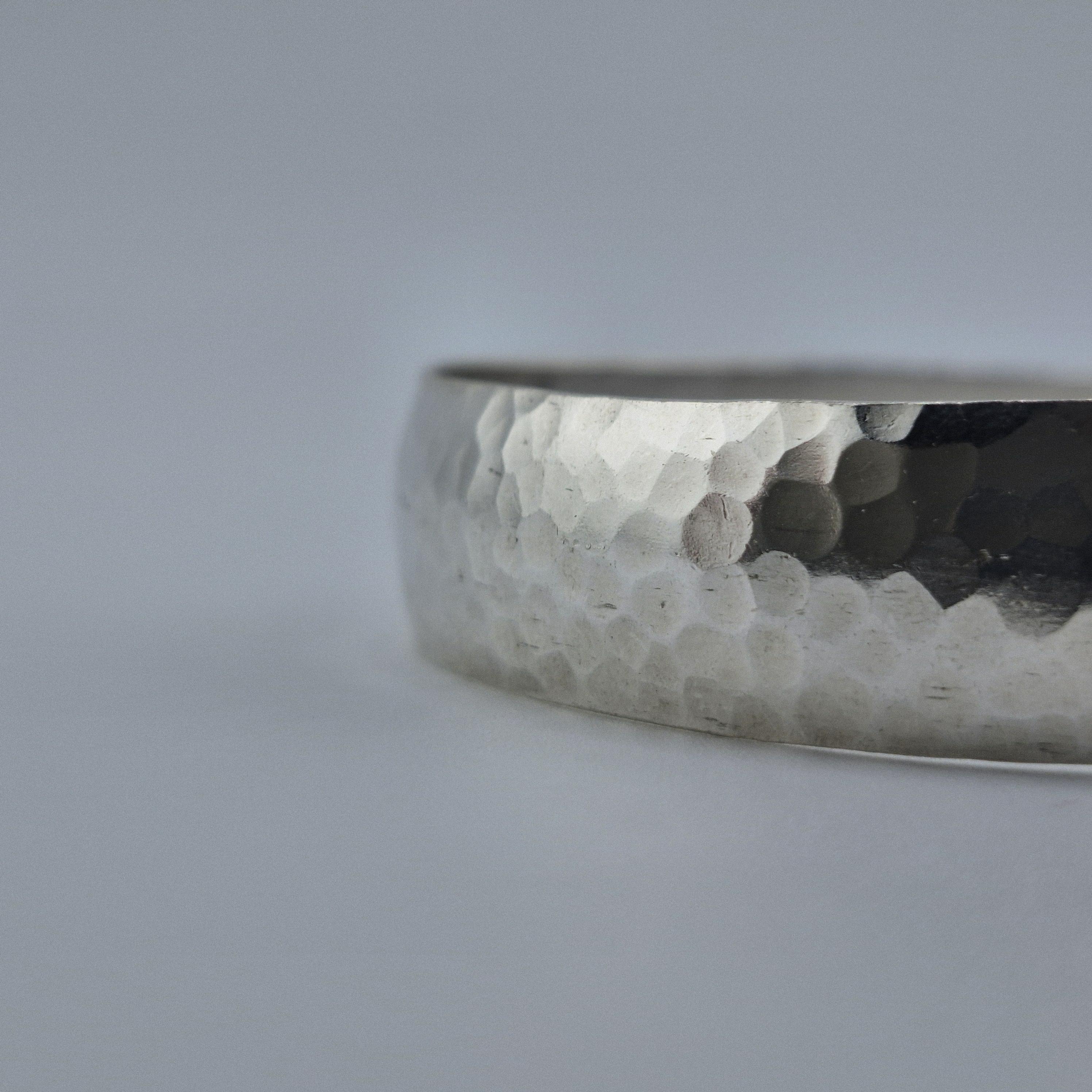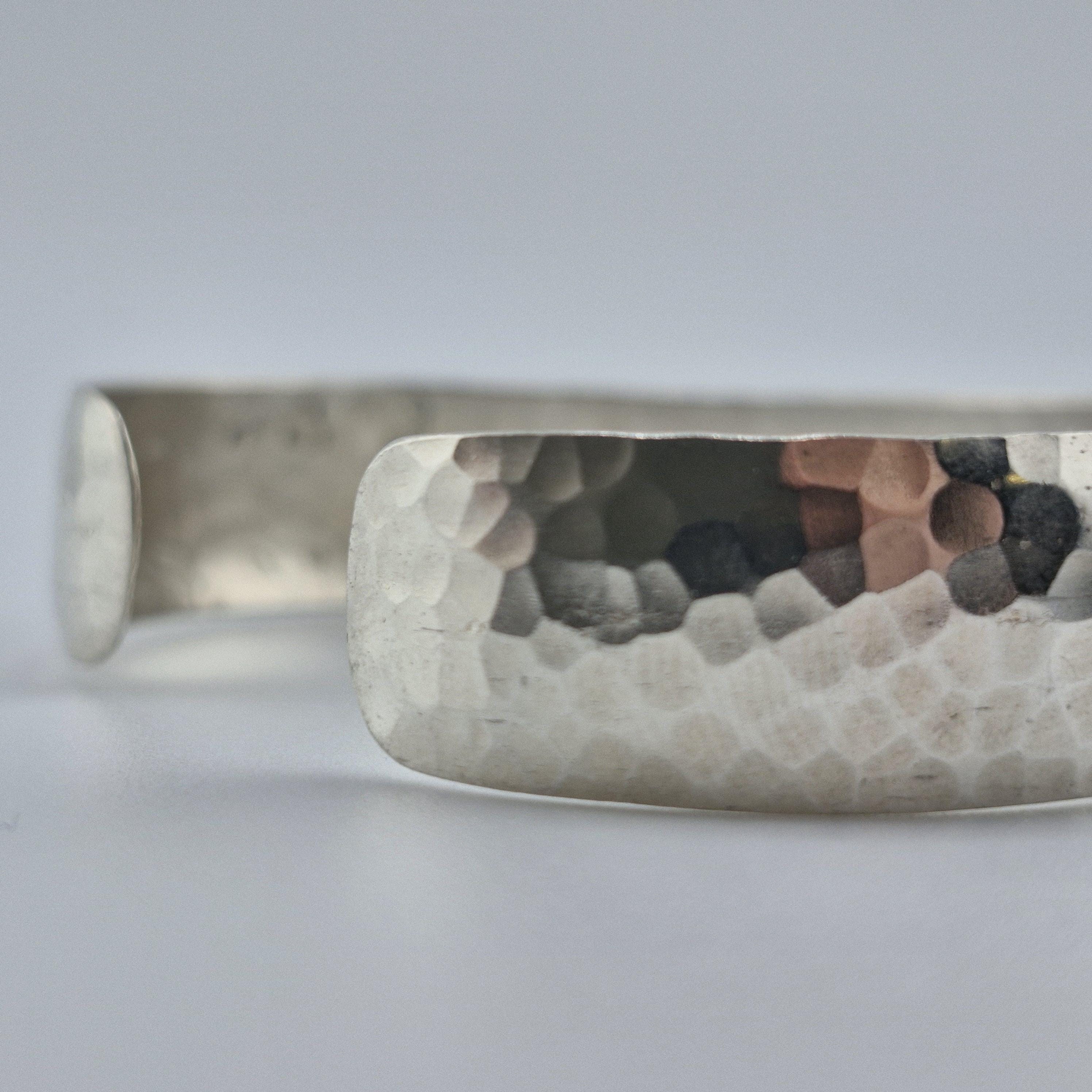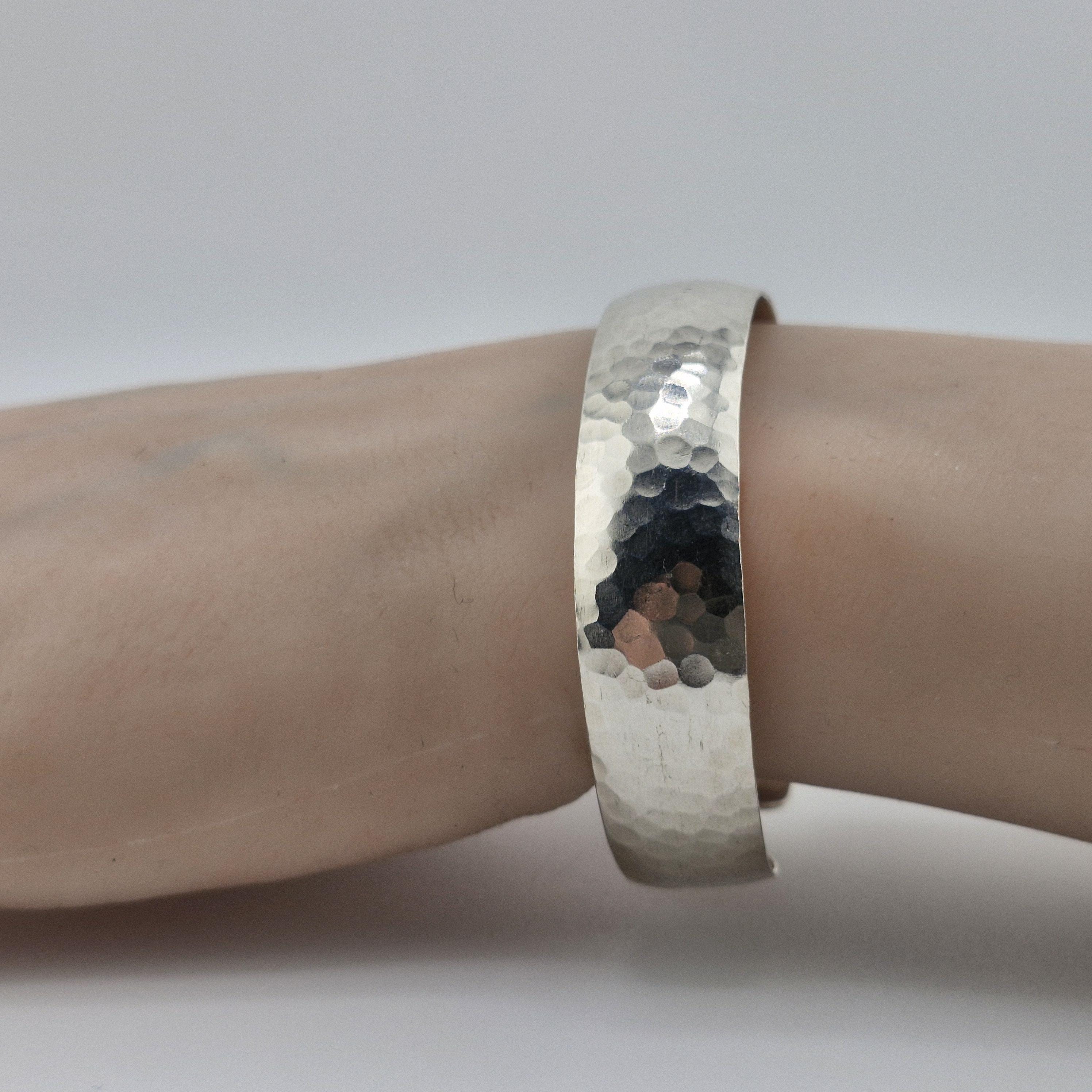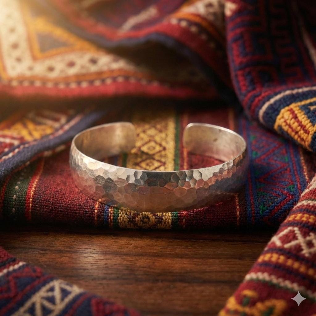 Featuring a gentle convex dome profile and a meticulously hand-hammered surface, this lustrous white metal bangle offers a premium, reassuring weight of 14 grams. The faceted texture is designed to capture the soft glow of golden hour, creating a rhythmic play of light that feels both ancient and futuristic.