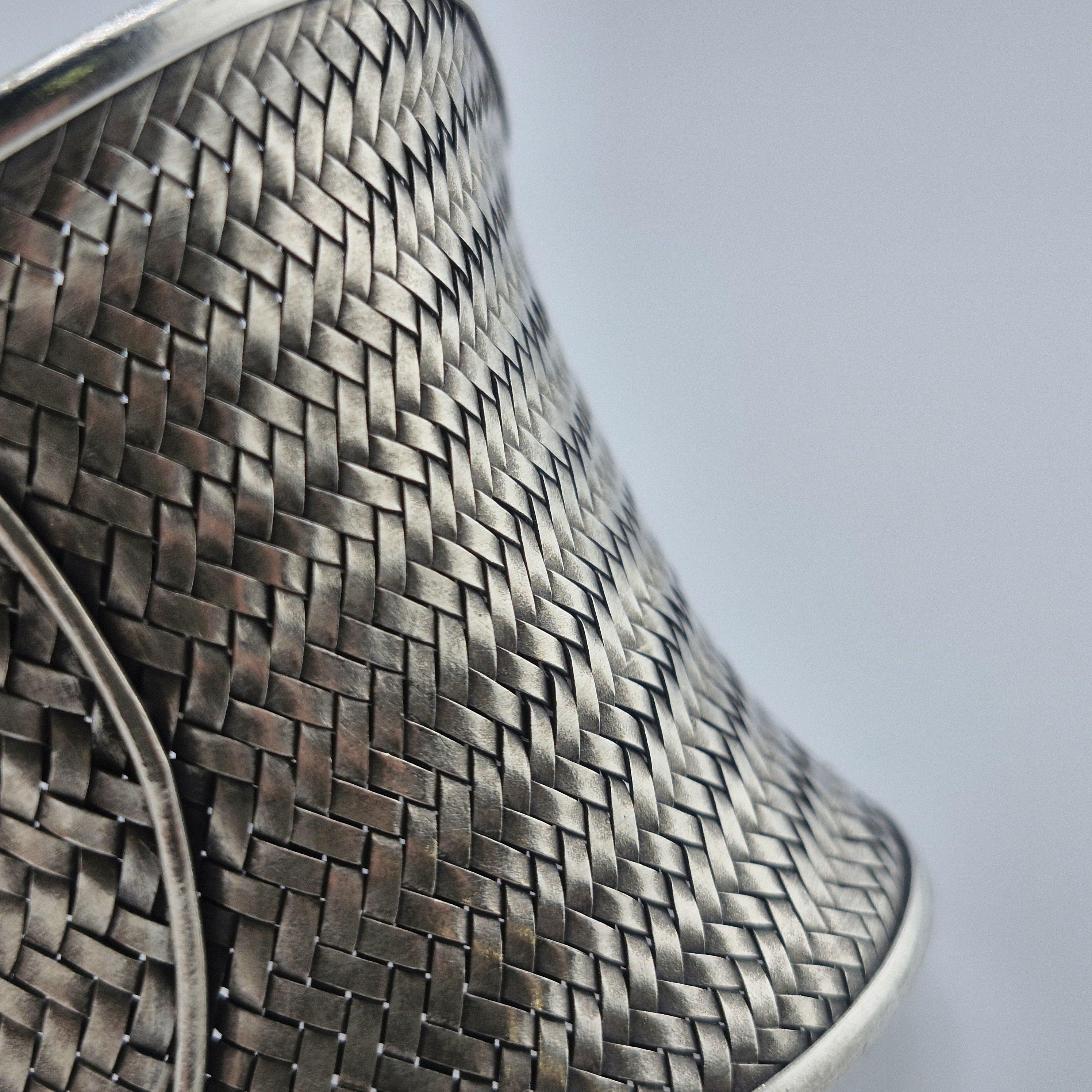 Expertly crafted with a dense, interlaced rattan-style weave, this lustrous white metal cuff tapers beautifully into a unique, flared "fish-tail" silhouette. With a substantial, grounding weight of 47 grams, it offers a premium feel that provides a sense of "Artisanal Armour." The rhythmic pattern of the weave creates a shimmering, tactile surface that transitions effortlessly from beachside retreats to elevated city evenings.