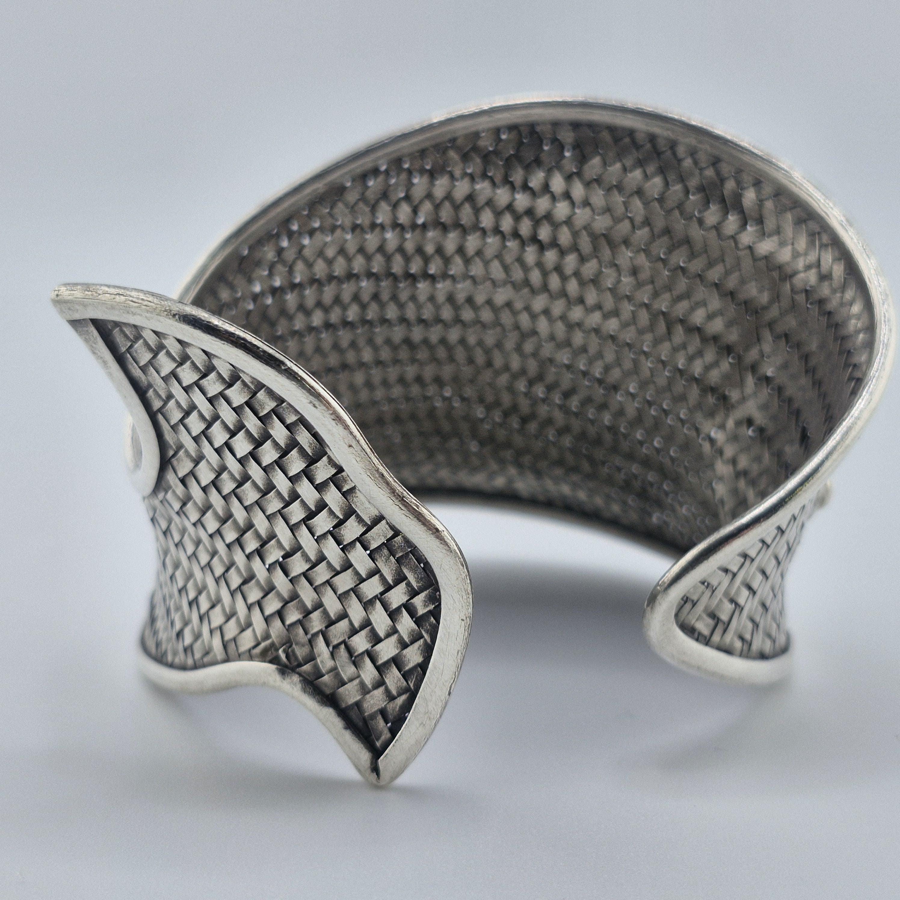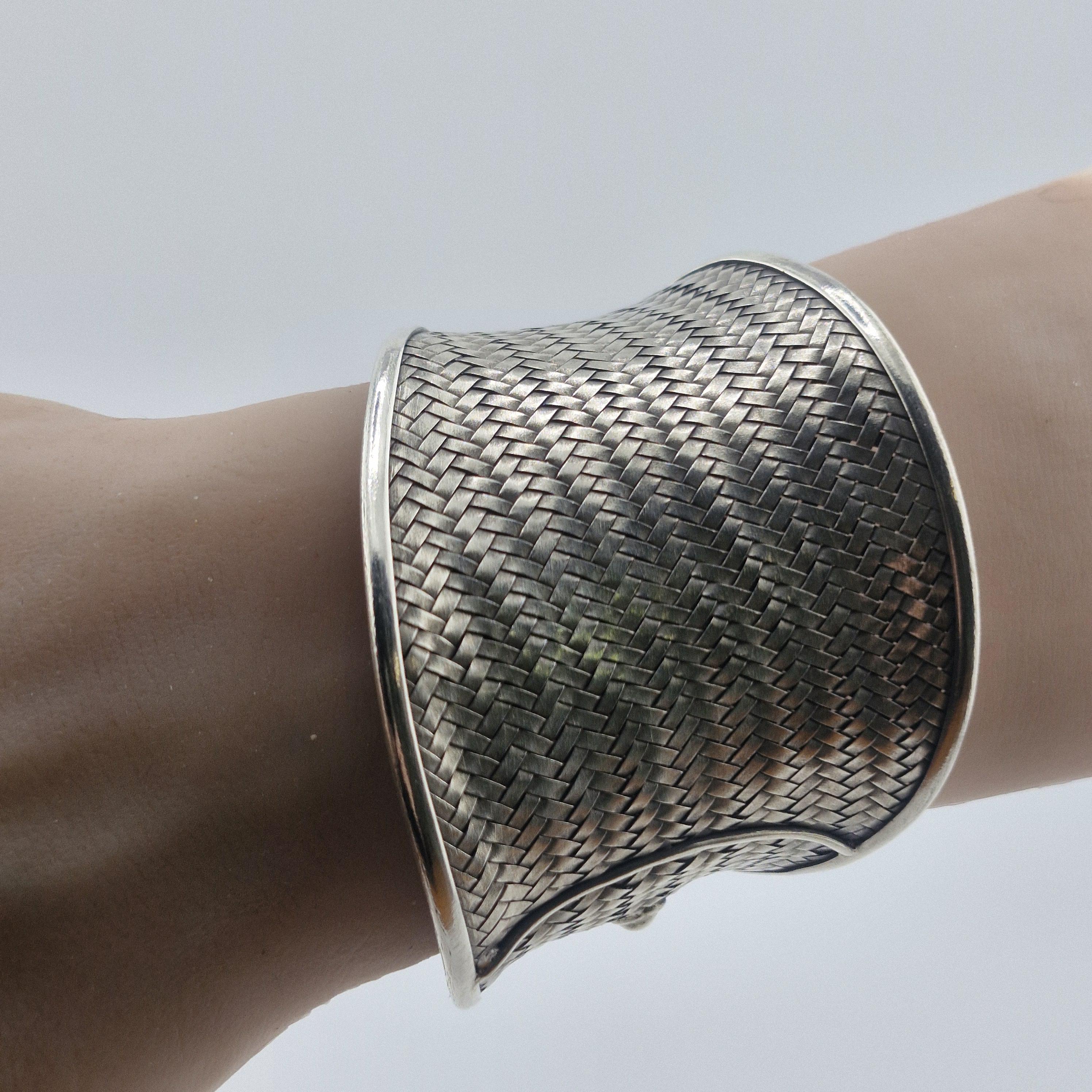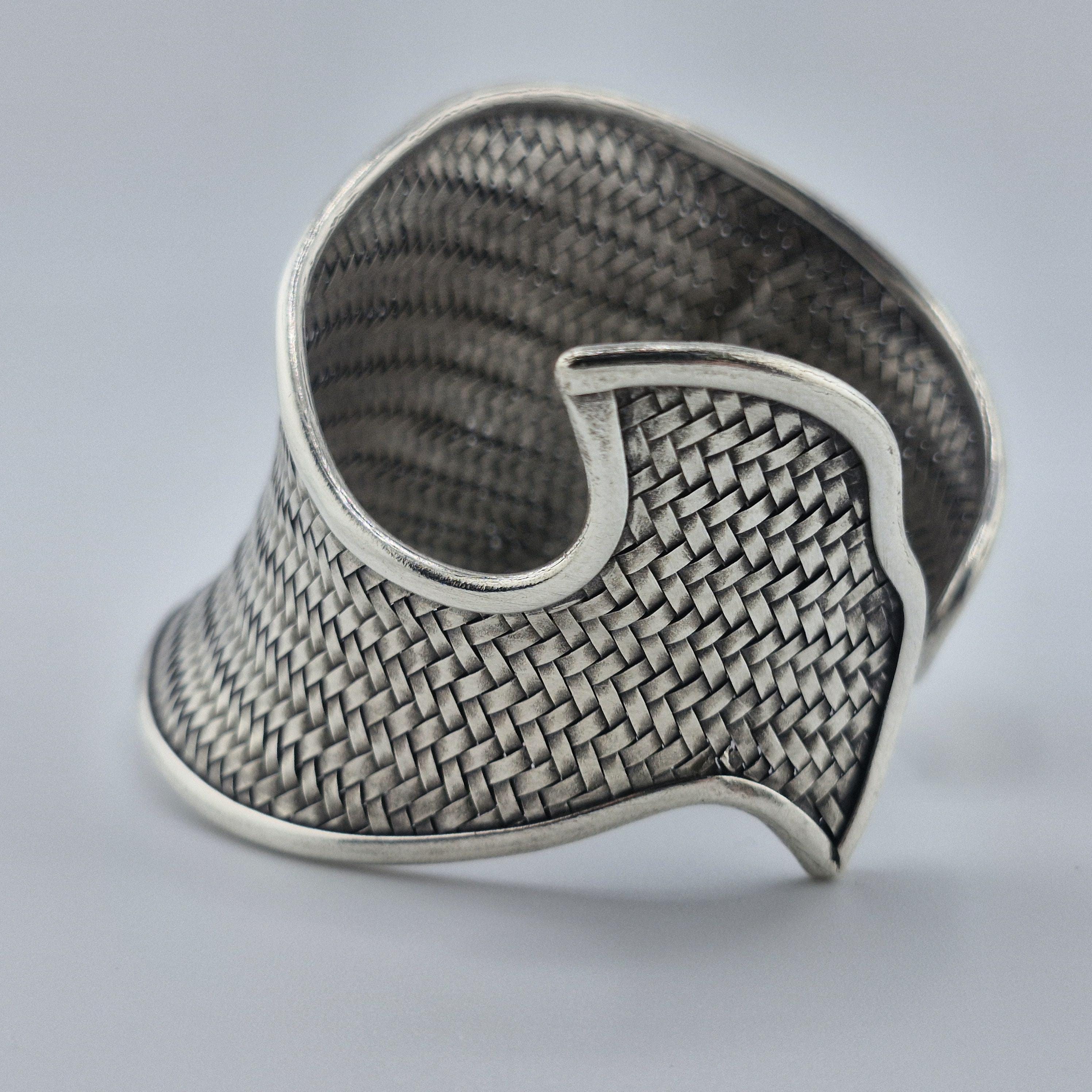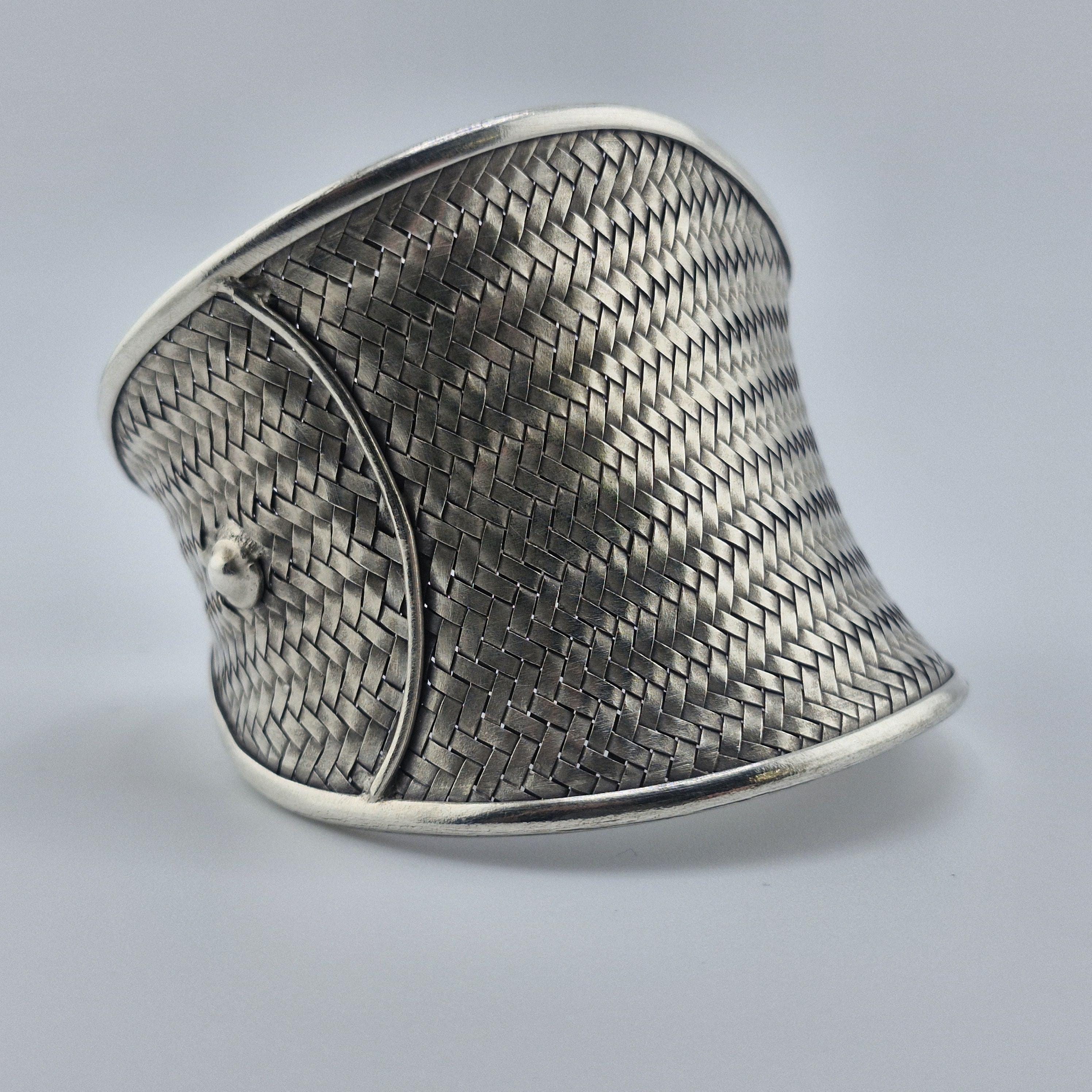 Design: Wide-profile cuff featuring an intricate hand-woven "rattan" texture and tapered fish-shape profile.