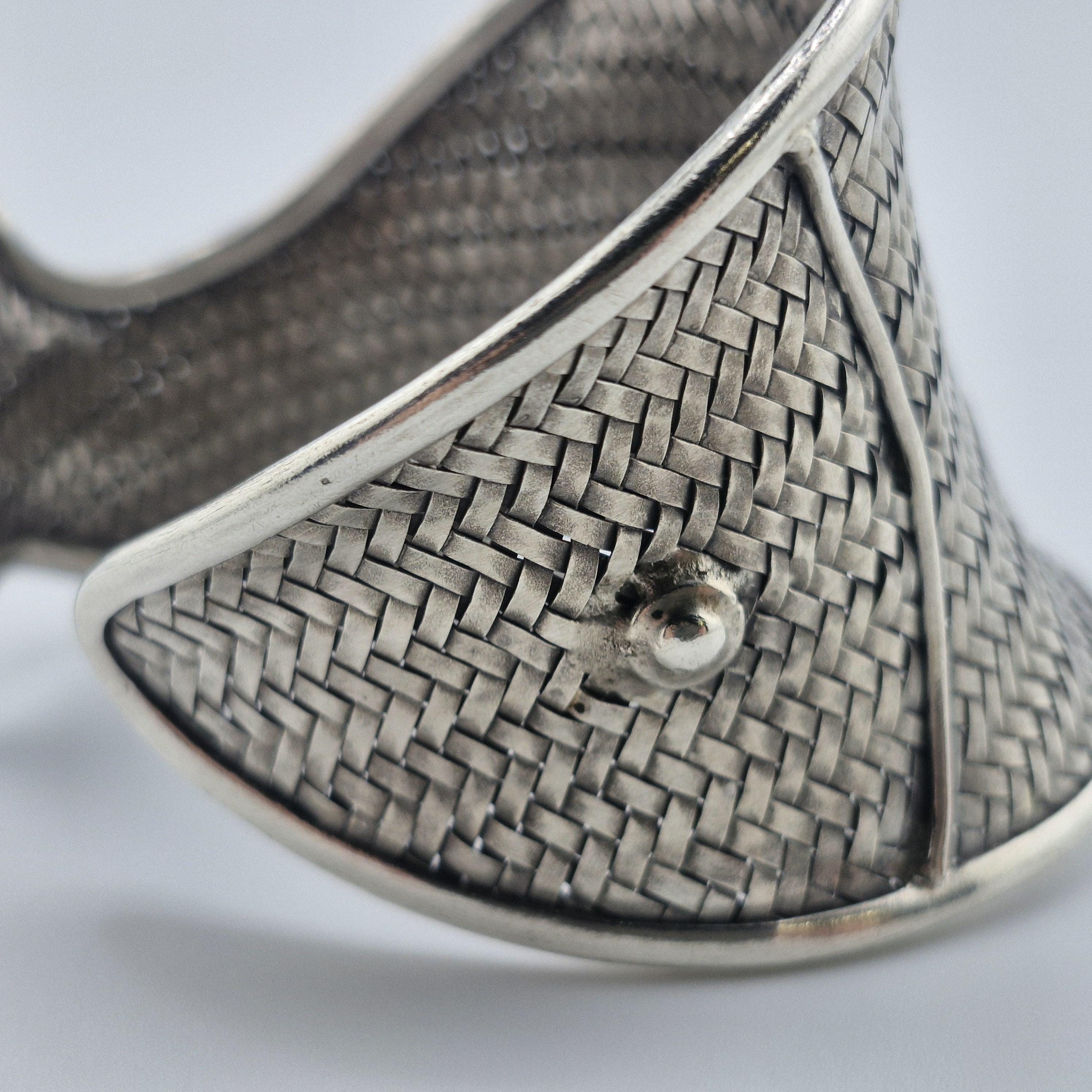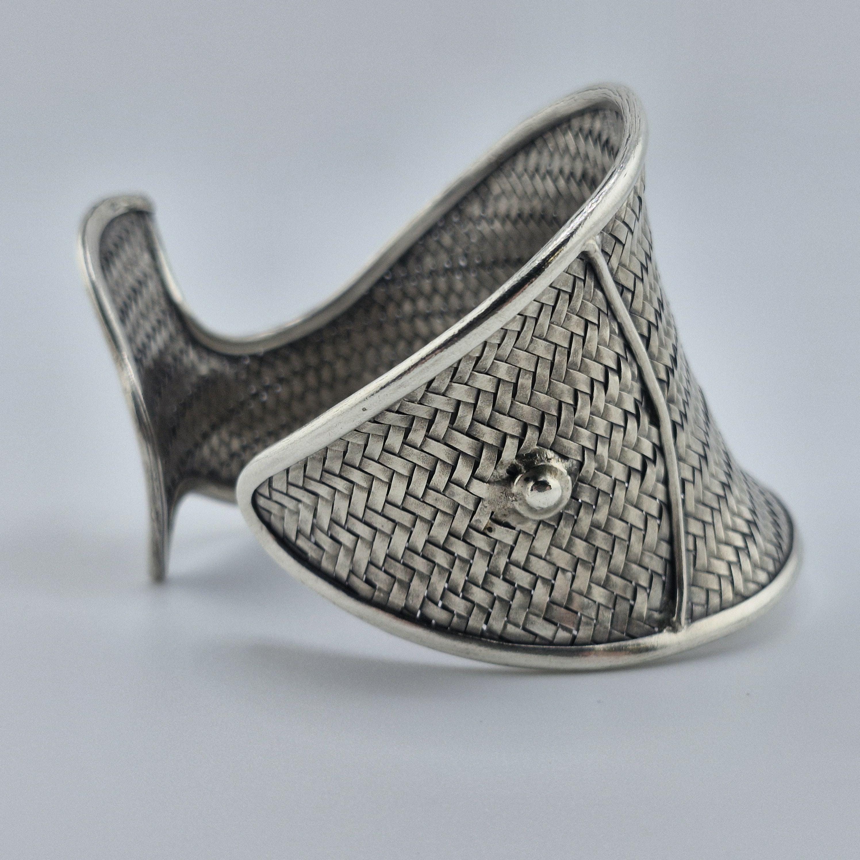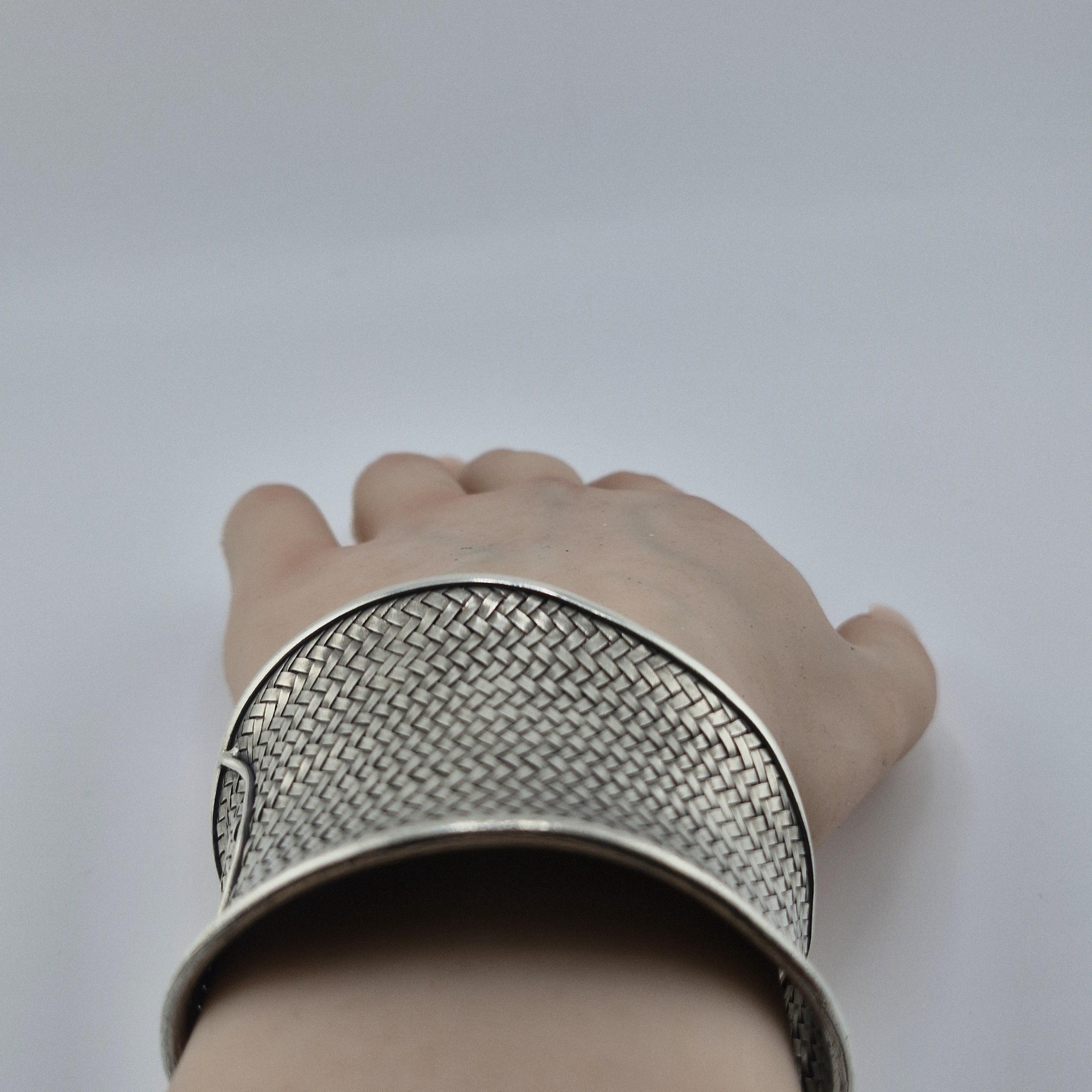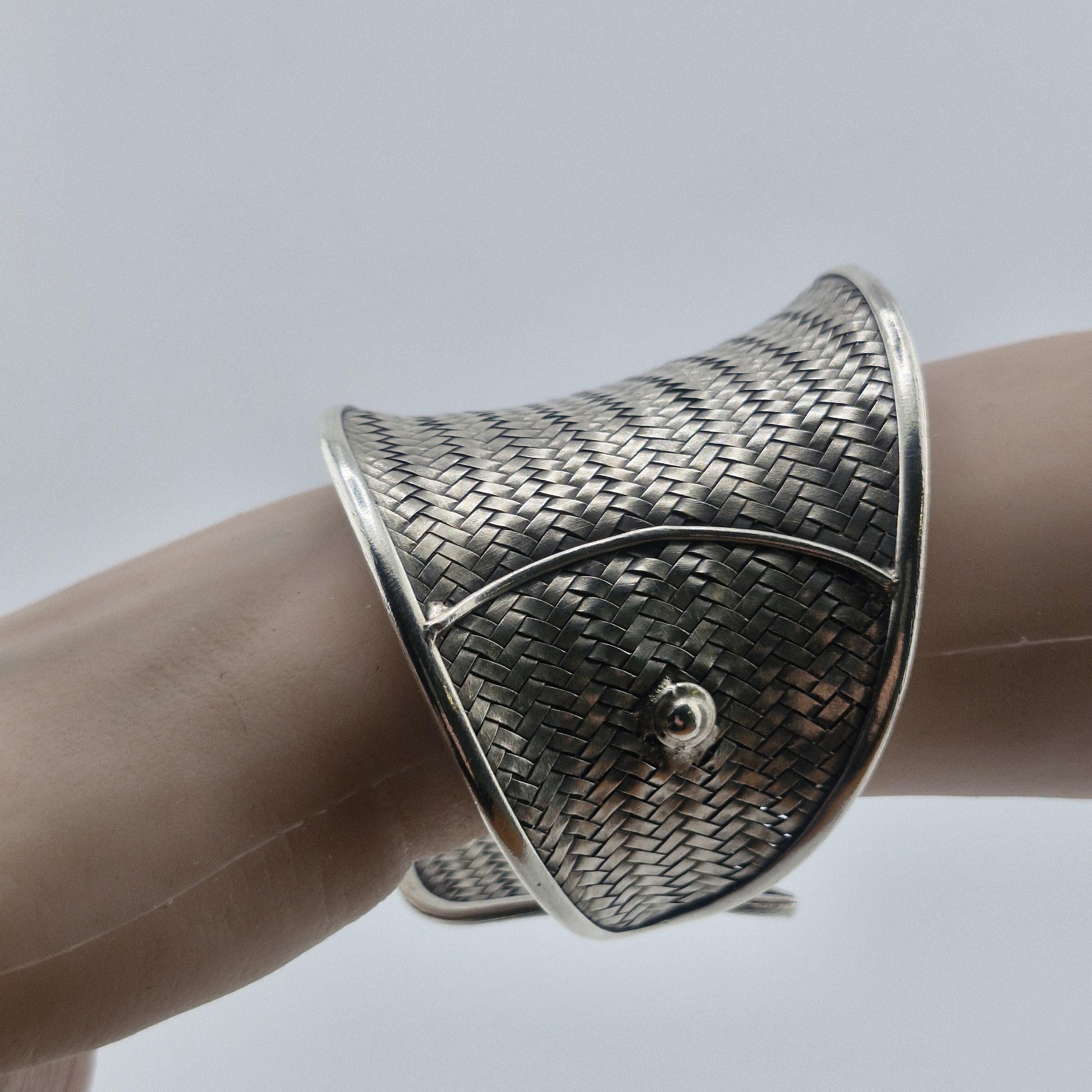 Design: Wide-profile cuff featuring an intricate hand-woven "rattan" texture and tapered fish-shape profile.