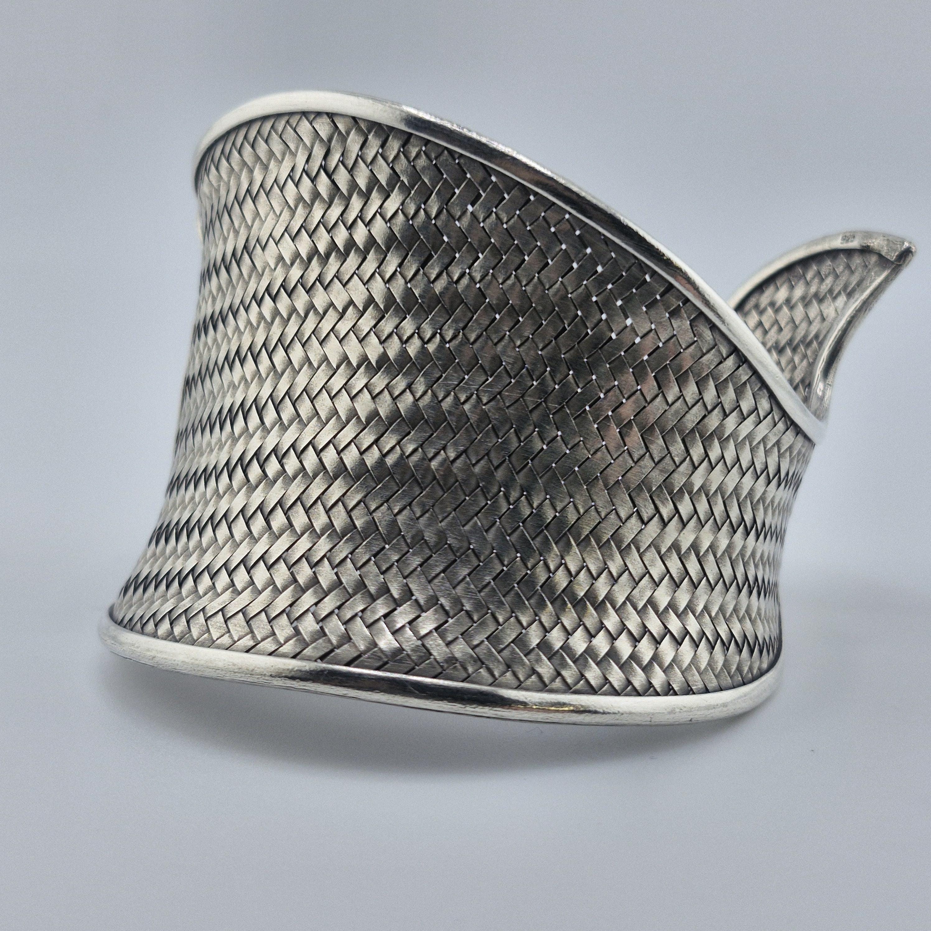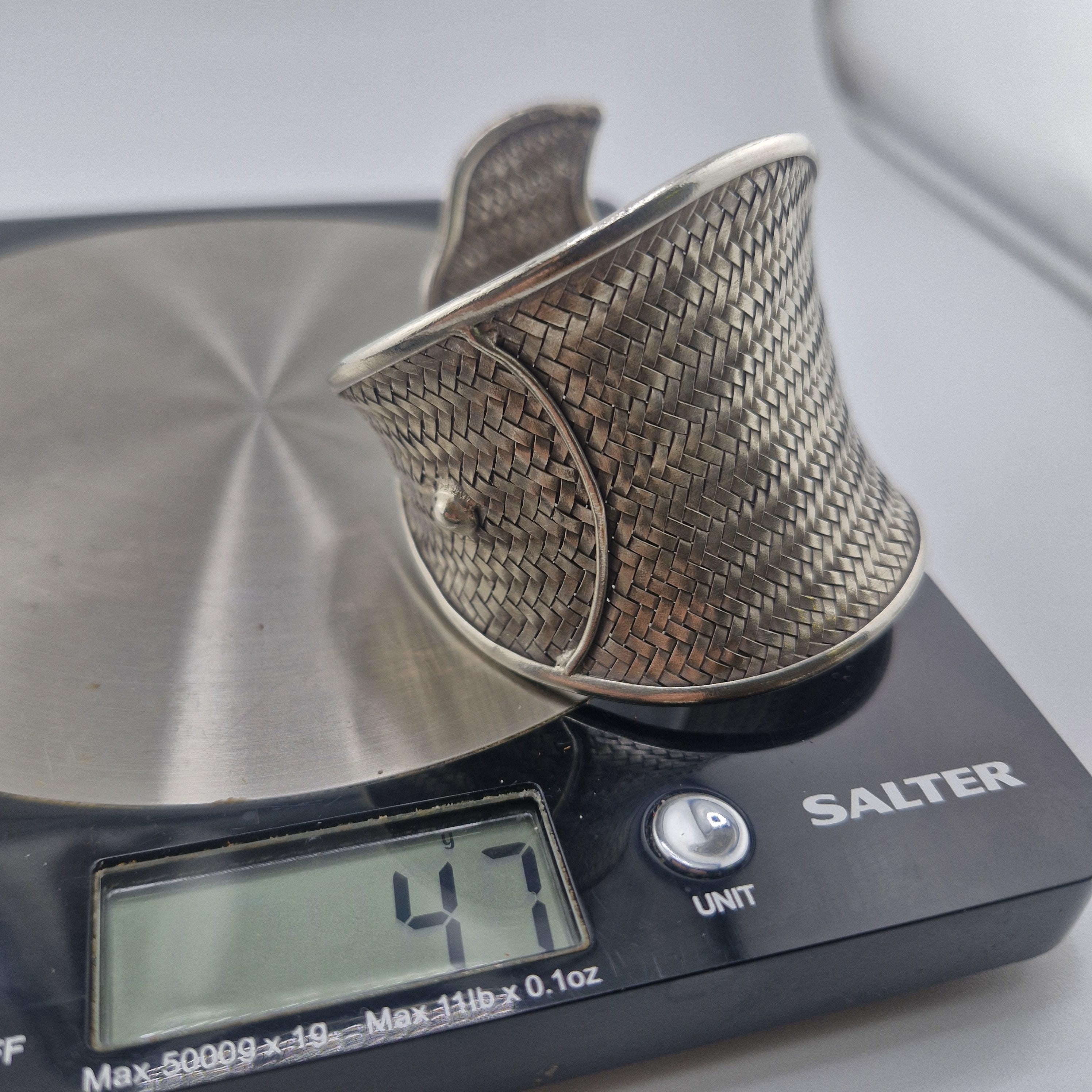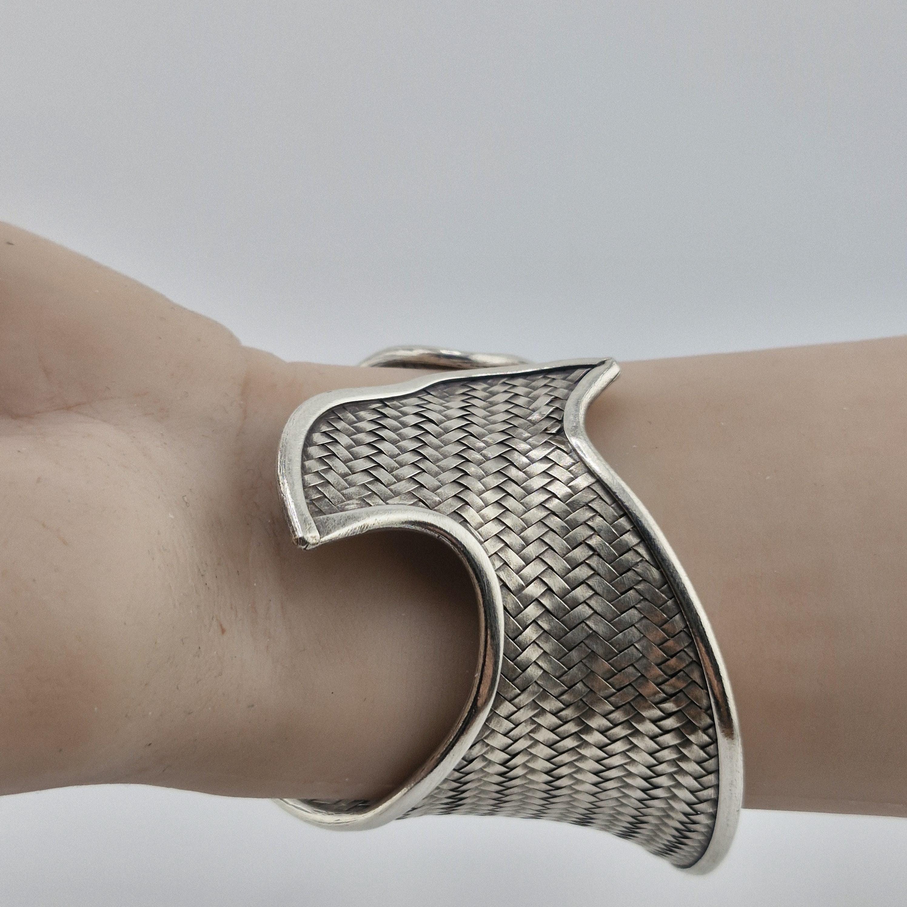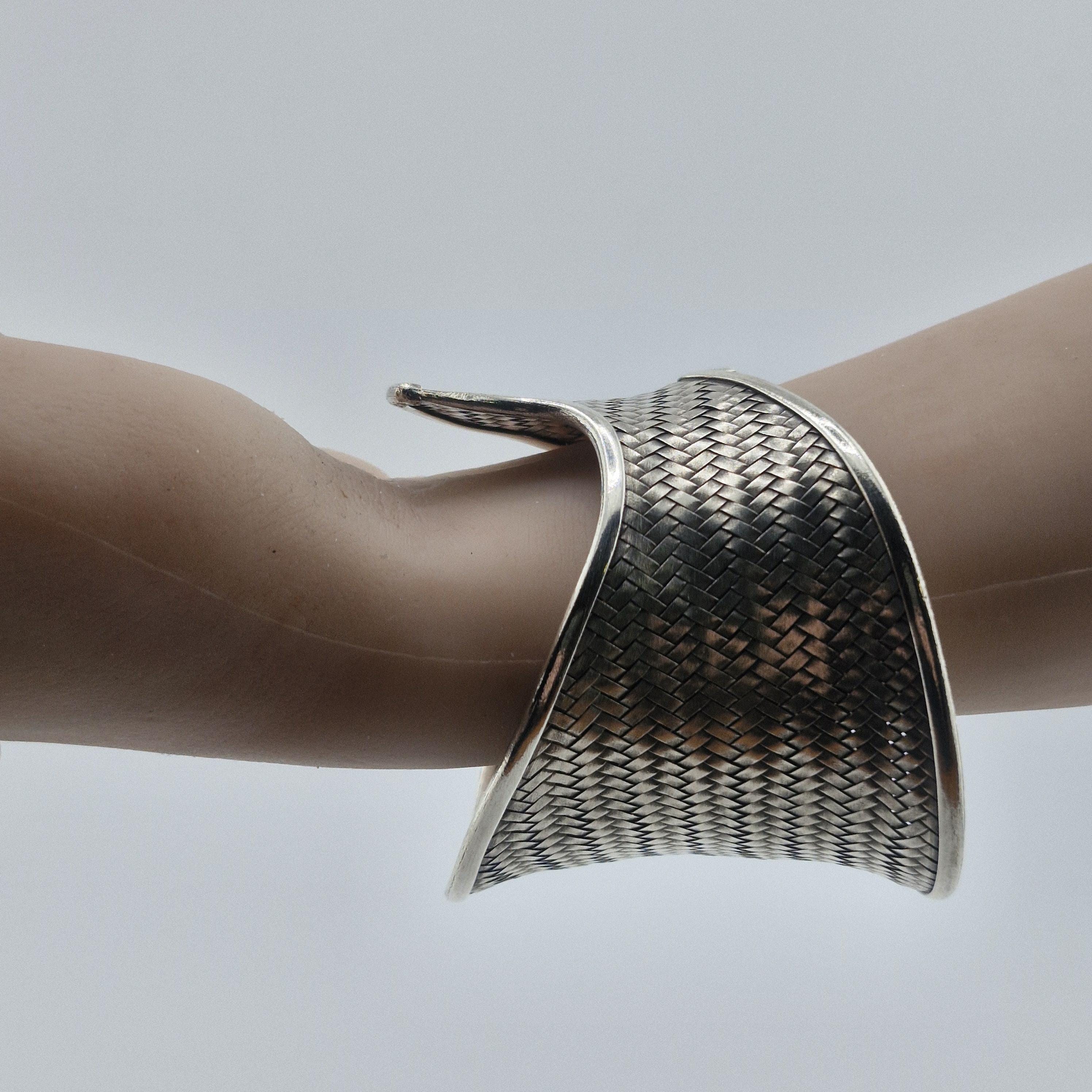 Design: Wide-profile cuff featuring an intricate hand-woven "rattan" texture and tapered fish-shape profile.