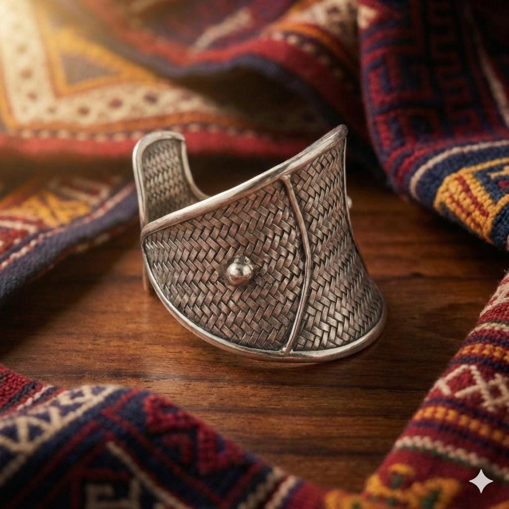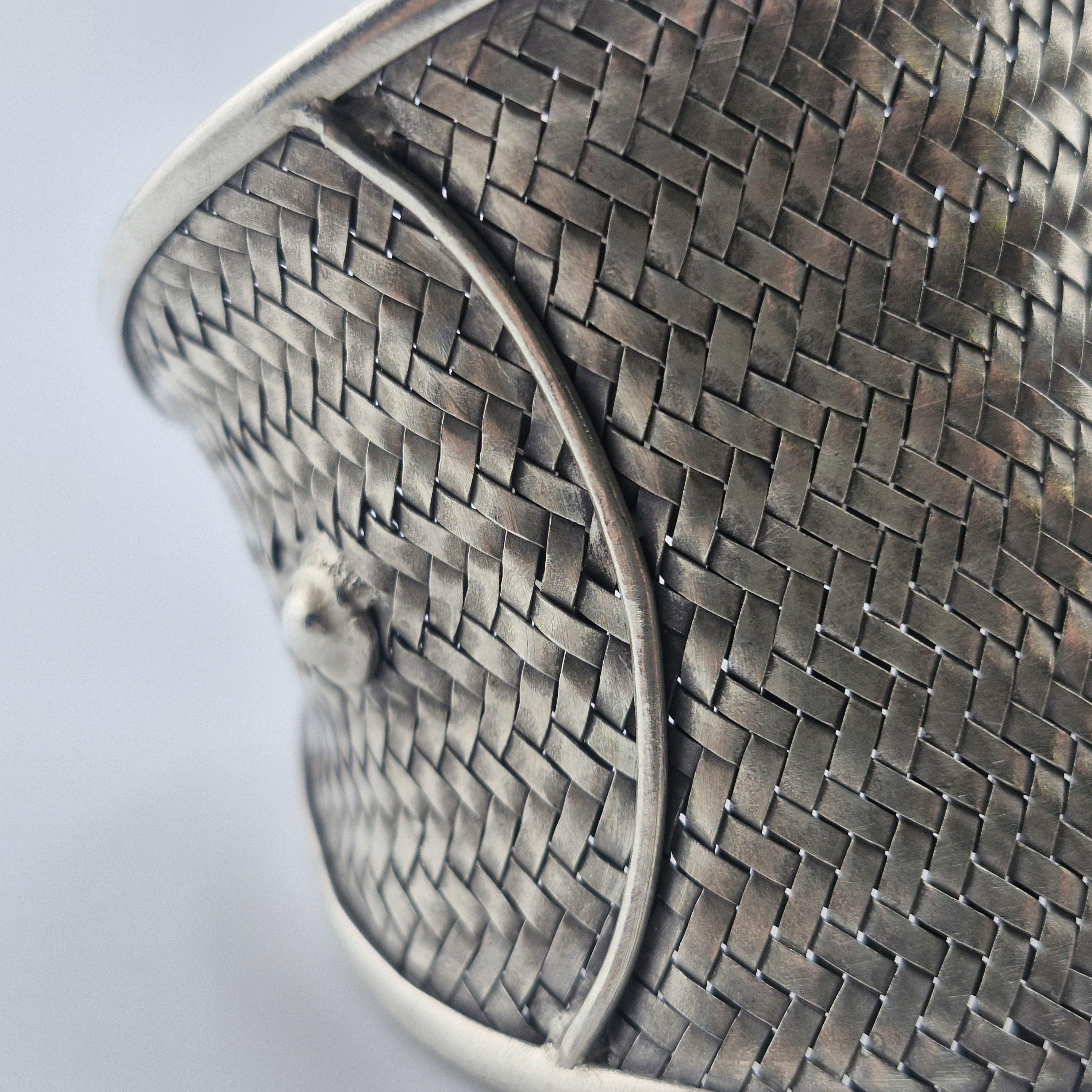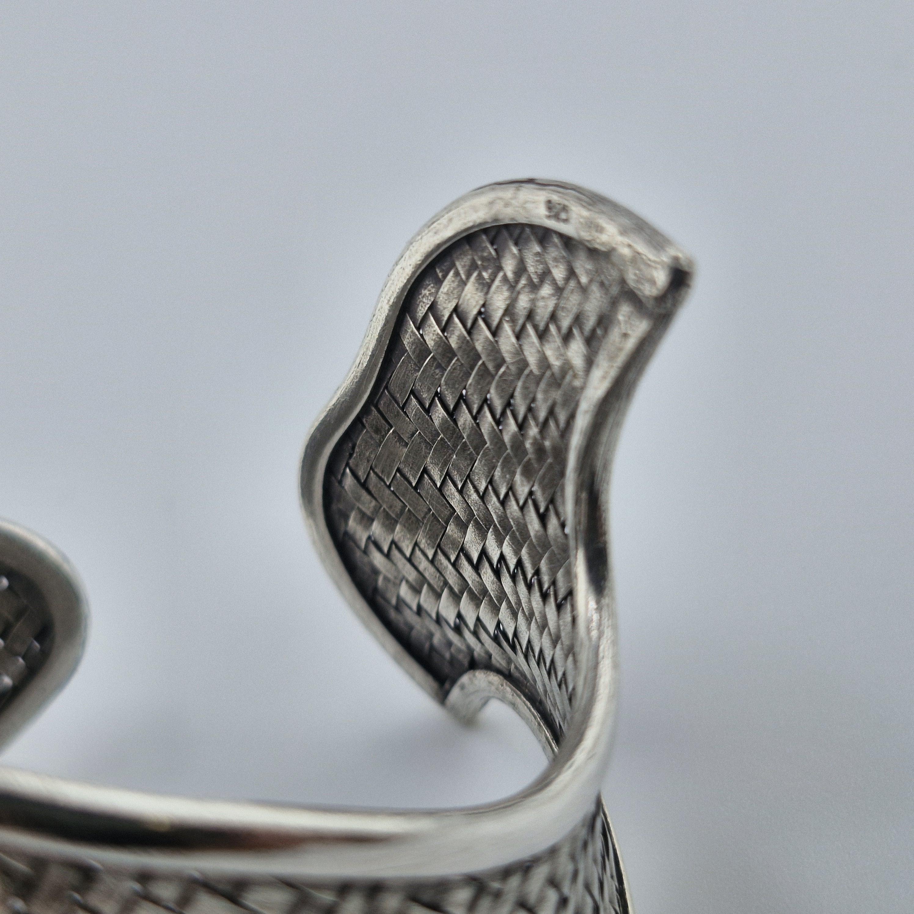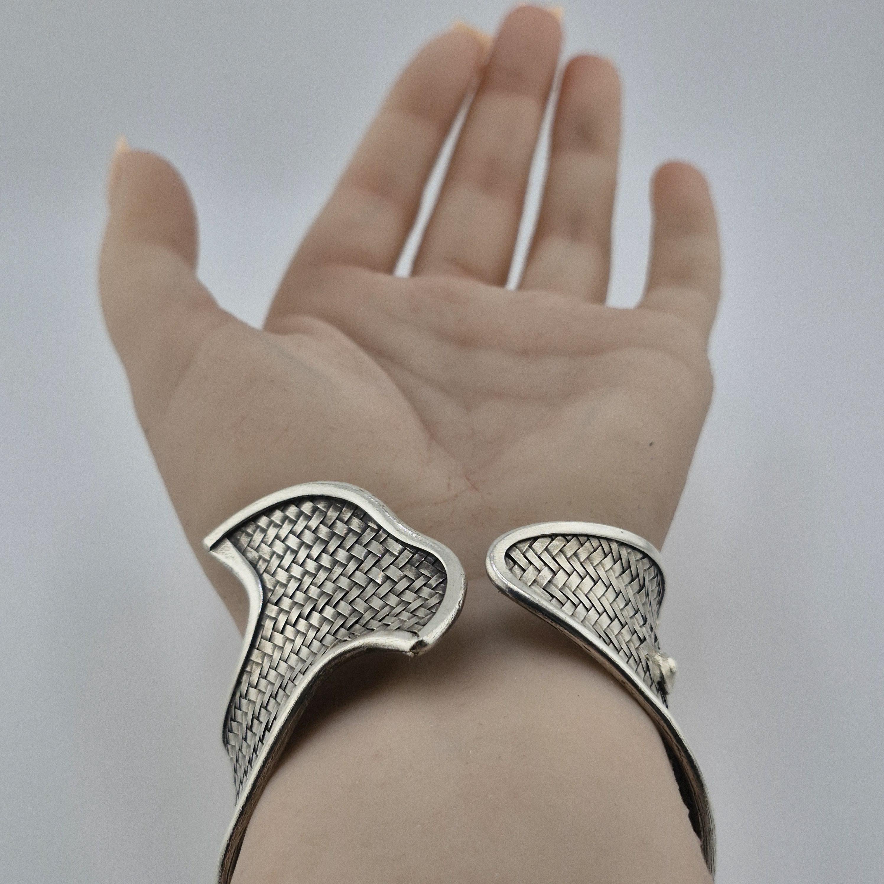 Design: Wide-profile cuff featuring an intricate hand-woven "rattan" texture and tapered fish-shape profile.