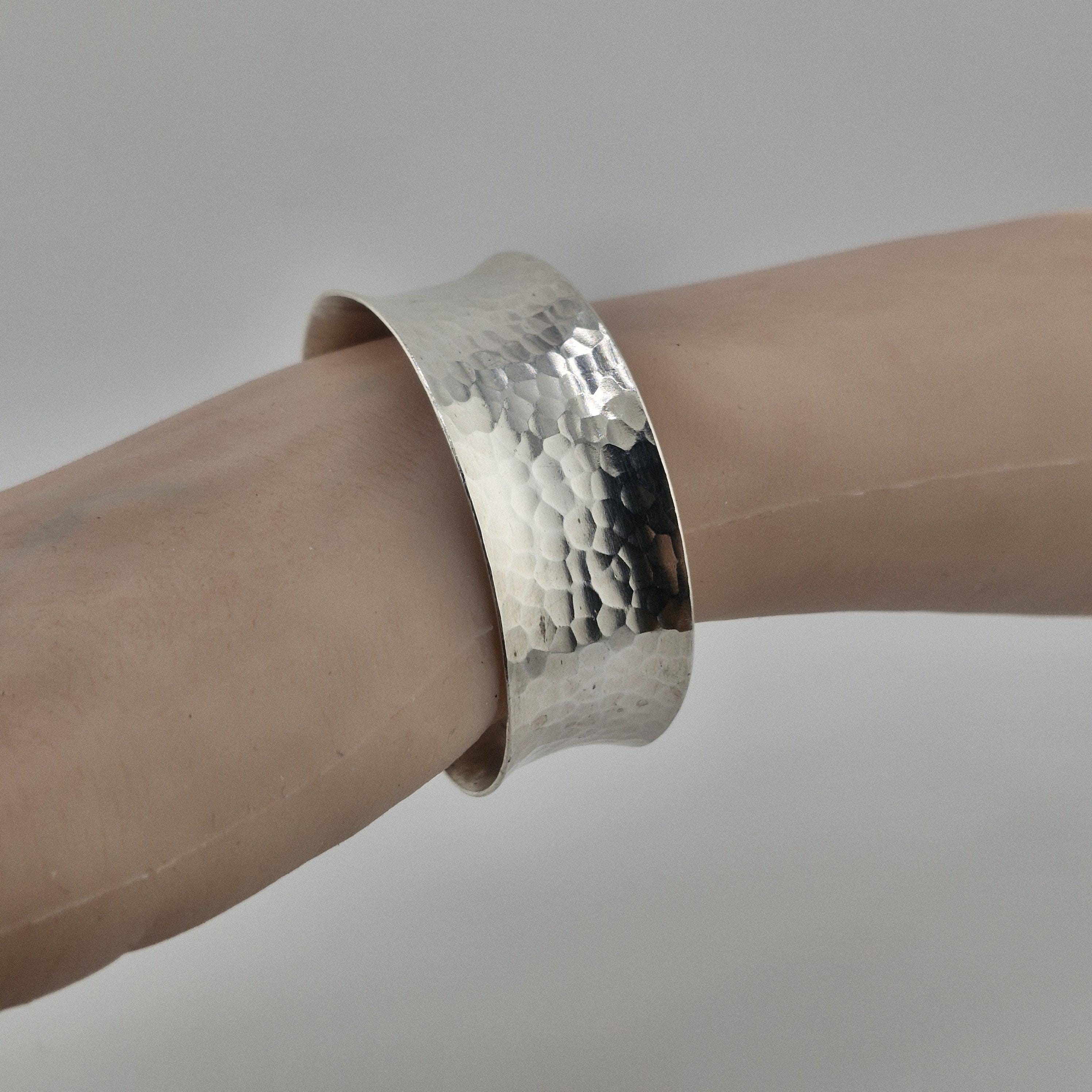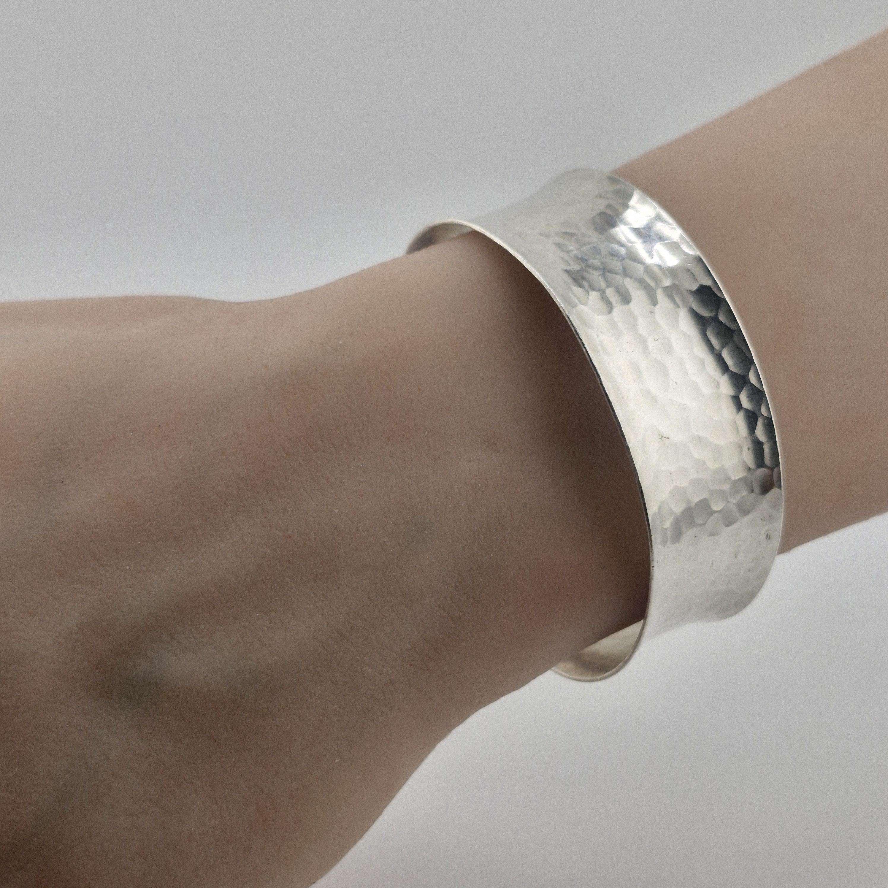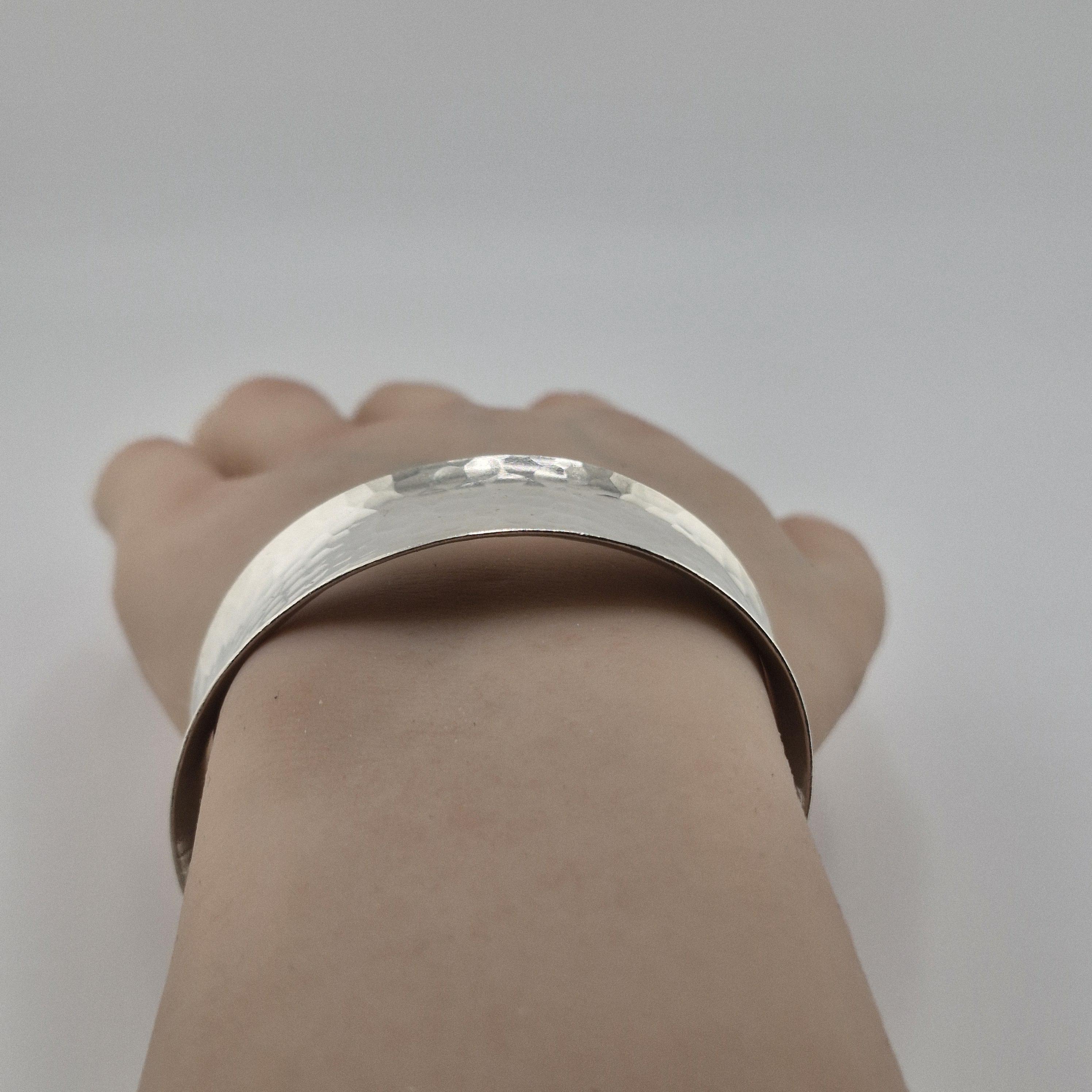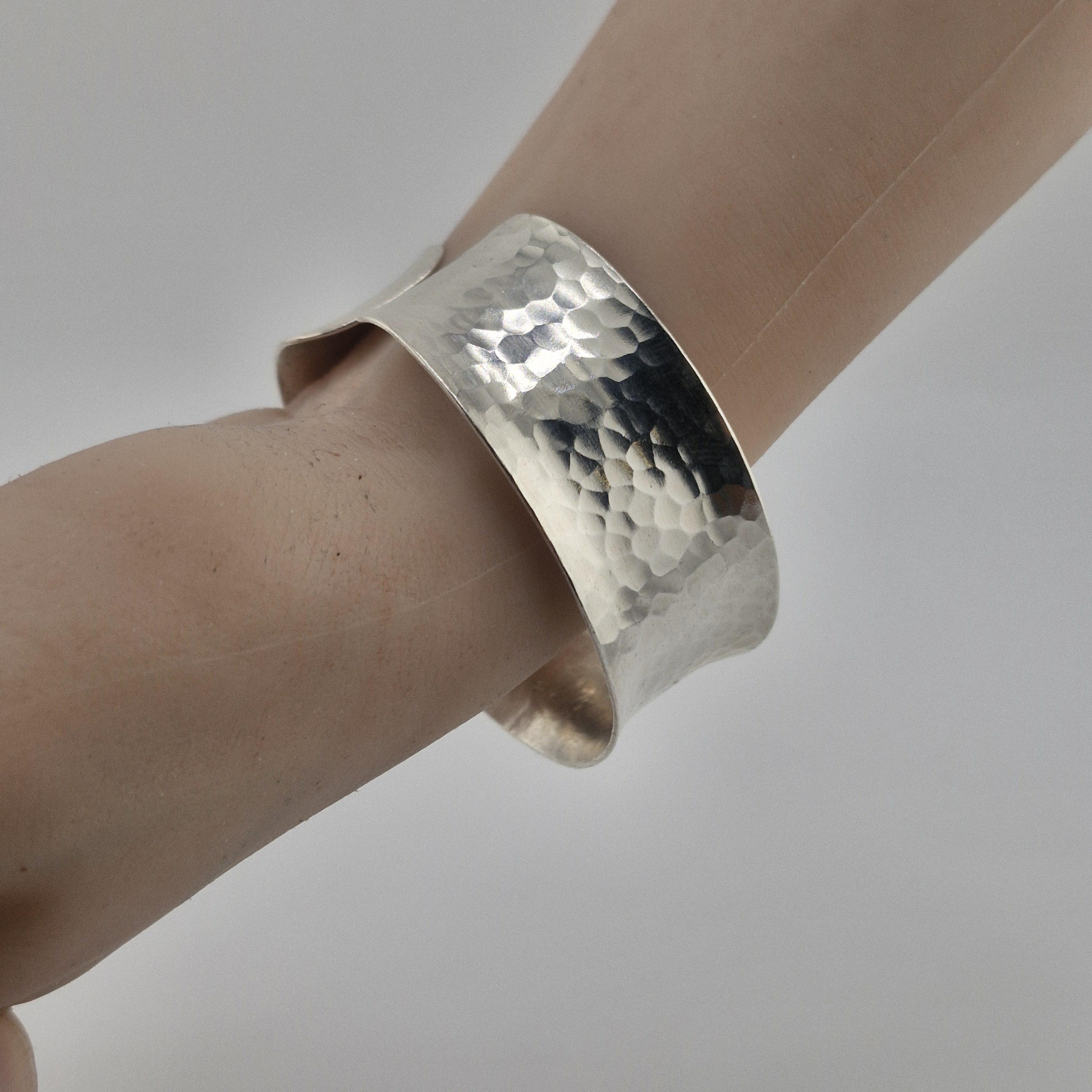 Featuring a gentle convex dome profile and a meticulously hand-hammered surface, this lustrous white metal bangle offers a premium, reassuring weight of 20 grams. The faceted texture is designed to capture and reflect the light with a rhythmic glow, creating a "liquid metal" effect that transitions effortlessly from day to night.