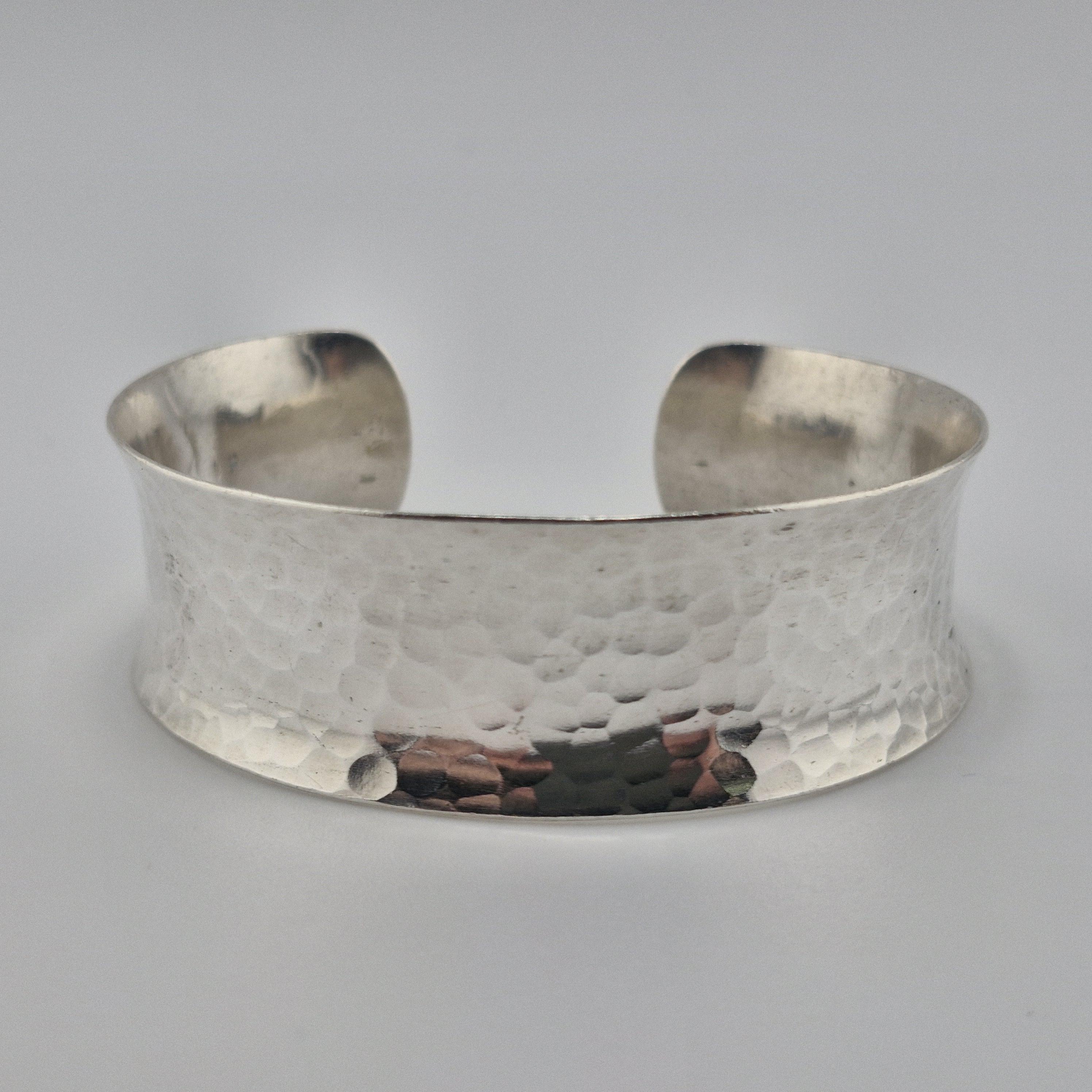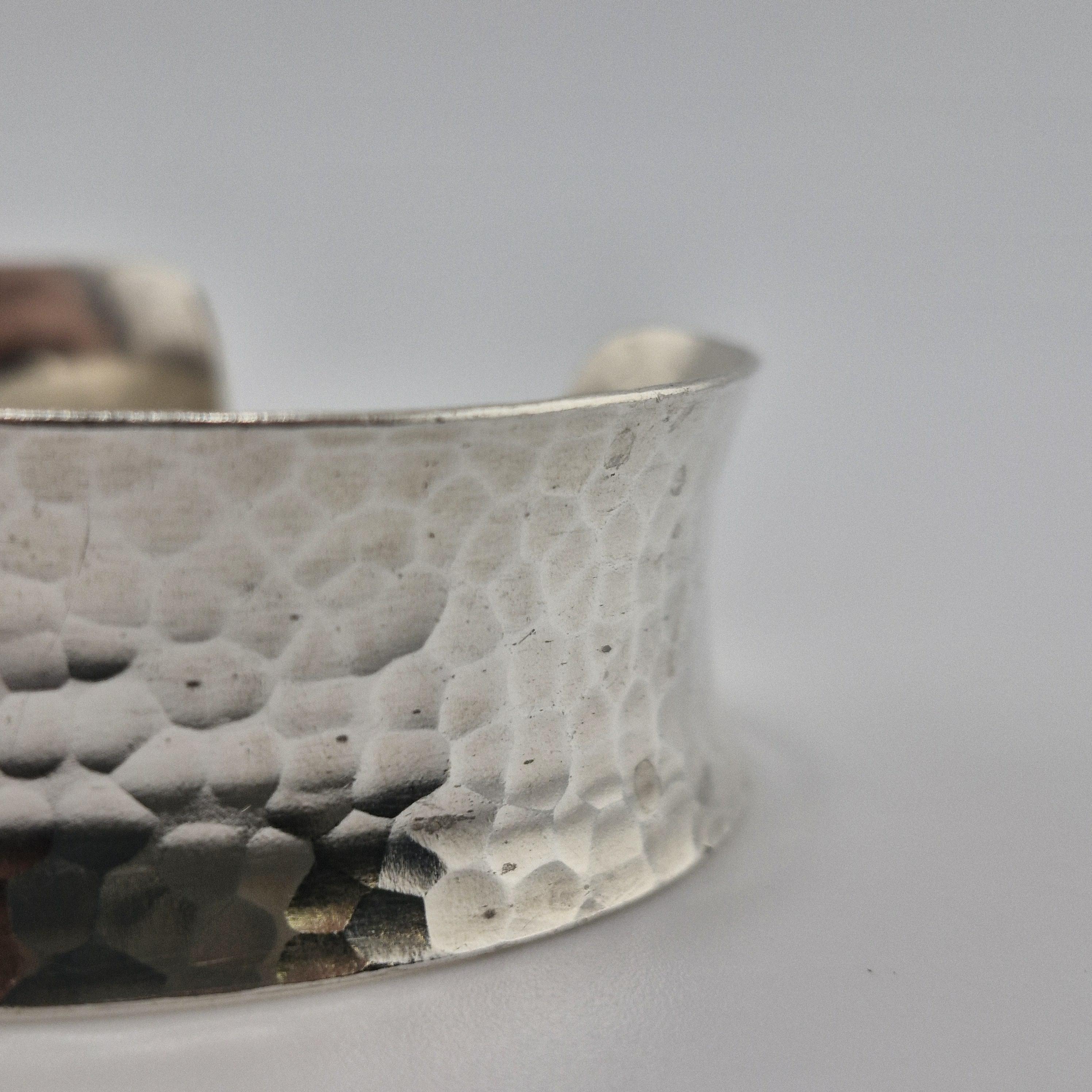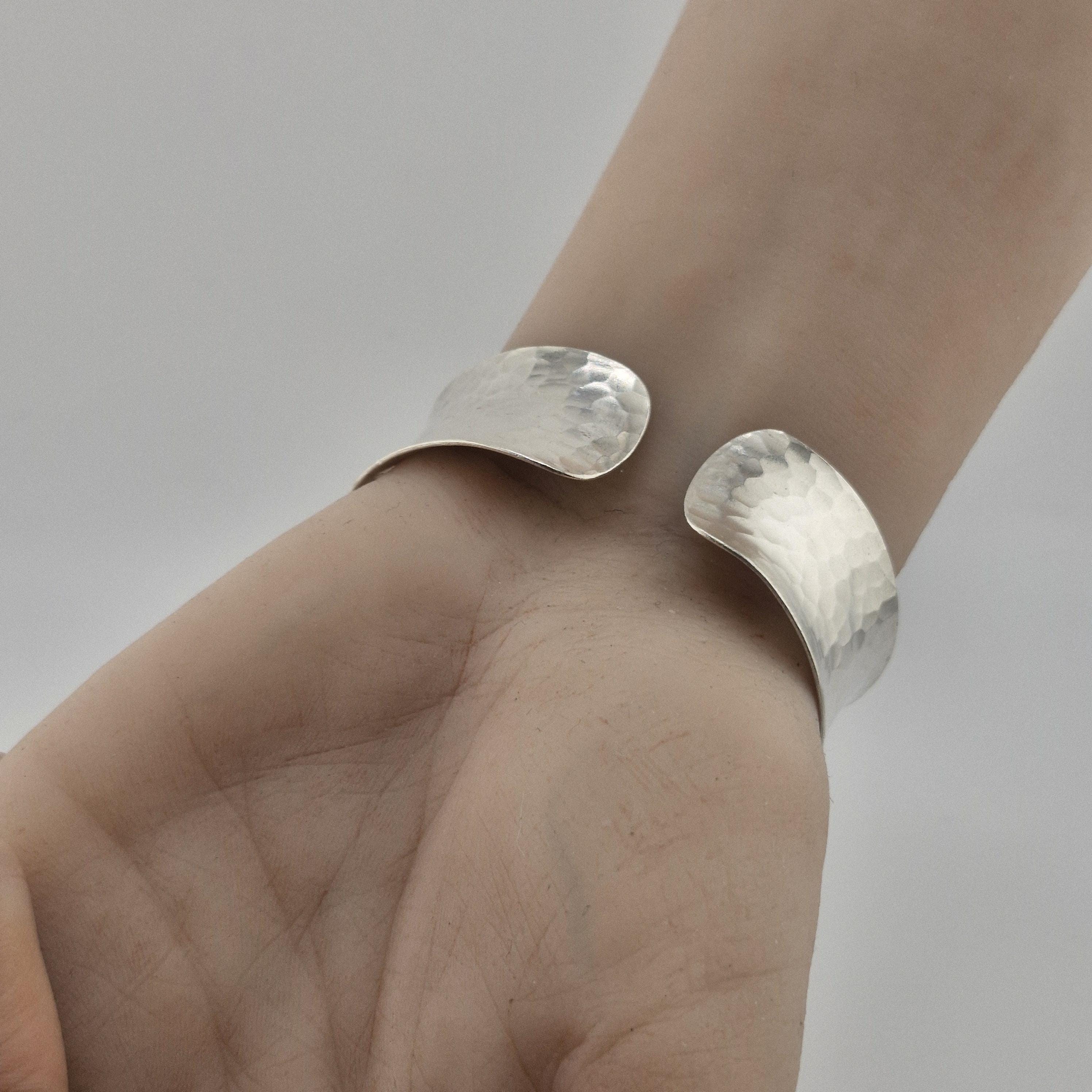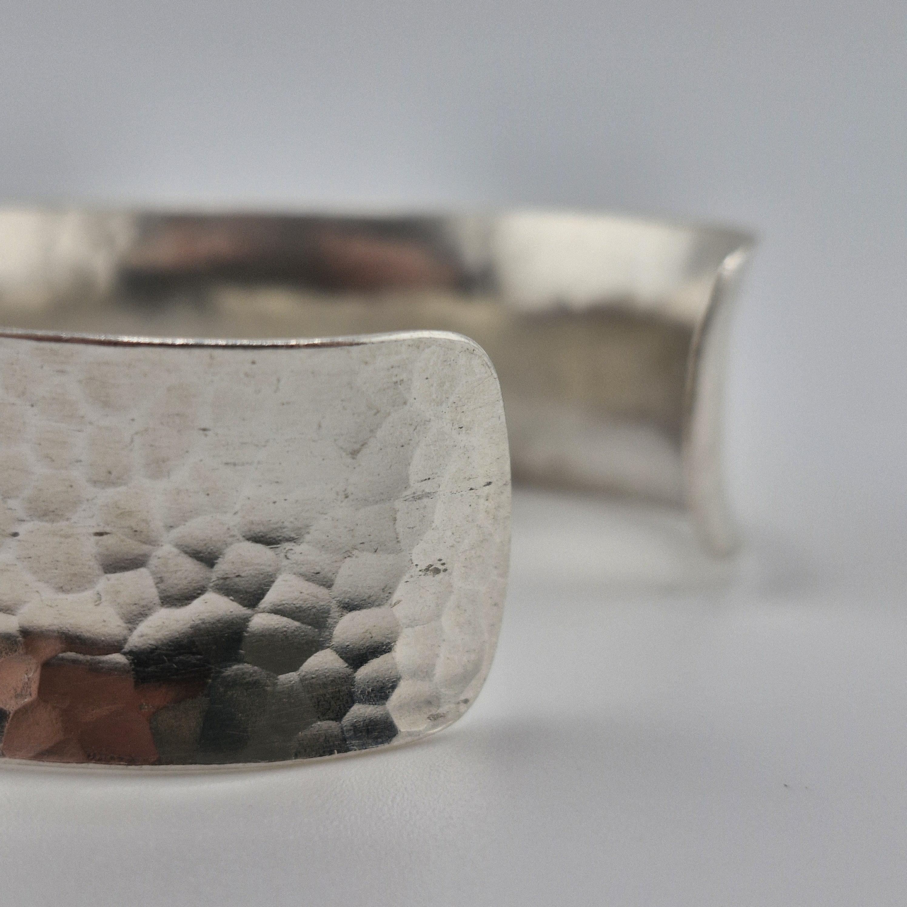 Featuring a gentle convex dome profile and a meticulously hand-hammered surface, this lustrous white metal bangle offers a premium, reassuring weight of 20 grams. The faceted texture is designed to capture and reflect the light with a rhythmic glow, creating a "liquid metal" effect that transitions effortlessly from day to night.