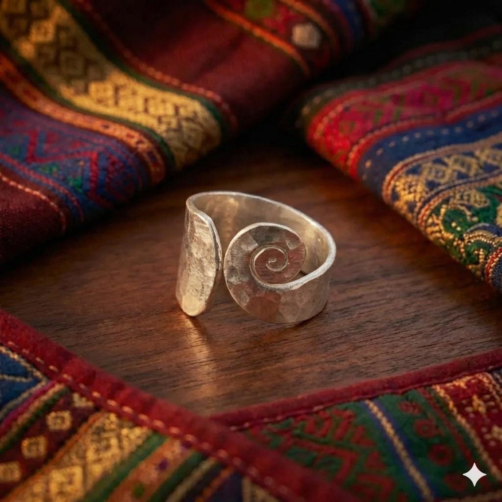Imagine yourself wandering through a sun-drenched coastal market or settled in a quiet, ivy-covered café with a leather-bound journal. You reach for your coffee, and the light catches the hand-hammered texture of your Boho Circle spiral ring—a piece that feels as grounded and unique as your own journey.