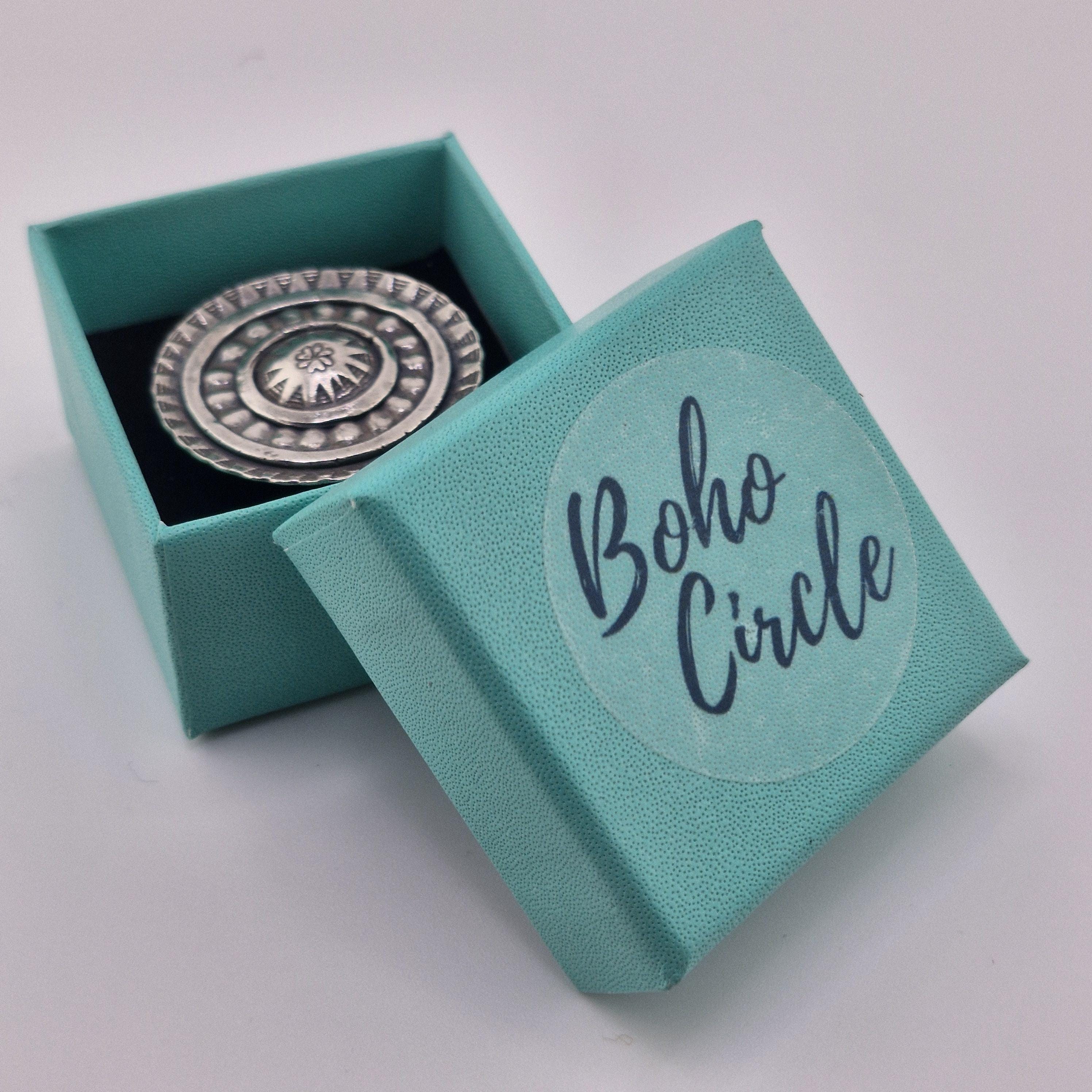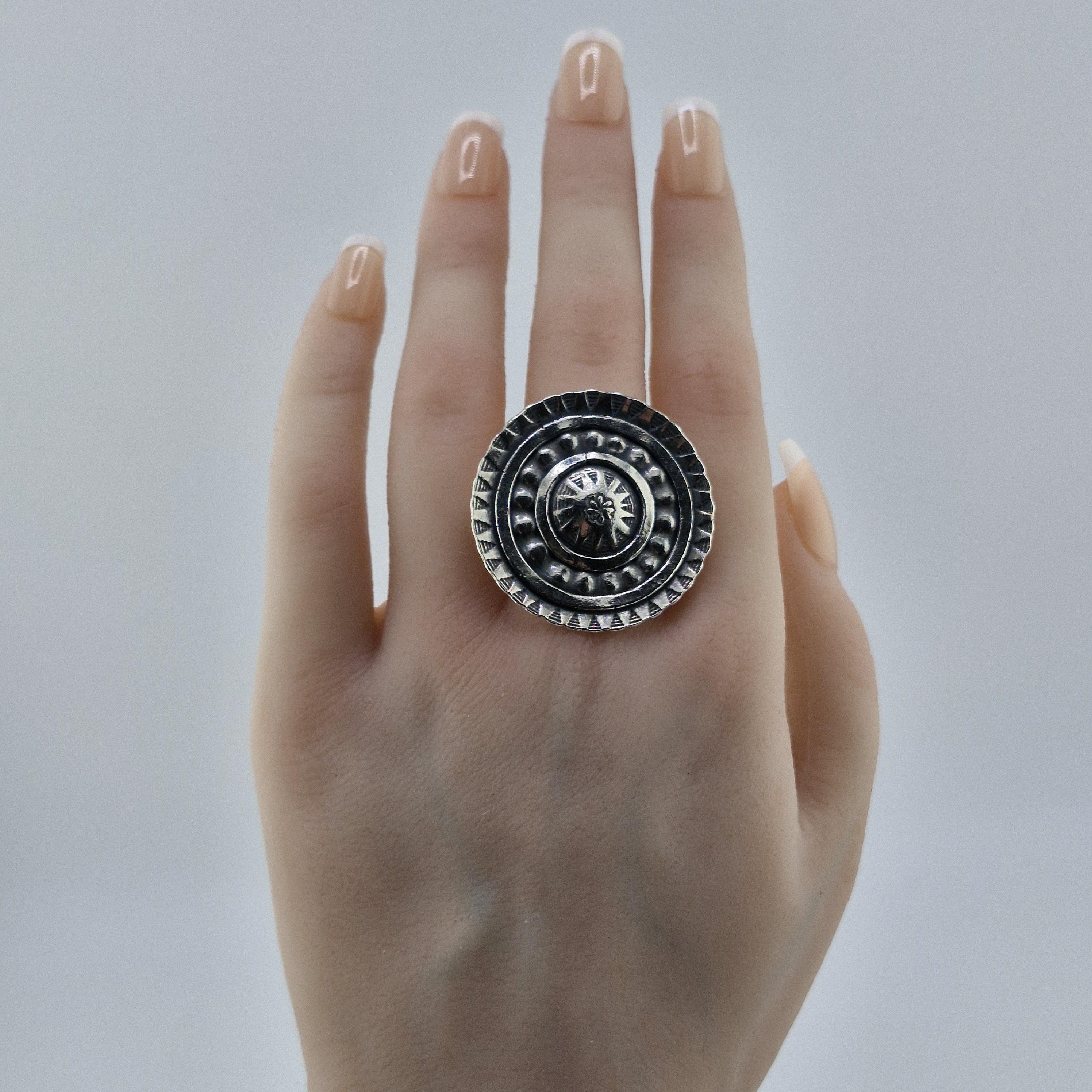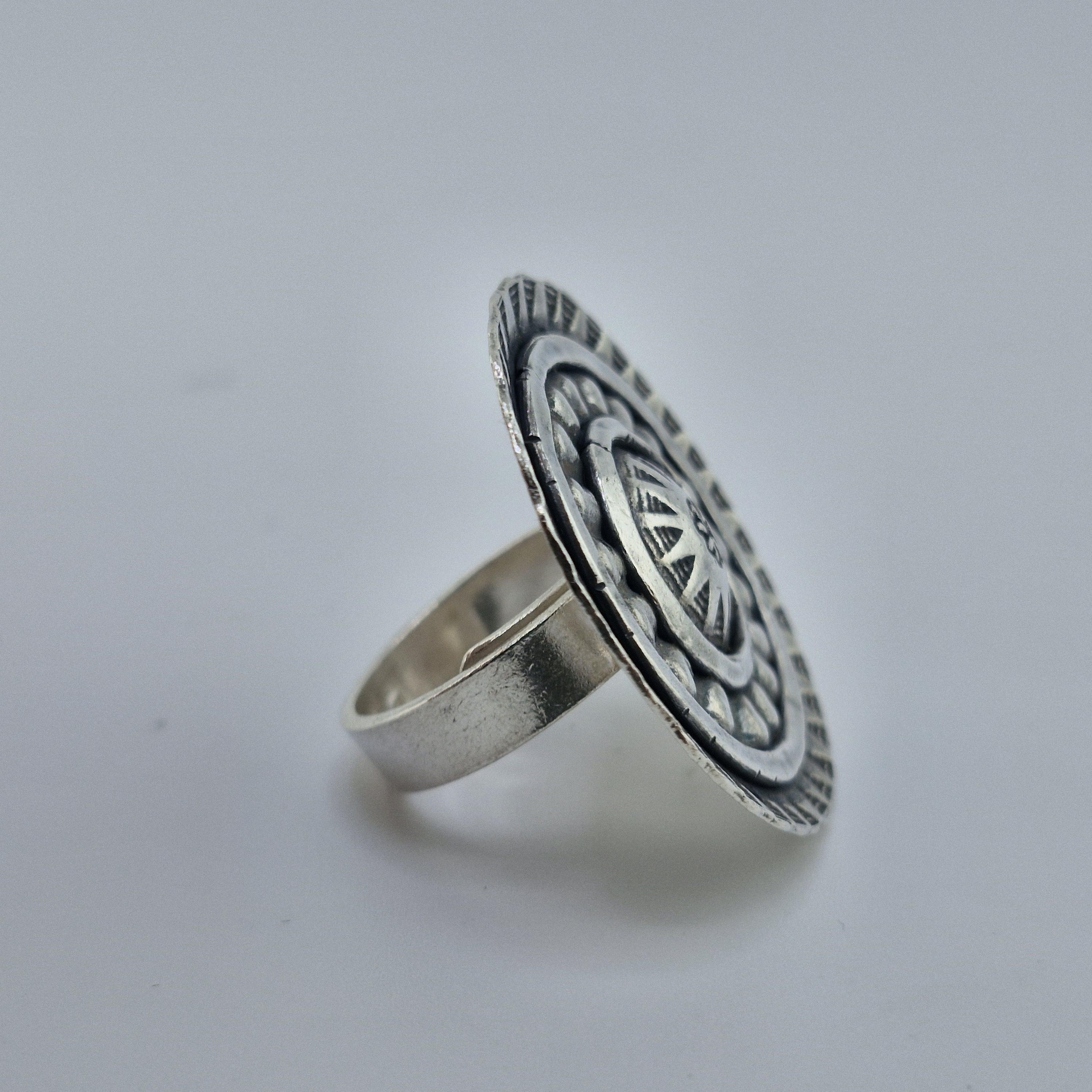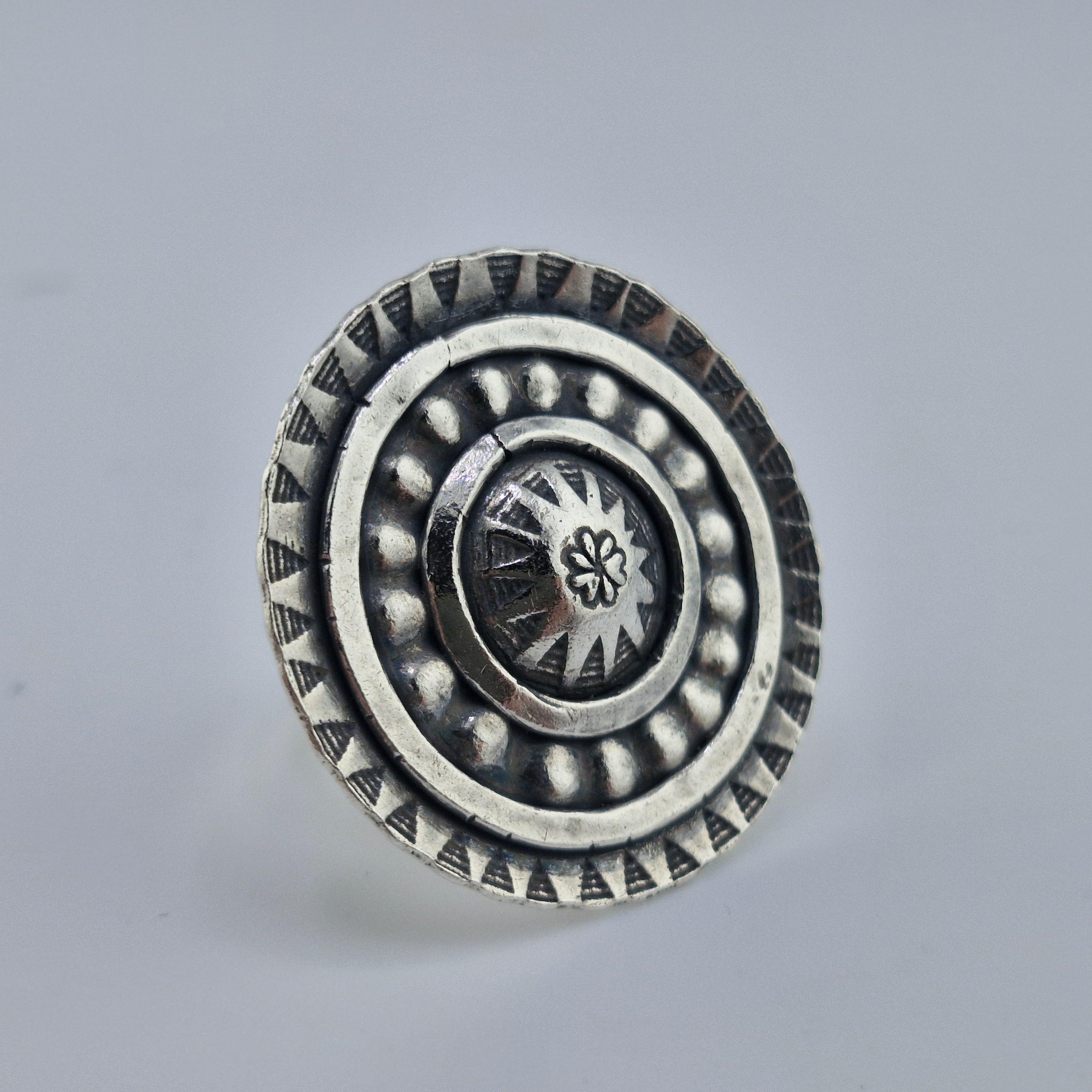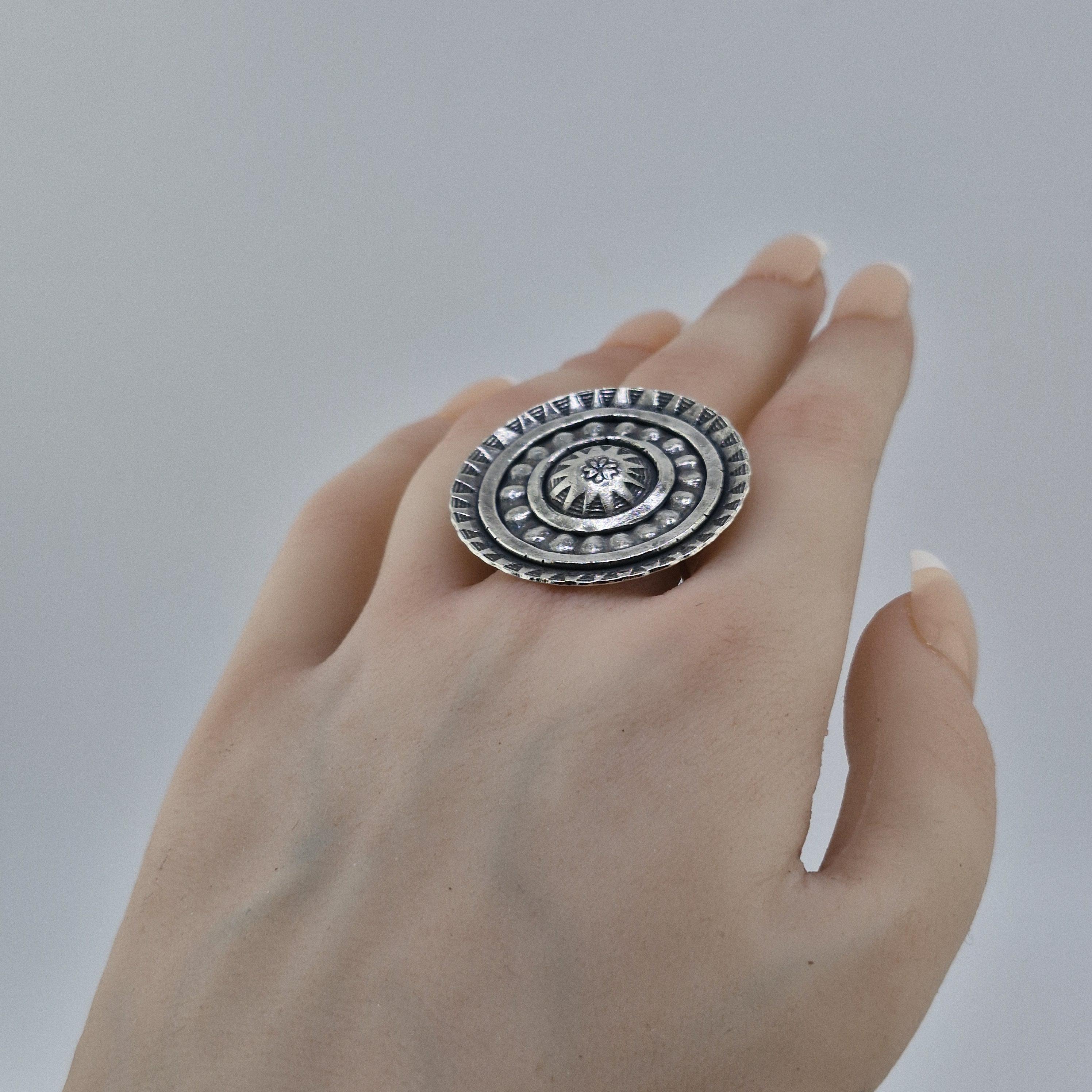 Picture yourself wandering through a sun-drenched artisan market in Ibiza or standing front-row at a desert festival as the sun sets. This Boho Circle statement ring is designed for the woman who finds beauty in the raw and the reclaimed. With its bold, concentric shield design and hand-stamped tribal motifs, it’s not just an accessory—it’s a piece of wearable armour for the modern nomad.