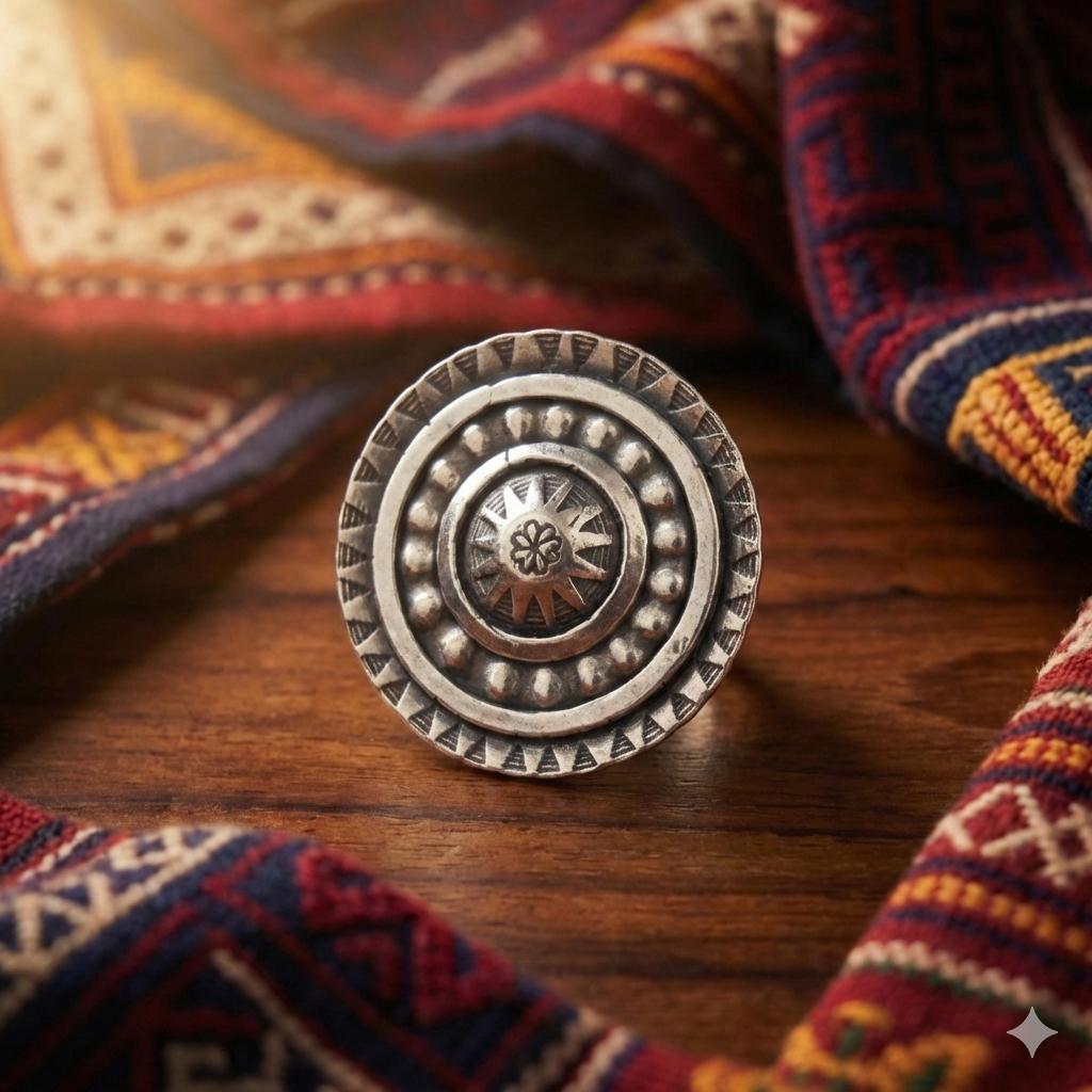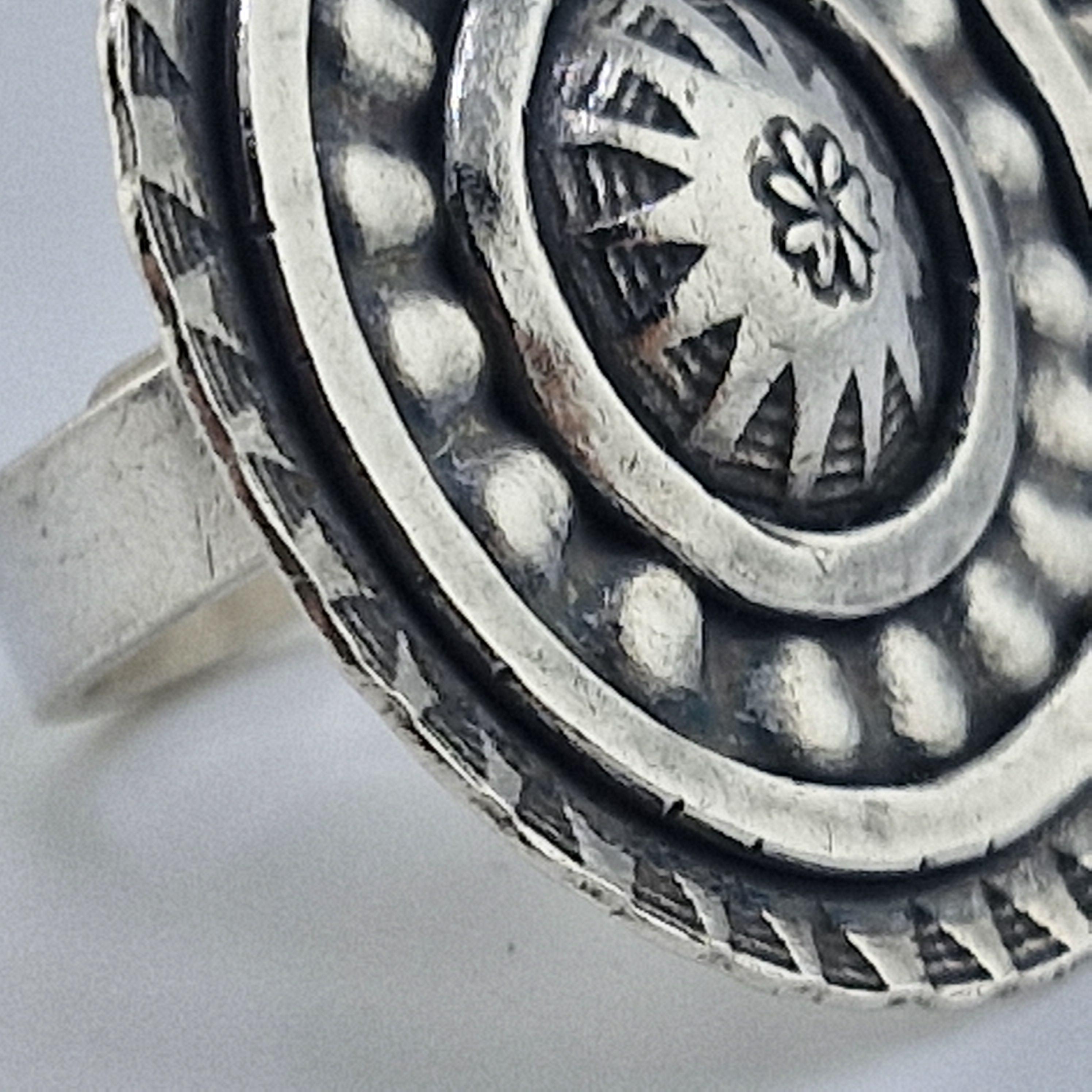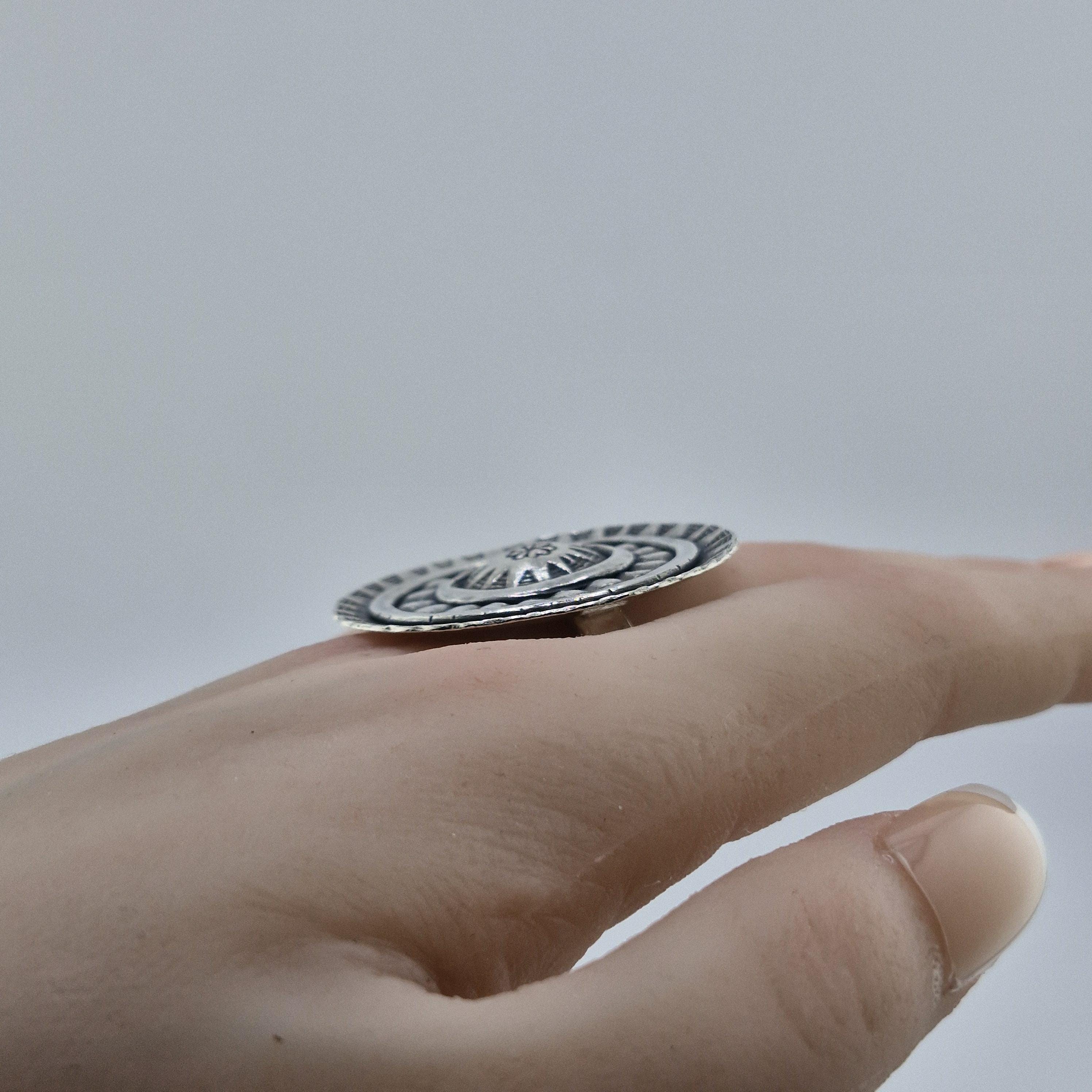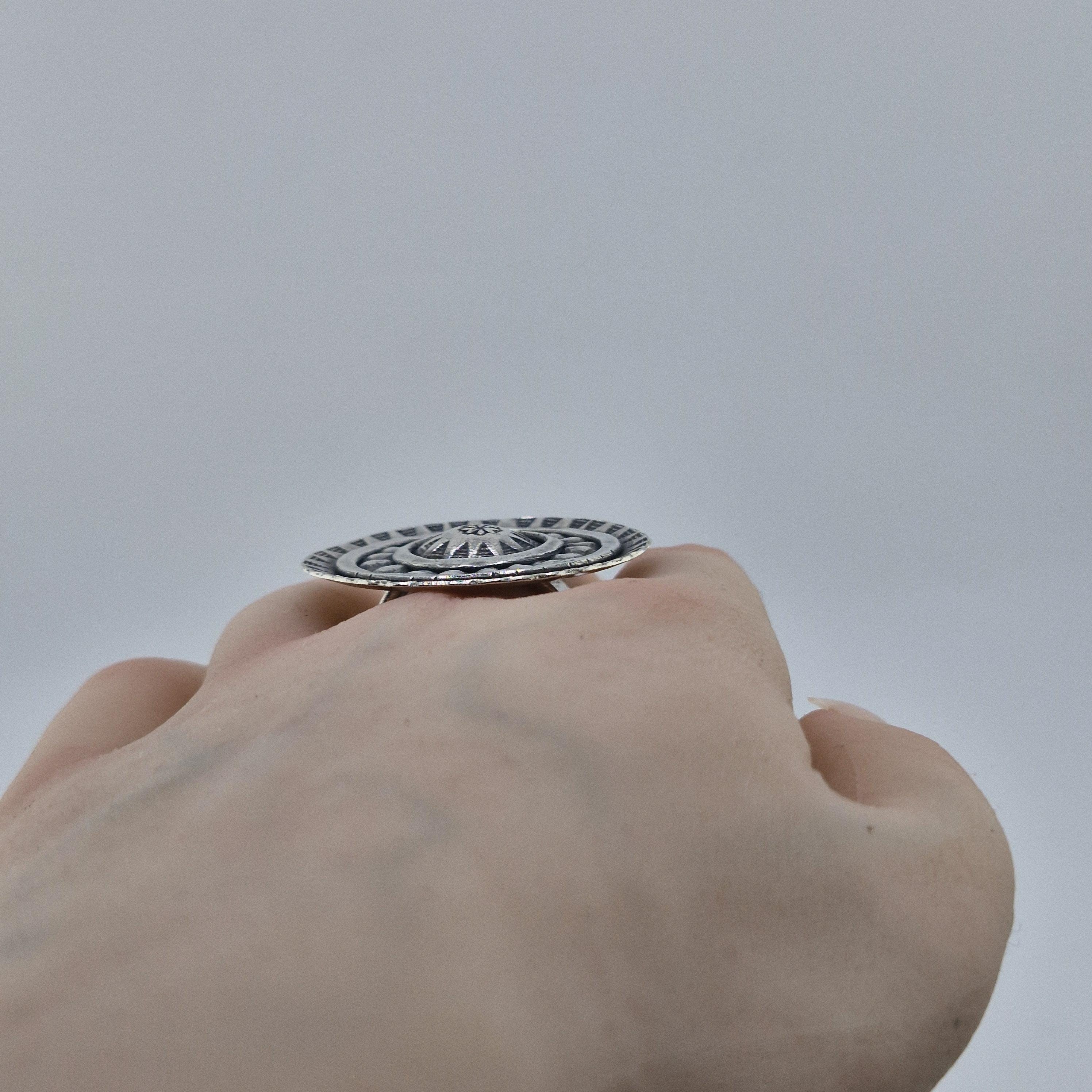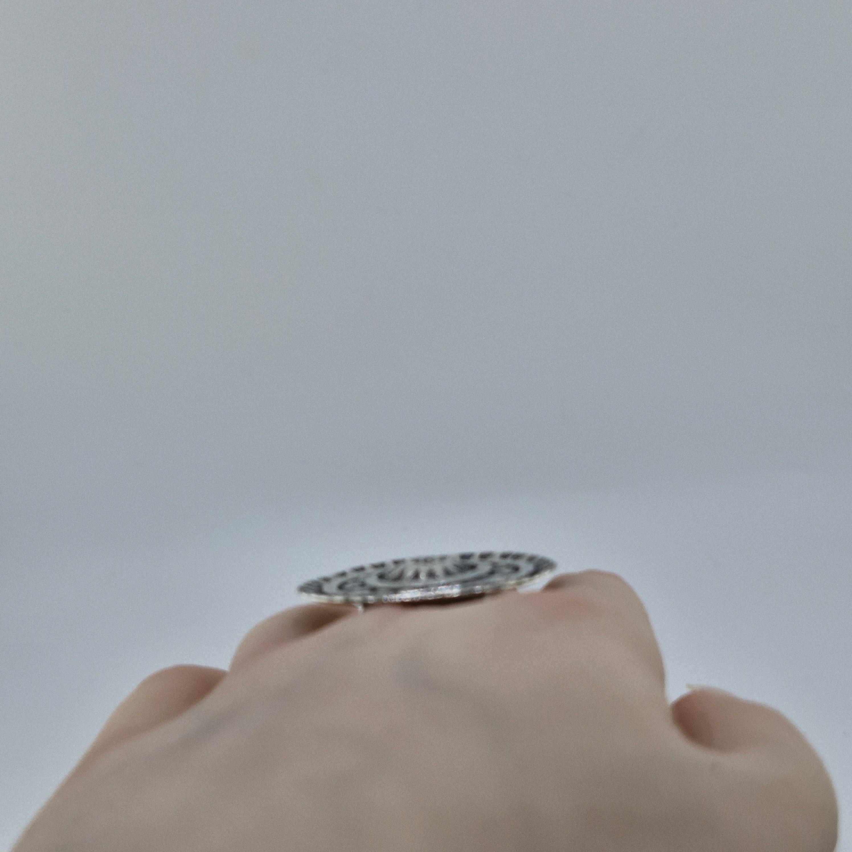 Picture yourself wandering through a sun-drenched artisan market in Ibiza or standing front-row at a desert festival as the sun sets. This Boho Circle statement ring is designed for the woman who finds beauty in the raw and the reclaimed. With its bold, concentric shield design and hand-stamped tribal motifs, it’s not just an accessory—it’s a piece of wearable armour for the modern nomad.