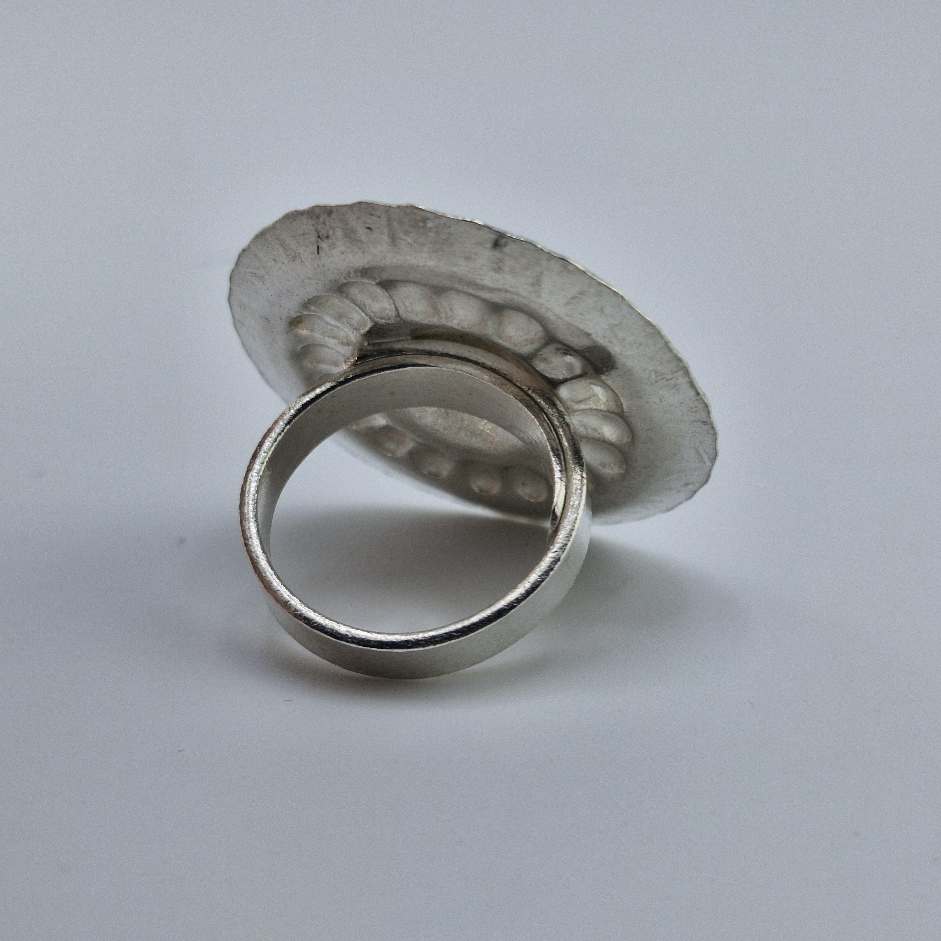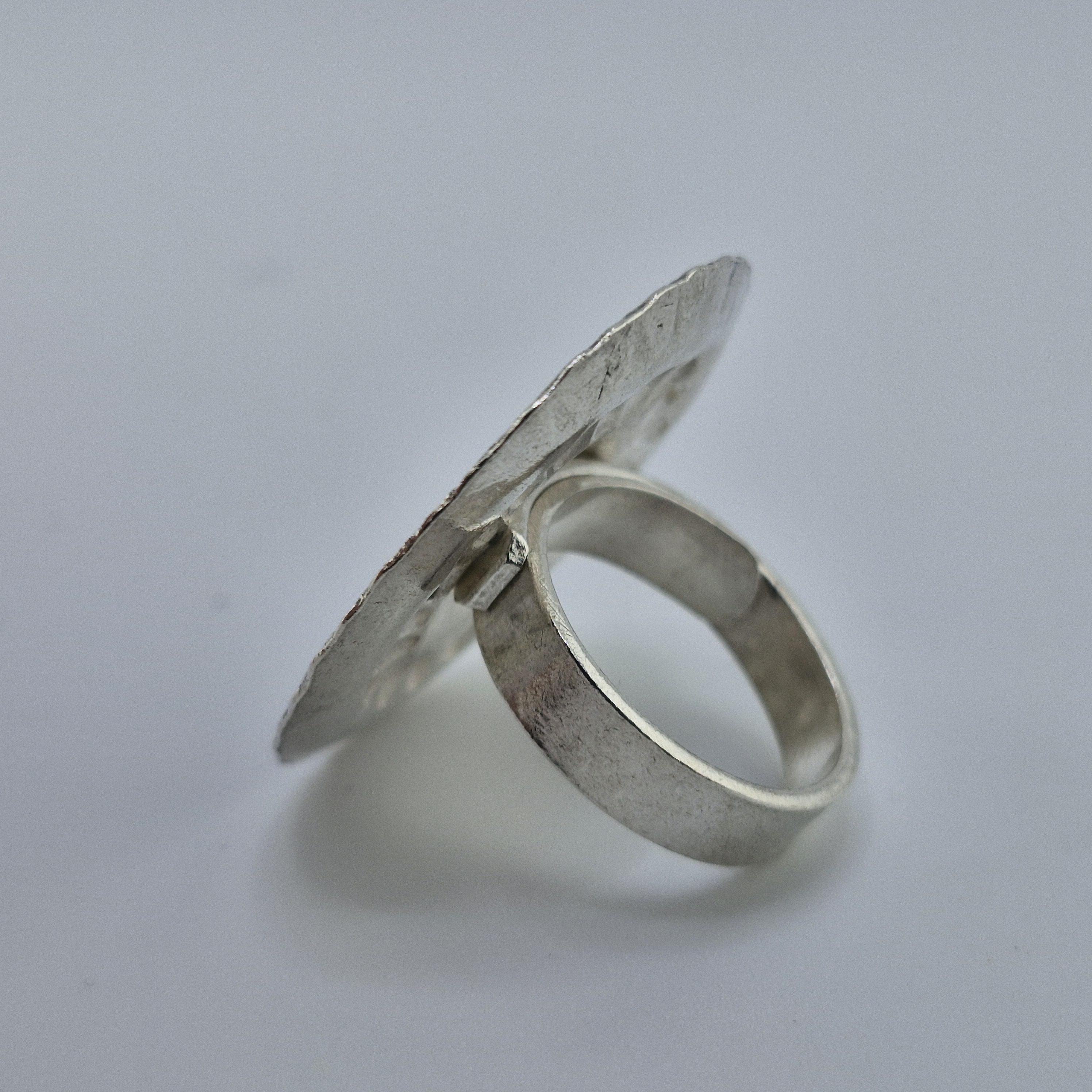 The Craftsmanship Expertly hand-forged, this piece features a lustrous white metal finish with a deep, antiqued patina that highlights every hammered detail. The weight of 13 grams gives it a satisfying, high-end feel on the finger, perfect for stacking with delicate bands or wearing alone as a conversation starter.