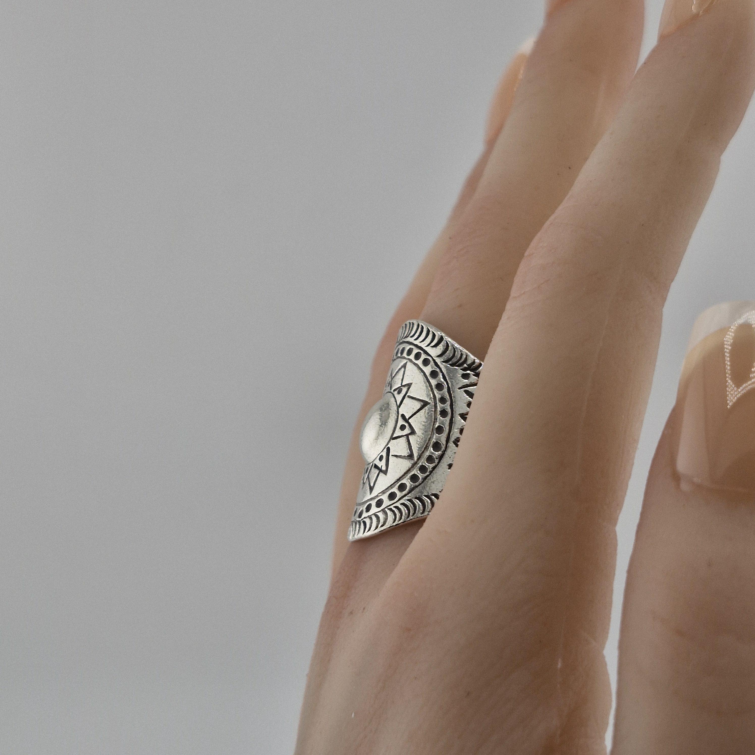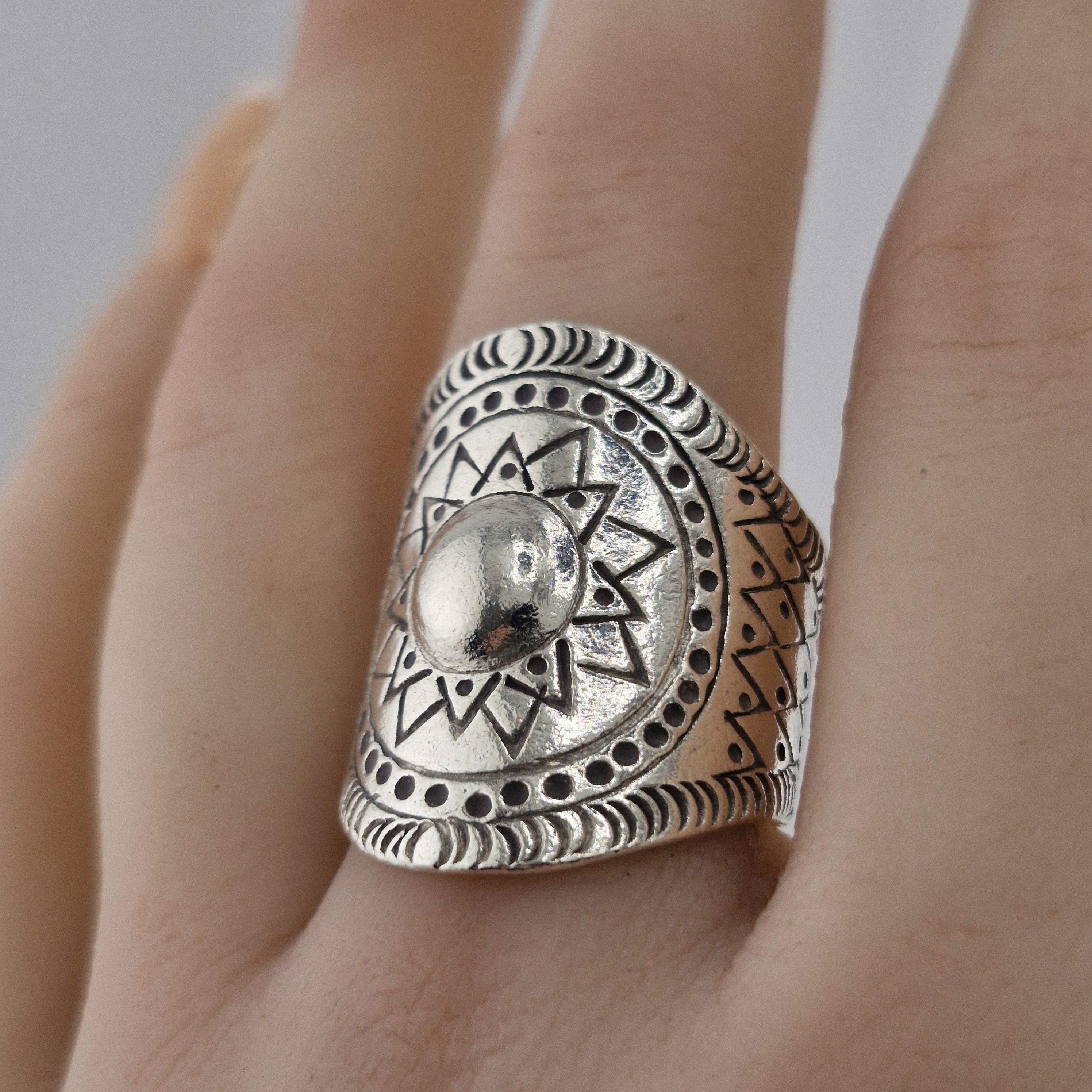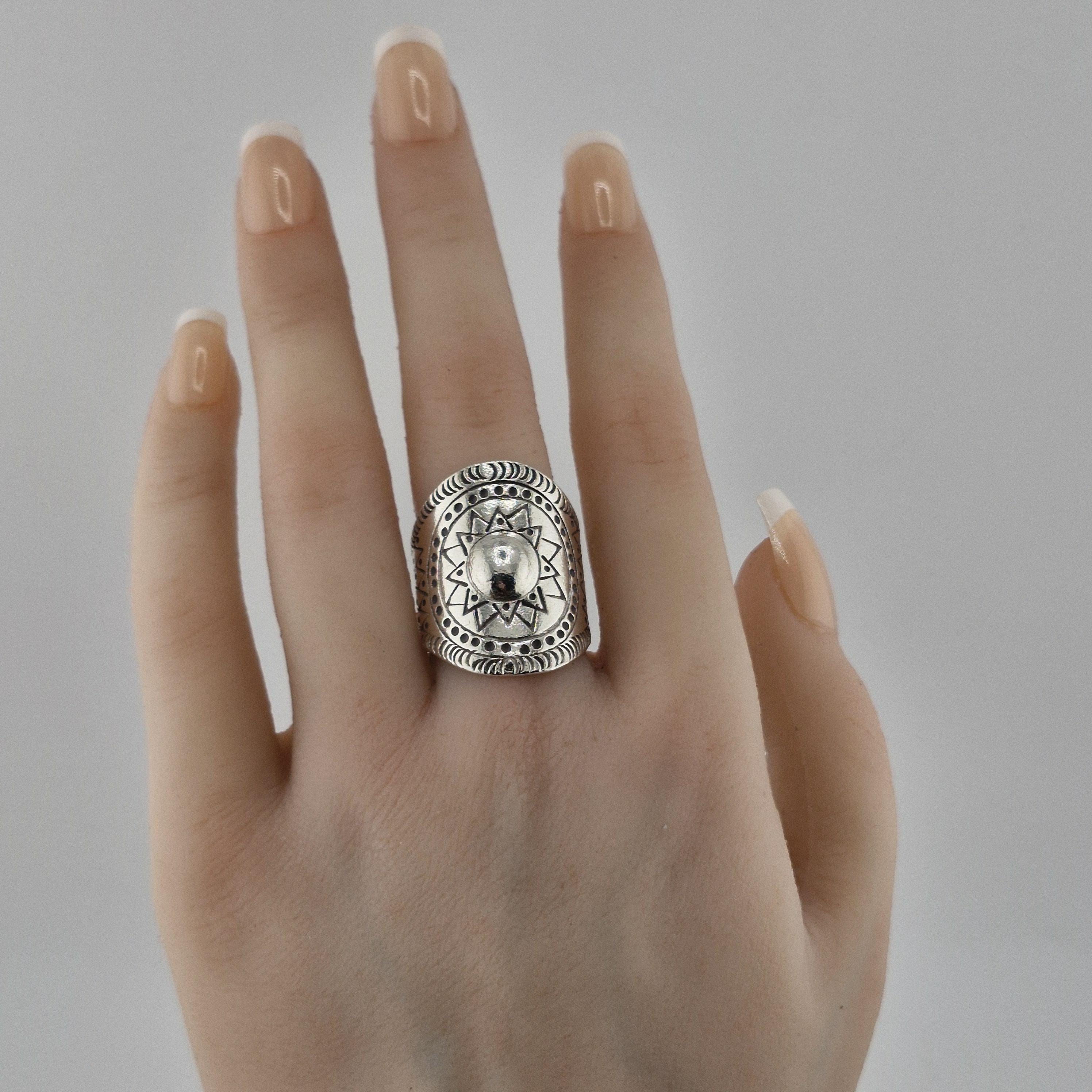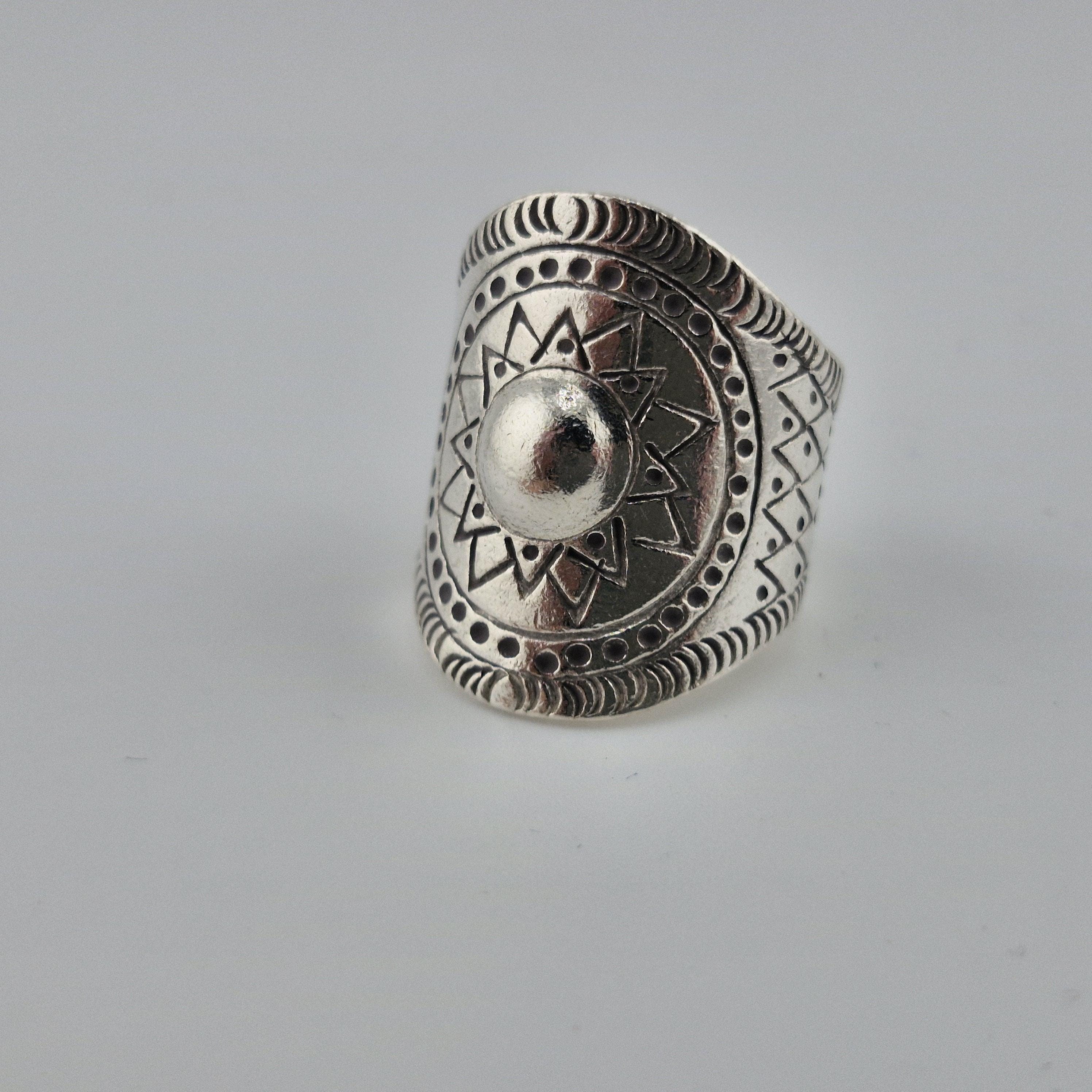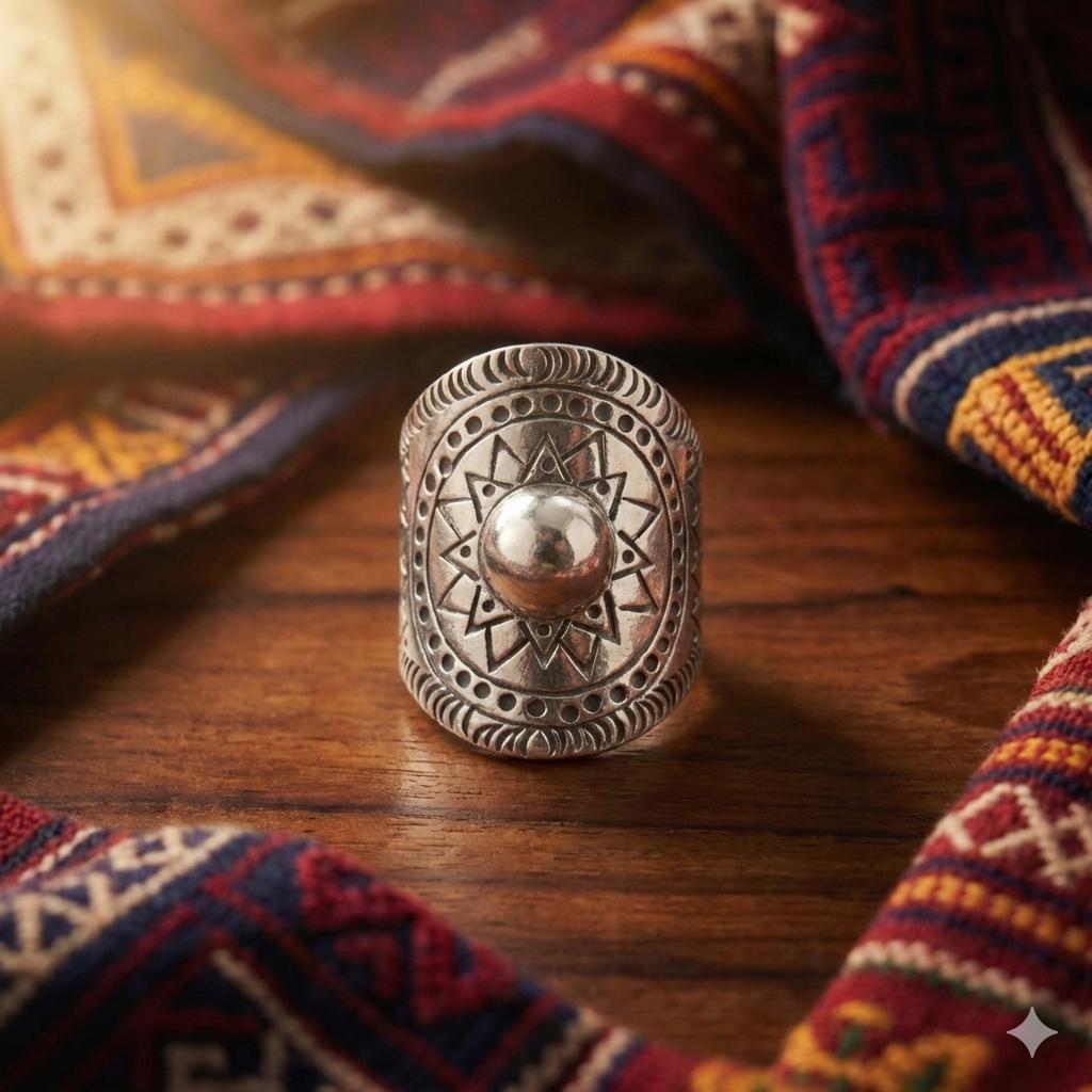 Whether you’re catching the first light at a coastal retreat or layered up for a winter festival, this hand-forged metallic statement ring is designed for the woman who carries the sun with her. Featuring a striking central dome surrounded by a meticulously carved sunburst motif, this piece is inspired by ancient tribal geometry and refined for the 2026 'Aetheric Earth' trend.